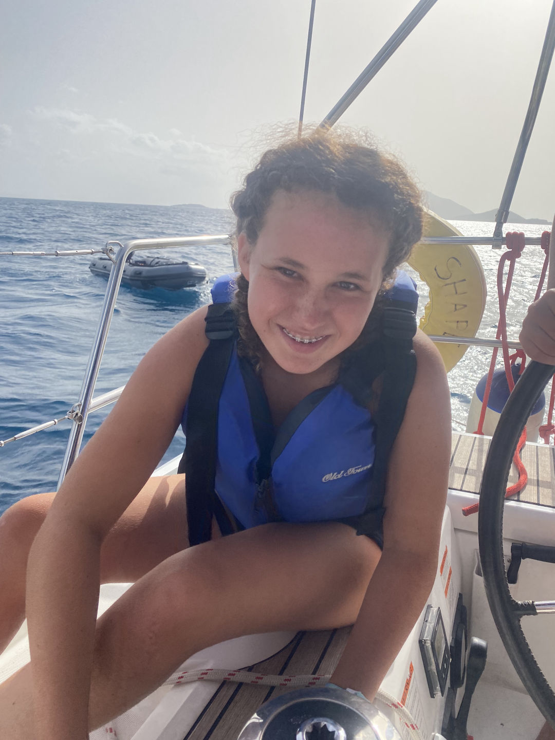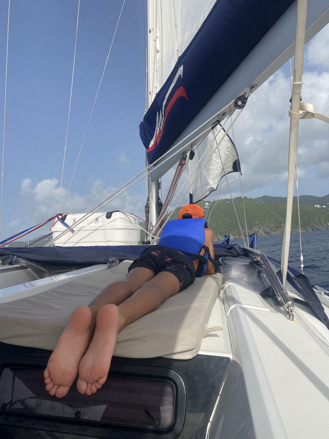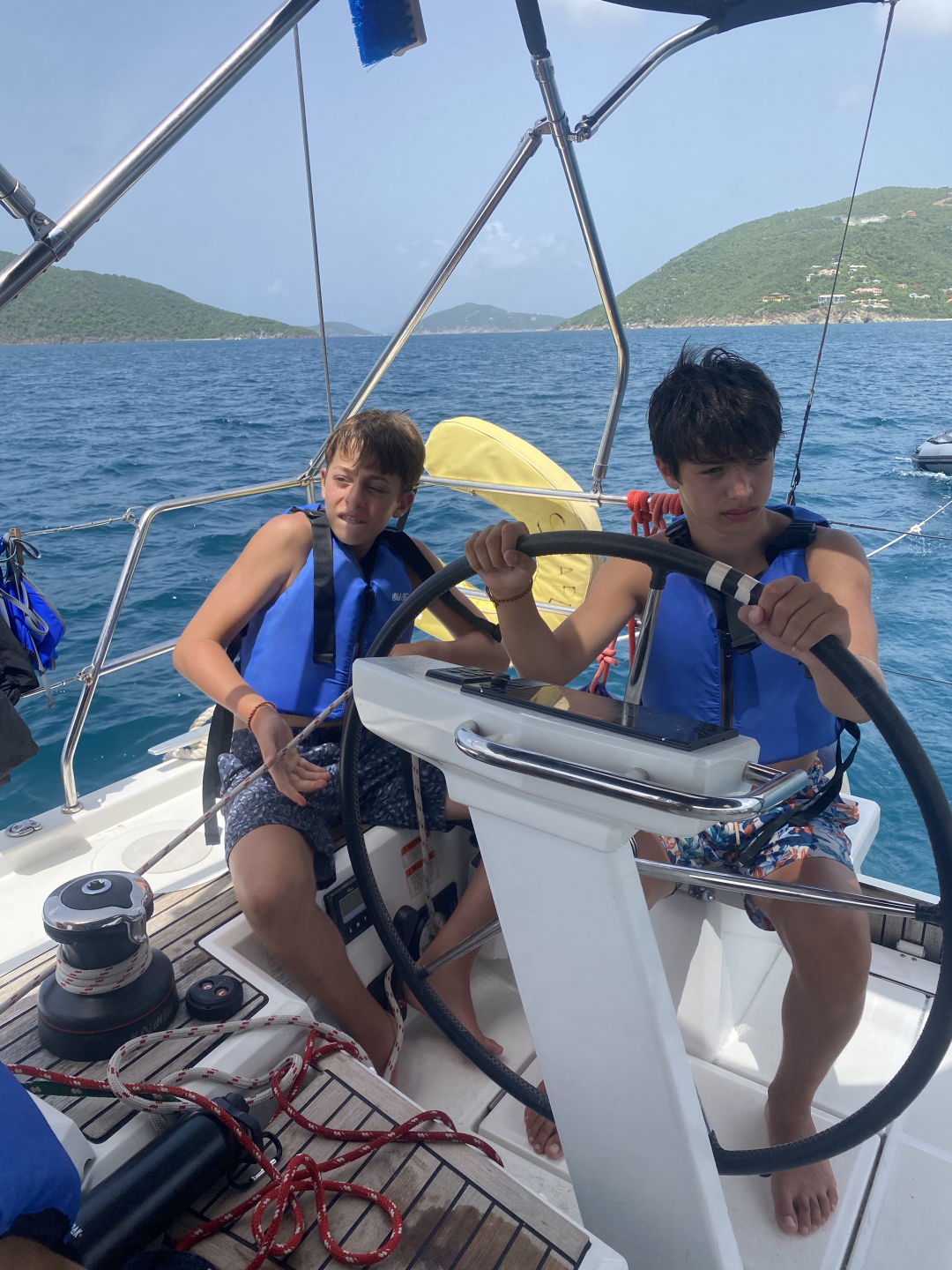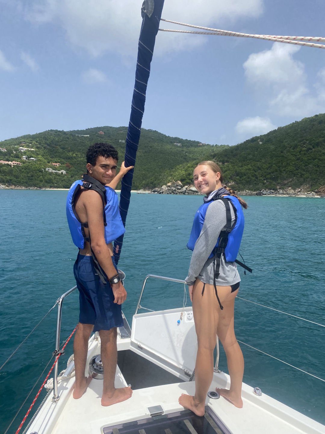After the ride back to the boat, Tait started to prepare the quesadillas for lunch, and we tied Athena to the back of the boat. You could tell the quesadillas were delicious because no crumb was left on our plates (meaning Oscar ate five and had to be cut off). Once lunch cleanup was over, Grayson took us off the anchor, and we headed to Tortola. Peyton, Mina, Constantin, and I all helmed so that we could refill our water. Once we refilled our water supply, Amelia was helming, and Peyton tried around her and took the wrong step and fell into the lifelines. Watching her lay there and laugh in pain was the highlight of my day (Peyton approved that sentence). Shortly after, we had our sail training of the day. We learned what to do if there is a man overboard. We tossed a fender (we named him Larry) and acted like he was the man overboard. After the sail training, we caught a mooring ball and ordered take-out. While we were waiting for our food, the whole boat played Mafia. All of our faces lit up once we saw Riley and Tait arrive with all the bags of food. For dinner, I had fish and chips, but others had pasta, ribs, sandwiches, or burgers. Now, the girls are about to watch Mama Mia 2 while the boys chill up on deck. These past two weeks have gone by so quickly, and I am so sad we only have seven days left!