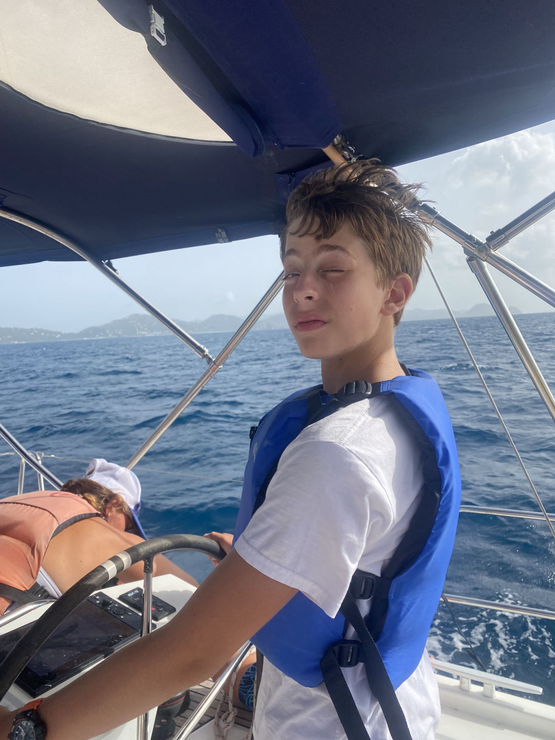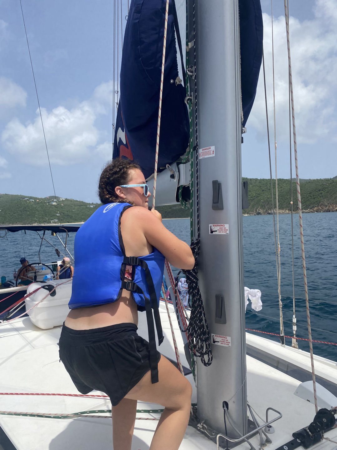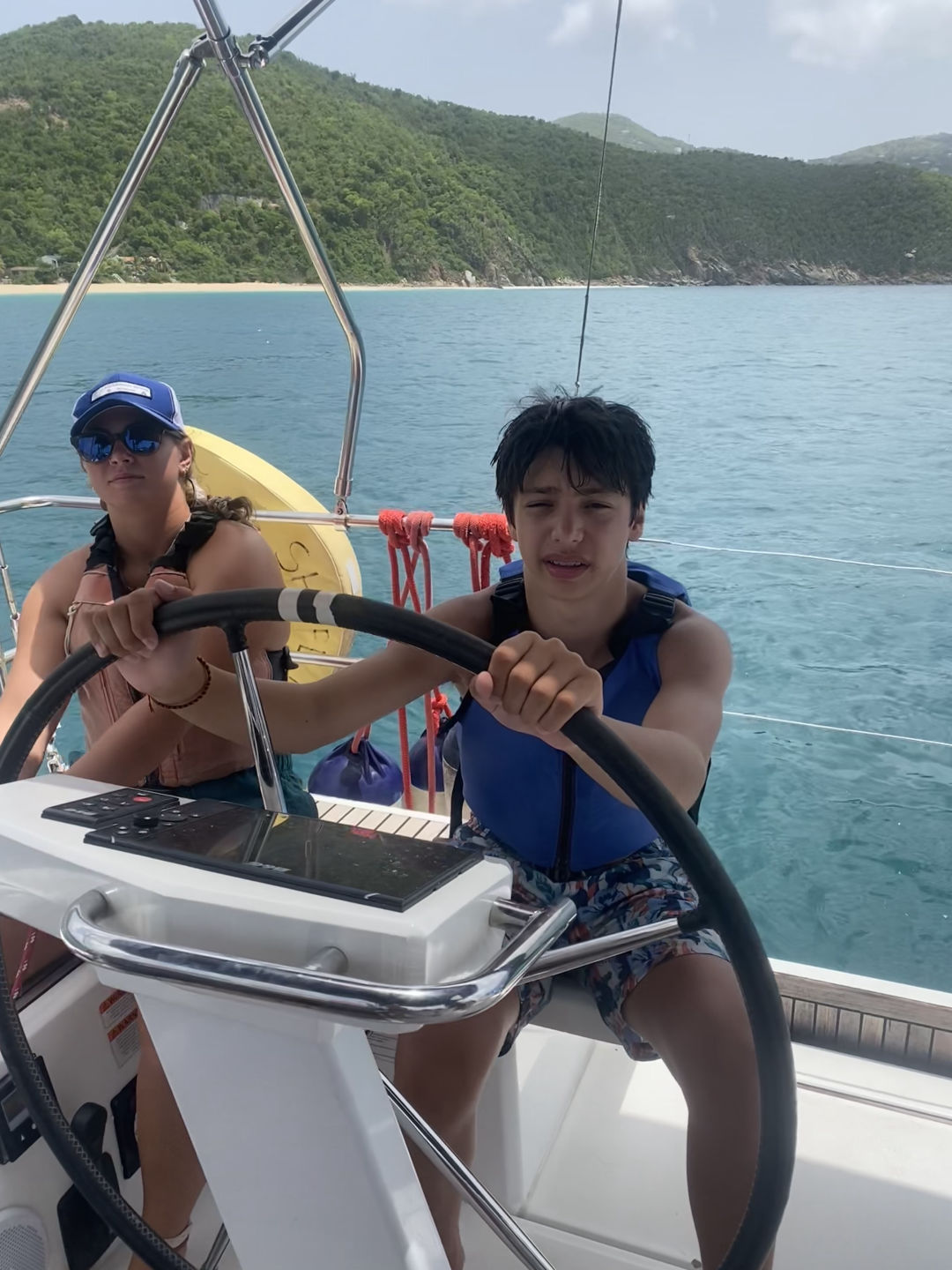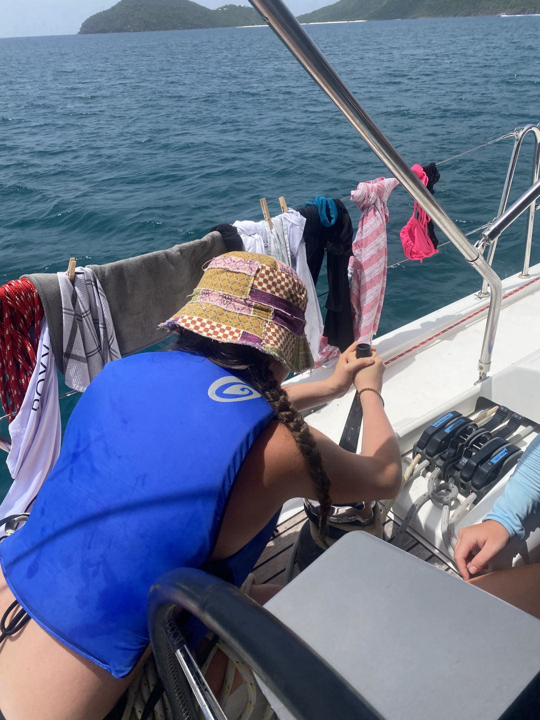 After the ride back to the boat, Tait started to prepare the quesadillas for lunch, and we tied Athena to the back of the boat. You could tell the quesadillas were delicious because no crumb was left on our plates (meaning Oscar ate five and had to be cut off). Once lunch cleanup was over, Grayson took us off the anchor, and we headed to Tortola. Peyton, Mina, Constantin, and I all helmed so that we could refill our water. Once we refilled our water supply, Amelia was helming, and Peyton tried around her and took the wrong step and fell into the lifelines. Watching her lay there and laugh in pain was the highlight of my day (Peyton approved that sentence). Shortly after, we had our sail training of the day. We learned what to do if there is a man overboard. We tossed a fender (we named him Larry) and acted like he was the man overboard. After the sail training, we caught a mooring ball and ordered take-out. While we were waiting for our food, the whole boat played Mafia. All of our faces lit up once we saw Riley and Tait arrive with all the bags of food. For dinner, I had fish and chips, but others had pasta, ribs, sandwiches, or burgers. Now, the girls are about to watch Mama Mia 2 while the boys chill up on deck. These past two weeks have gone by so quickly, and I am so sad we only have seven days left!