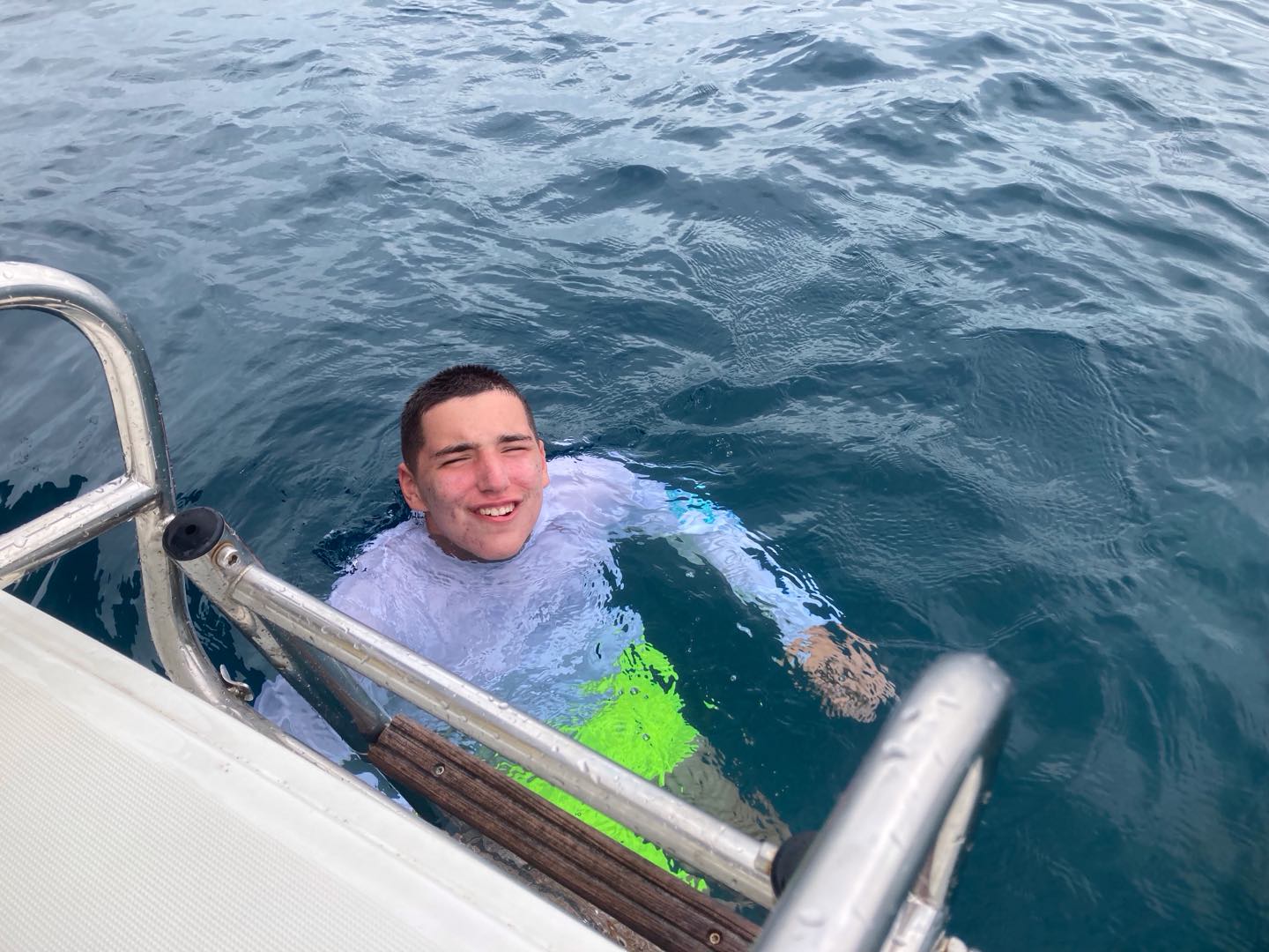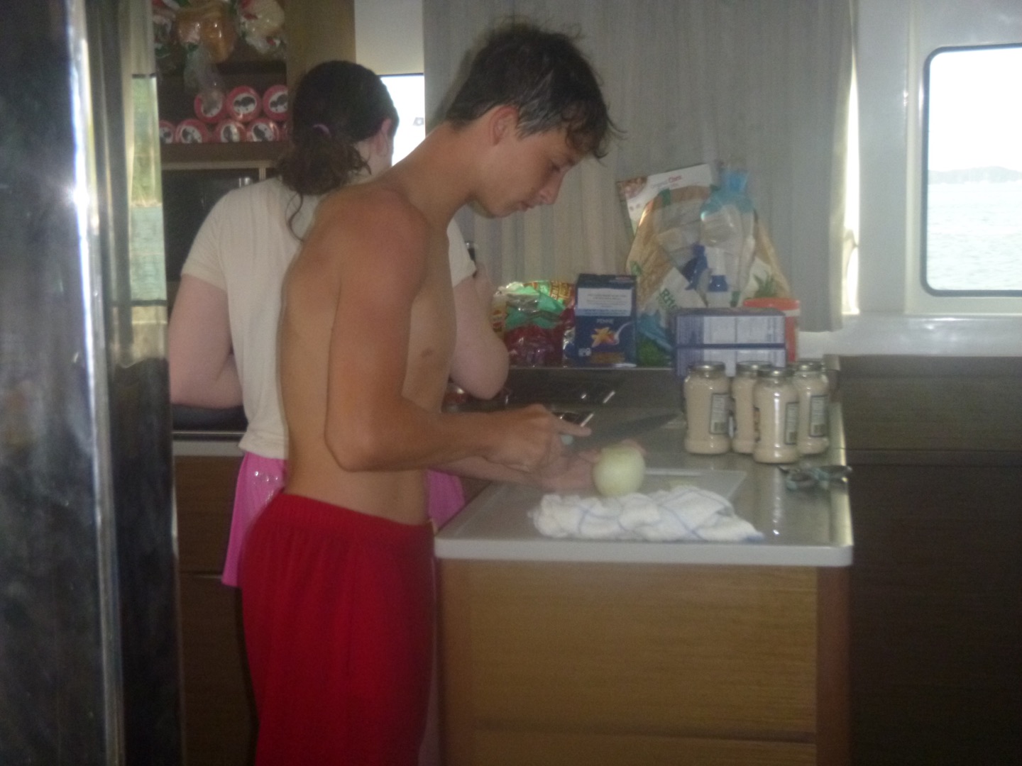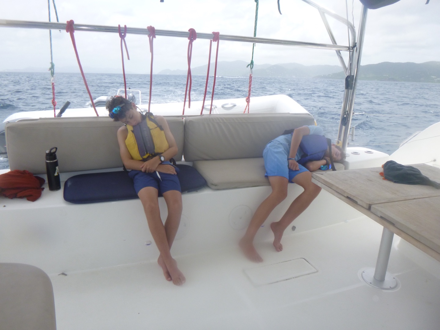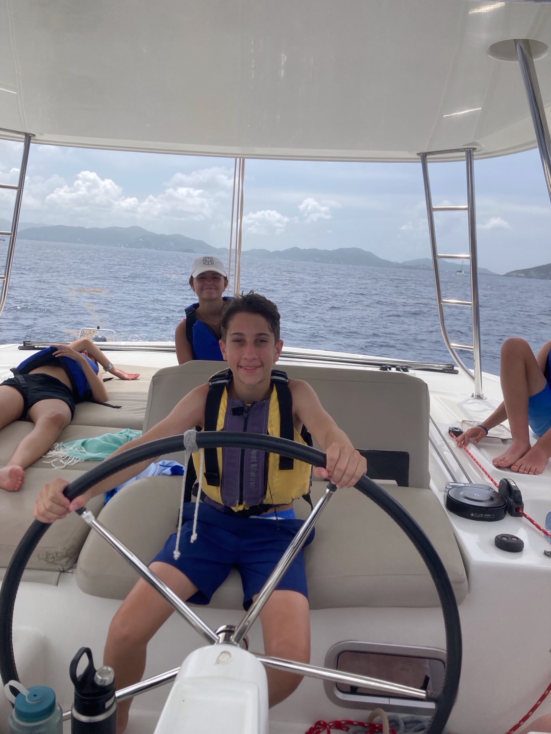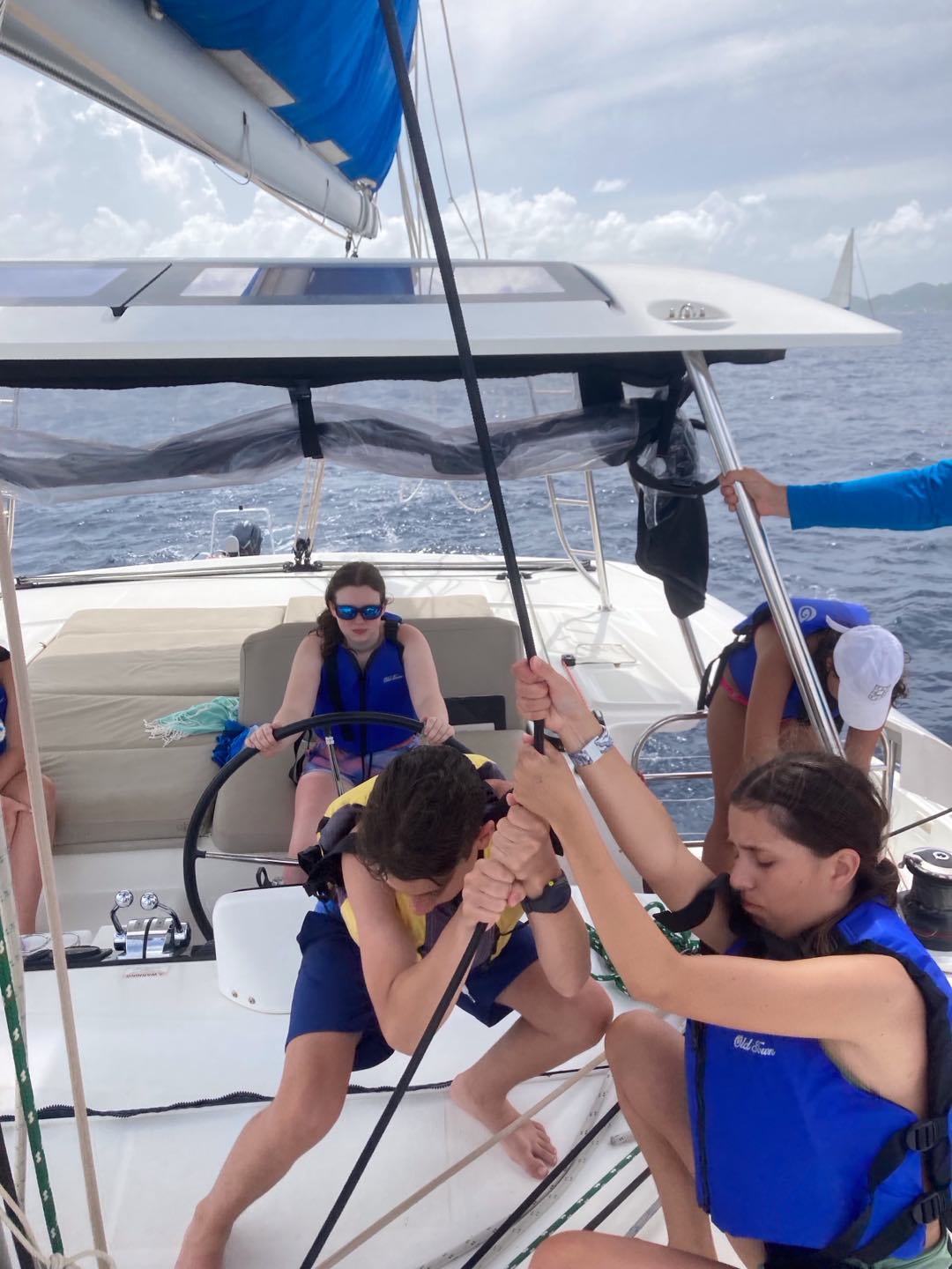 This morning, we woke up to clouds and wind, and could immediately tell it was going to be rough waters today. Despite that, we continued to have a delicious breakfast of scrambled eggs, blueberry muffins, and pineapple. Afterwards, we were suppose to start our six hour sail to Savannah Bay, but Eli and Cameron were begging to jump into the ocean. So, we all hopped in after our staff members gave us permission to. Ellory had to give Vaughn a little encouragement to take a quick morning swim. After that, we began our sail towards the bay. Our instructors split us into two groups, one who would sail first and the other who would take diving quizzes first. I, Breckyn, took the quizzes first, which was based on our studies from the night before. Everyone aced them, thankfully. We had a quick break after the test, where I shared pop corn with Ellory and Sloane on the trampoline. During this time, the waters were quite rough, and unfortunately, a few kids got sea sick. The groups switched, and we were sailing. Cameron and I were ‘sweating’, which is when you pull the line to raise the sail. Ellory was steering the helm and winching, while Magnus was pulling the slack. We were halfway to Savannah Bay when we decided to take a lunch break at Cooper Island. When we were done eating sandwiches, we hopped in the water again. Chase, Amy, Jada, Sloane, and Emily were trying to figure out ways to scare the boys in the water, but none of them worked out. Not long after we set sail again, but while on the rough waters, our sail got tangled in the lazy jacks. Our amazing instructors fixed it after a bit. We continued to sail, but I’ll be honest, I don’t know what happened the last hour of sailing because I took a nap on the bridge, which is behind the helm. Although, I heard Finn was sharing tic tacs with everyone. Once we reached Savannah Bay, we anchored and started dinner. We had Alfredo pasta with sliced hot dogs and garlic bread. Eli started throwing food up into the air, which lead us to feeding and attracting seagulls. While doing this, our directors, Jake and Mike, boat pulled in. We yelled their names, and they made a sharp turn on their monohull to pass our boat. We started throwing food to them, and they tried to catch it, but the seagulls were getting it first. Once they left, we cleaned up for the night and began our diving studies.