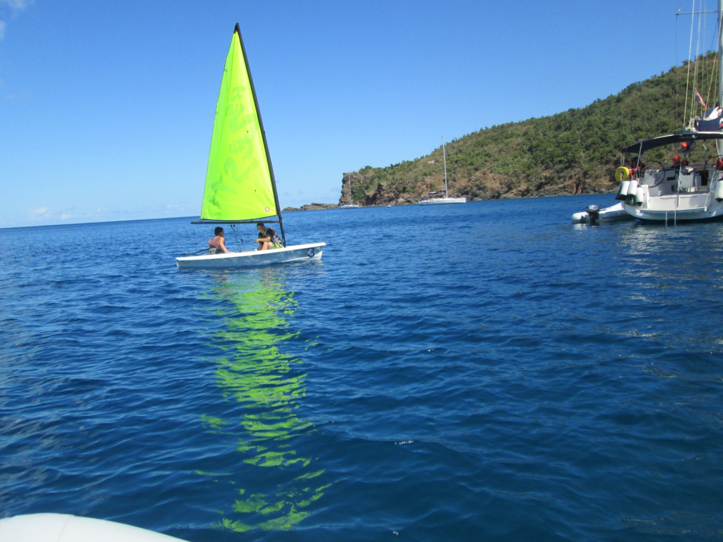 Today we had a fun and relaxing day between Muskmelon Bay and Sandy Spit. Firstly we had a later (!!) wake up at 7:15 am, followed by a delicious French toast breakfast prepared by Kaylee, Ginger, and Kara. After we scarfed down breakfast, 3 duos took a sail on the Zests, soon competing in a race around another AQ boat. Although Ben and Kara won the race, McKenna and I came out on top as the best pirates, for we managed to pick up 8 chicklets, barely edging out Max and Dylan’s seven chicklets. For lunch, Ginger and Kara prepared some mac and cheese. Following lunch, McKenna and I sat under the shade of the jib as Jessie took the helm. To the end of our trip, Sophie pulled the jib back in and helped anchor the boat. Once we arrived at Sandy Spit, a beautiful sandbar about an hour from Muskmelon Bay. The amazing day ended with an incredible BBQ on Sandy Spit with the other AQ boats! Overall, it was a pretty perfect day!