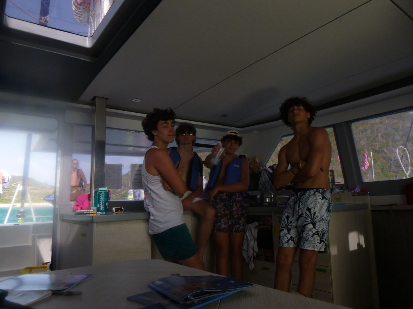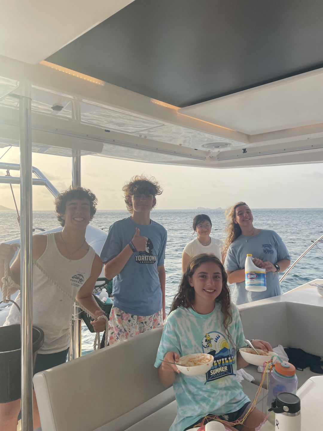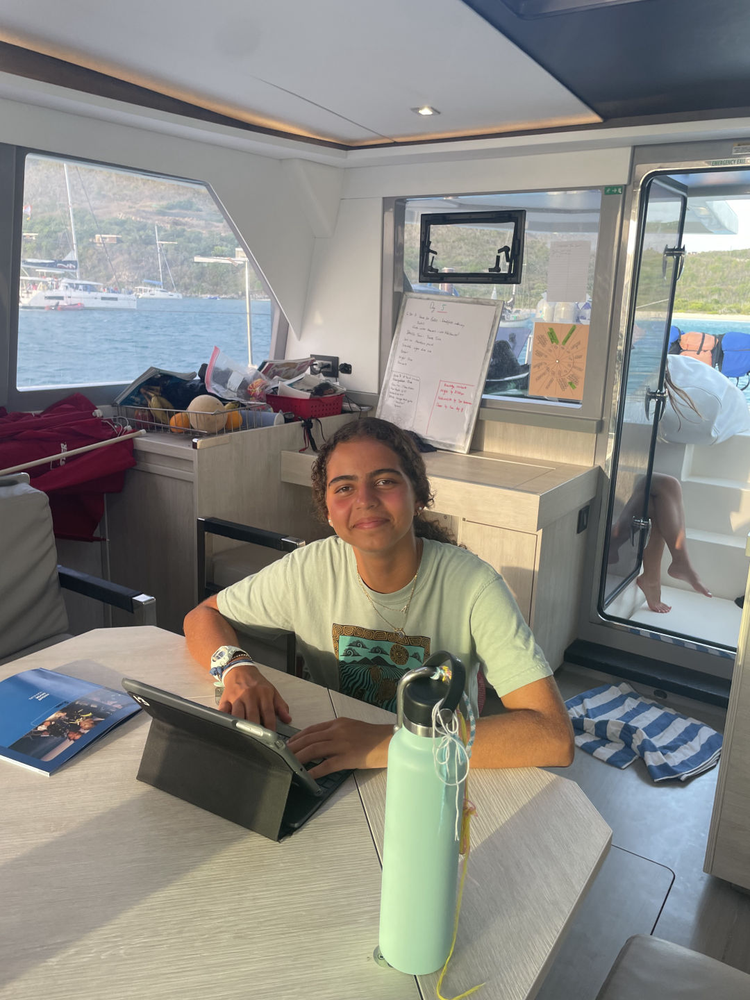 We started the day by eating breakfast, which was some tasty scrambled eggs with blueberry muffins and fruits brought to the table by Camille. We then took dinghies to the beach to practice using our compass skills before the actual dive. Rina, Sasha, and Eleanor were practicing making heading north and coming back to the same spot. After we all practiced and felt comfortable using the compass, we got to spend some chill time on the beach with the other Neptune boat called Good Times. We got back to the boat, and some of us stayed swimming by the boat, and the other half went water sporting in the dinghy with Katie. After that, we started setting up our gear to go scuba diving. Then we sailed over to Sand Circles to do our navigation dive. We ate underway, and we had some chicken salad sandwiches made by Cici with the help of the chefs who are Owen and Sophia. We separated ourselves into groups; Katie’s group was Beckett, Alivia, Rina, Sasha, Ellie, and me. Hugh, Camille, Sophia, Eric, Gabe, and Owen were in Gene’s group, while Cici stayed on the surface looking out. We all passed the navigation dive! We sailed back to Savannah Bay, where we ate chili with rice and later went through our night diver Knowledge review.