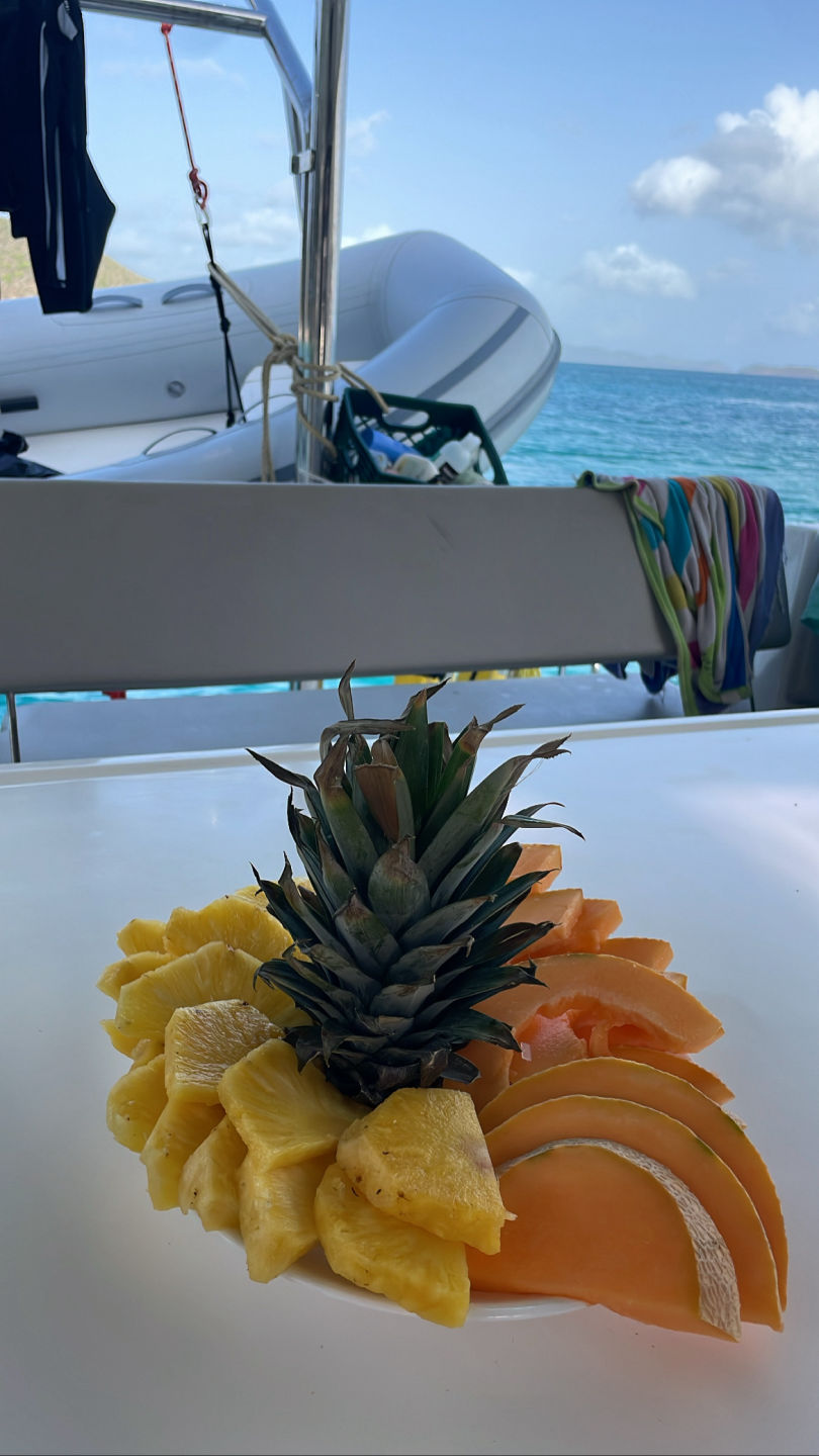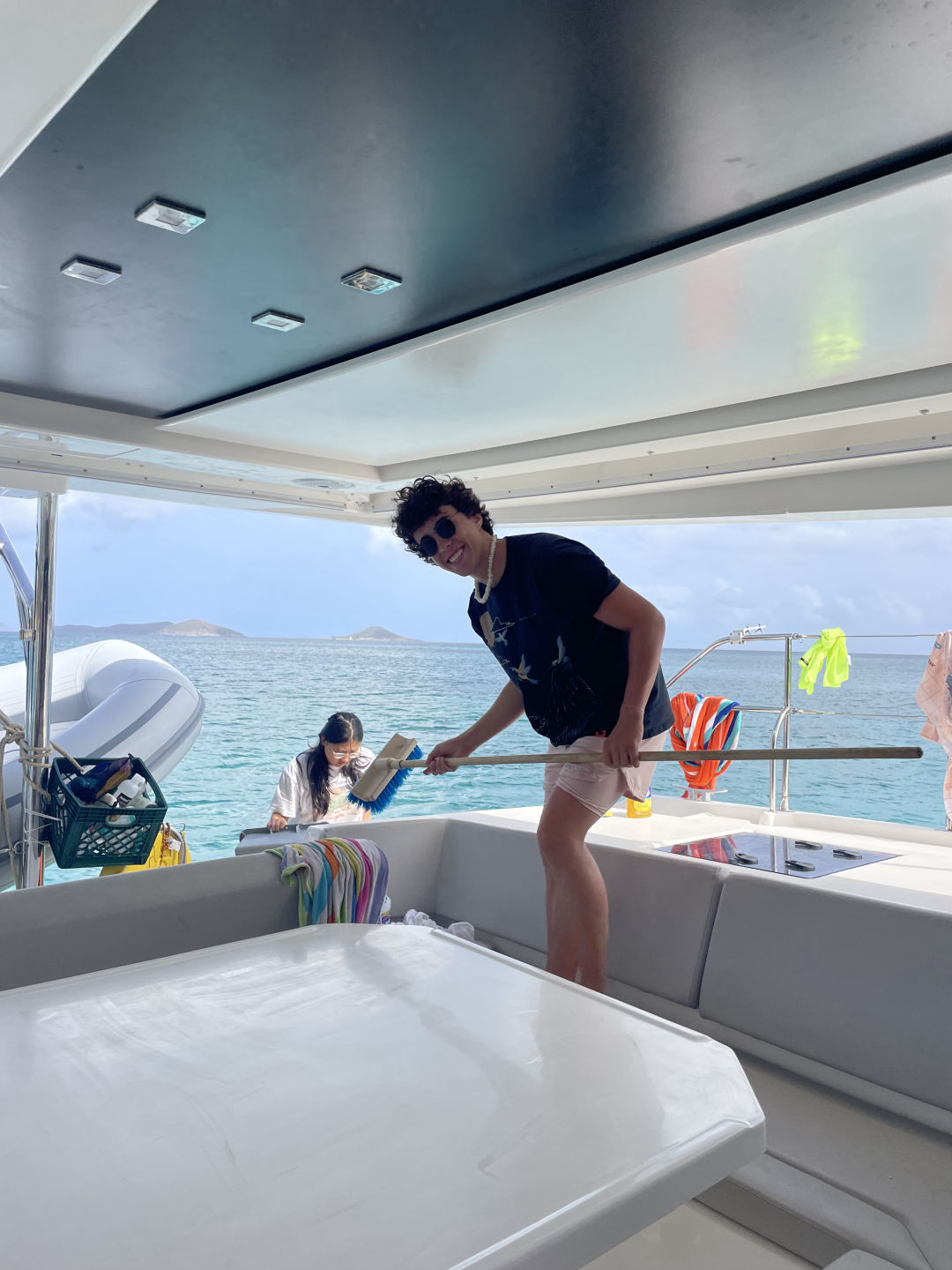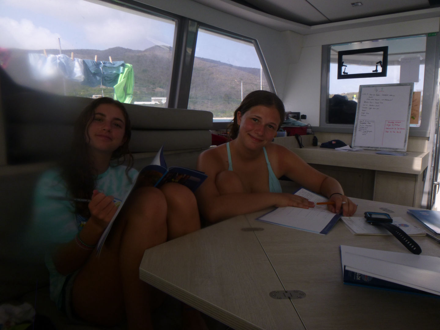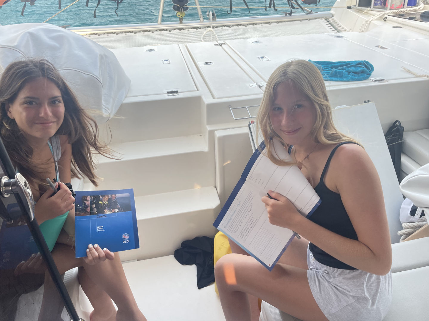 We started the day by eating breakfast, which was some tasty scrambled eggs with blueberry muffins and fruits brought to the table by Camille. We then took dinghies to the beach to practice using our compass skills before the actual dive. Rina, Sasha, and Eleanor were practicing making heading north and coming back to the same spot. After we all practiced and felt comfortable using the compass, we got to spend some chill time on the beach with the other Neptune boat called Good Times. We got back to the boat, and some of us stayed swimming by the boat, and the other half went water sporting in the dinghy with Katie. After that, we started setting up our gear to go scuba diving. Then we sailed over to Sand Circles to do our navigation dive. We ate underway, and we had some chicken salad sandwiches made by Cici with the help of the chefs who are Owen and Sophia. We separated ourselves into groups; Katie’s group was Beckett, Alivia, Rina, Sasha, Ellie, and me. Hugh, Camille, Sophia, Eric, Gabe, and Owen were in Gene’s group, while Cici stayed on the surface looking out. We all passed the navigation dive! We sailed back to Savannah Bay, where we ate chili with rice and later went through our night diver Knowledge review.