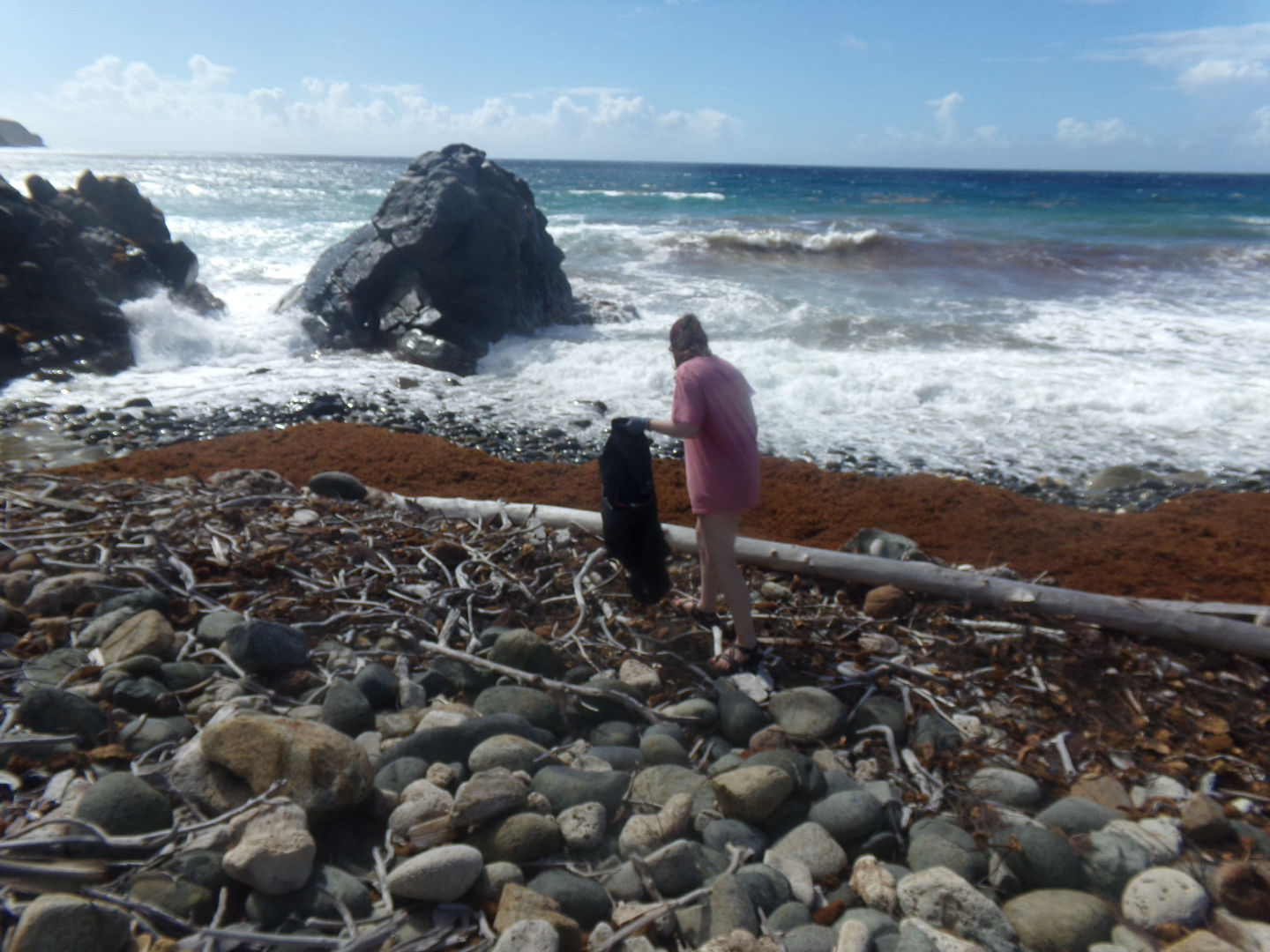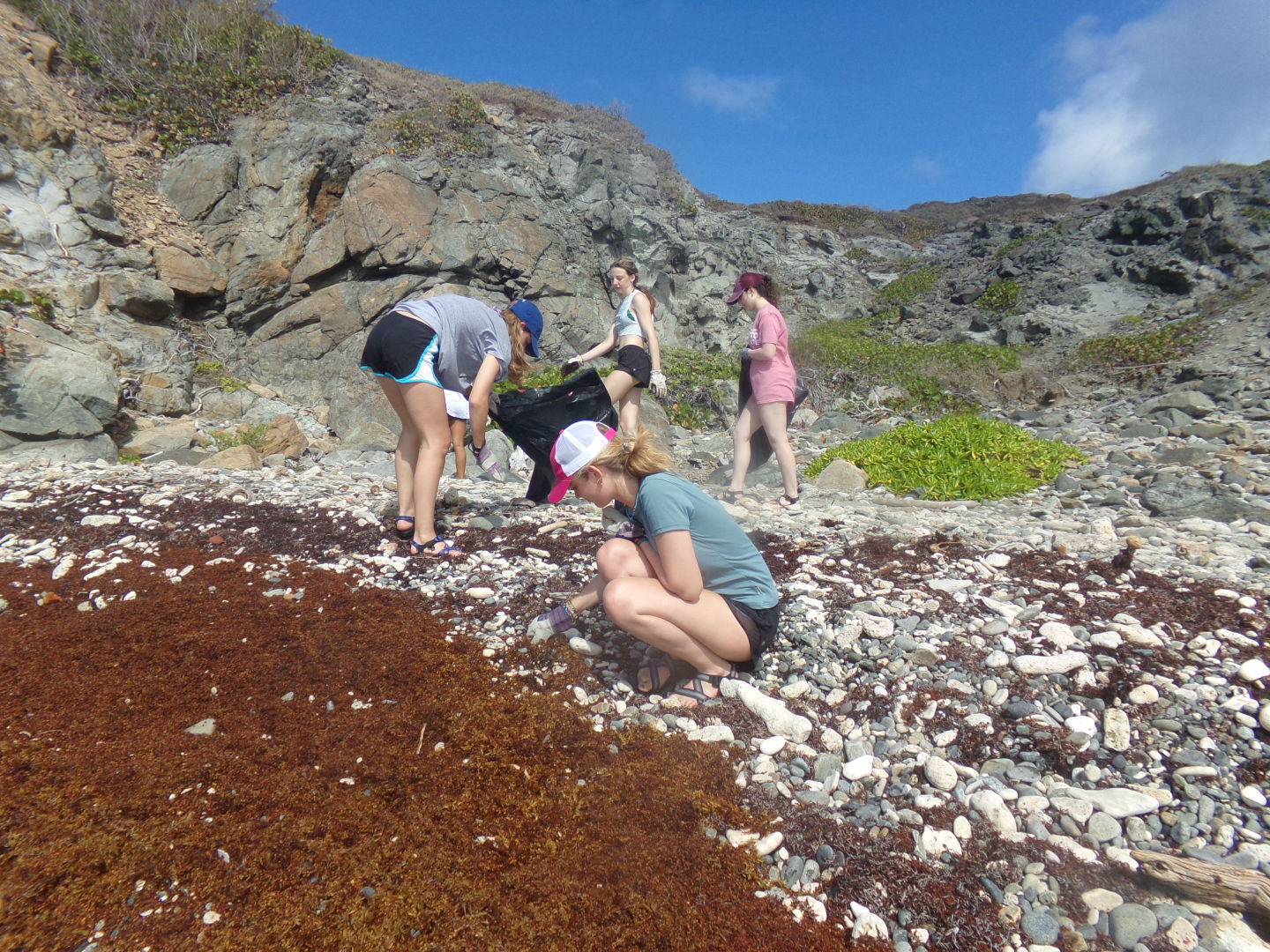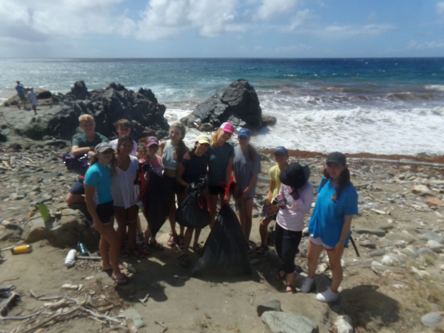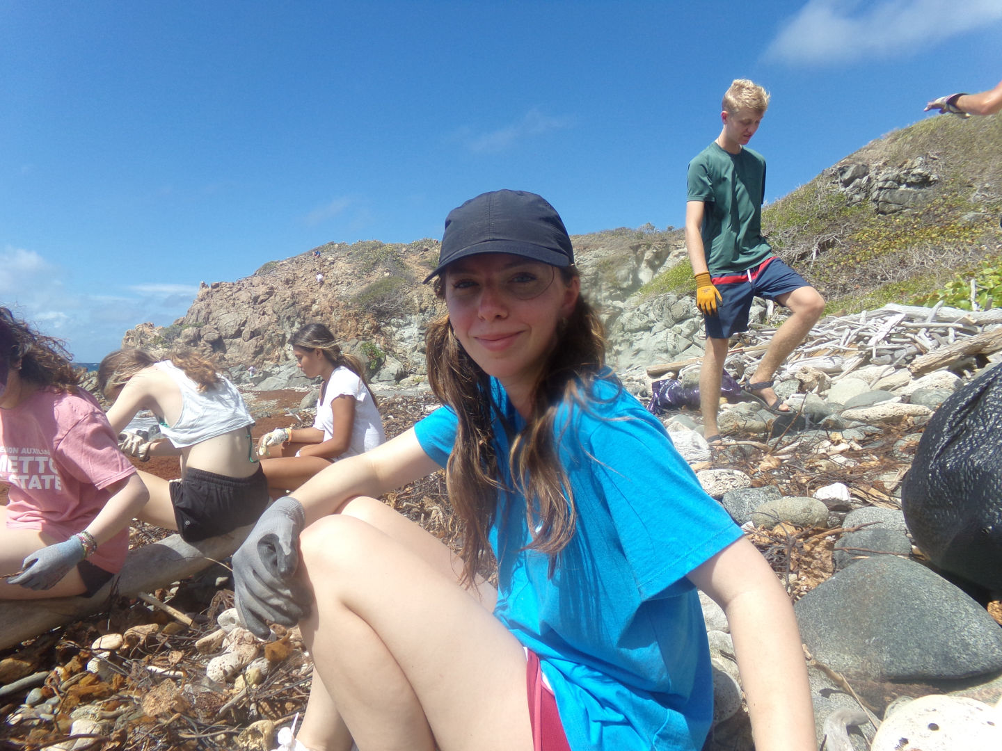 We got dressed for the day, and we started off by picking up trash on the beach. We took the dingy over to Savanna Bay and saw the prettiest water. There was no trash at all on the beach; however, when we walked over to the windward side of the beach, there was an incredible amount of trash everywhere. We walked up a little bit of a hill and found a tarp and so much more plastic. It felt really good to be able to help the ocean and the wildlife around.