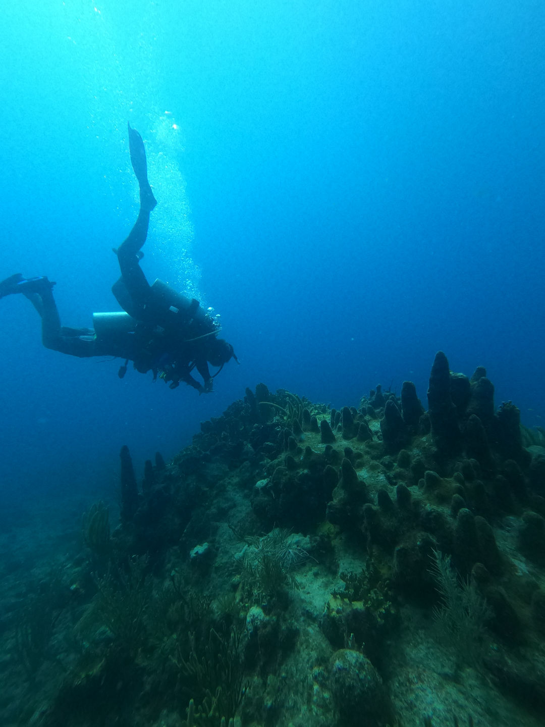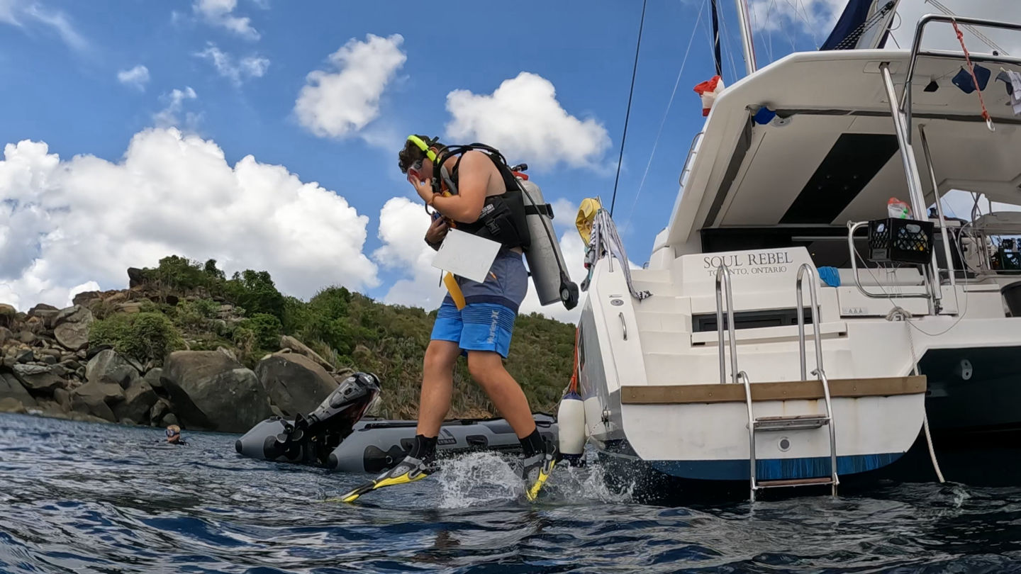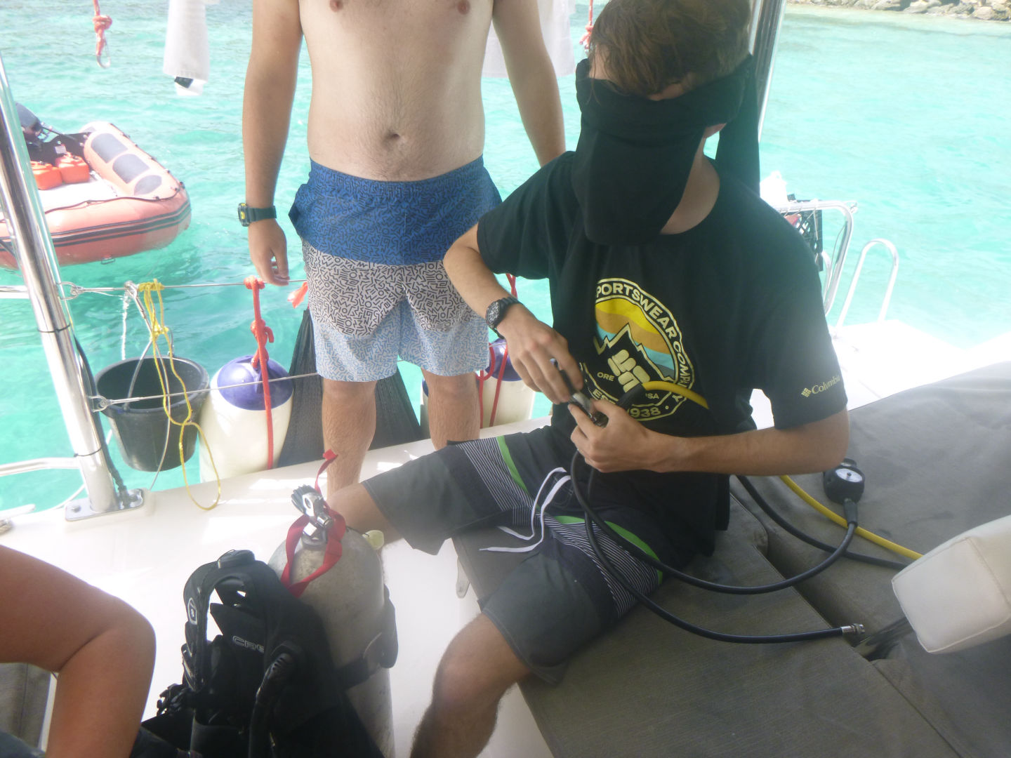 We had a leisurely wake-up this morning with breakfast at 8. Most of us were up around seven, but a few people slept in until about 7:30-7:40. We ate a breakfast of French toast made by Tylah (Aussie) and Alexis while the staff headed off to their meeting. Moorea wanted more food, so Tylah cooked up the rest of the egg/cinnamon French toast dip thing into scrambled eggs, and it was really bad, so we threw it overboard. We set sail for playgrounds as the Dolphins prepped for their 2nd (or 3rd) research dive, and the Neptunes were excited about their fun dive. We arrived at our dive site (Playgrounds) and got our gear ready. We dinghied over to the dive site and backrolled off of the dinghy into the water. The dive sight was really pretty, with a lot of soft coral. The research groups went their separate ways to continue to collect more data. Tylah, Zack, and Alli analyzed the reaction time of feather dusters, Ty, Alexis, and Moorea chased parrotfish around gathering data on their feeding patterns, and Scarlett, Kyler, and Jack set out a transect and analyzed the amount of sea fans with disease present at the site. After that dive, we headed back to the boat, where we had a great lunch of Mac and cheese that Alexis cooked (Tylah cleaned the kitchen after the meal as he was hanging out on the roof) while the rest of us hung out on the roof watching the rescue boat, Event Horizon, complete their first real scenario. It was very entertaining. After lunch, the tanks were all refilled, and the Neptunes finished their equipment specialty by setting up their dive gear blindfolded. Once that was done, the Neptunes (Caleb, Brian, Dylan), Ty, Alexis, and Moorea headed back to the playgrounds for another fun dive/research.
