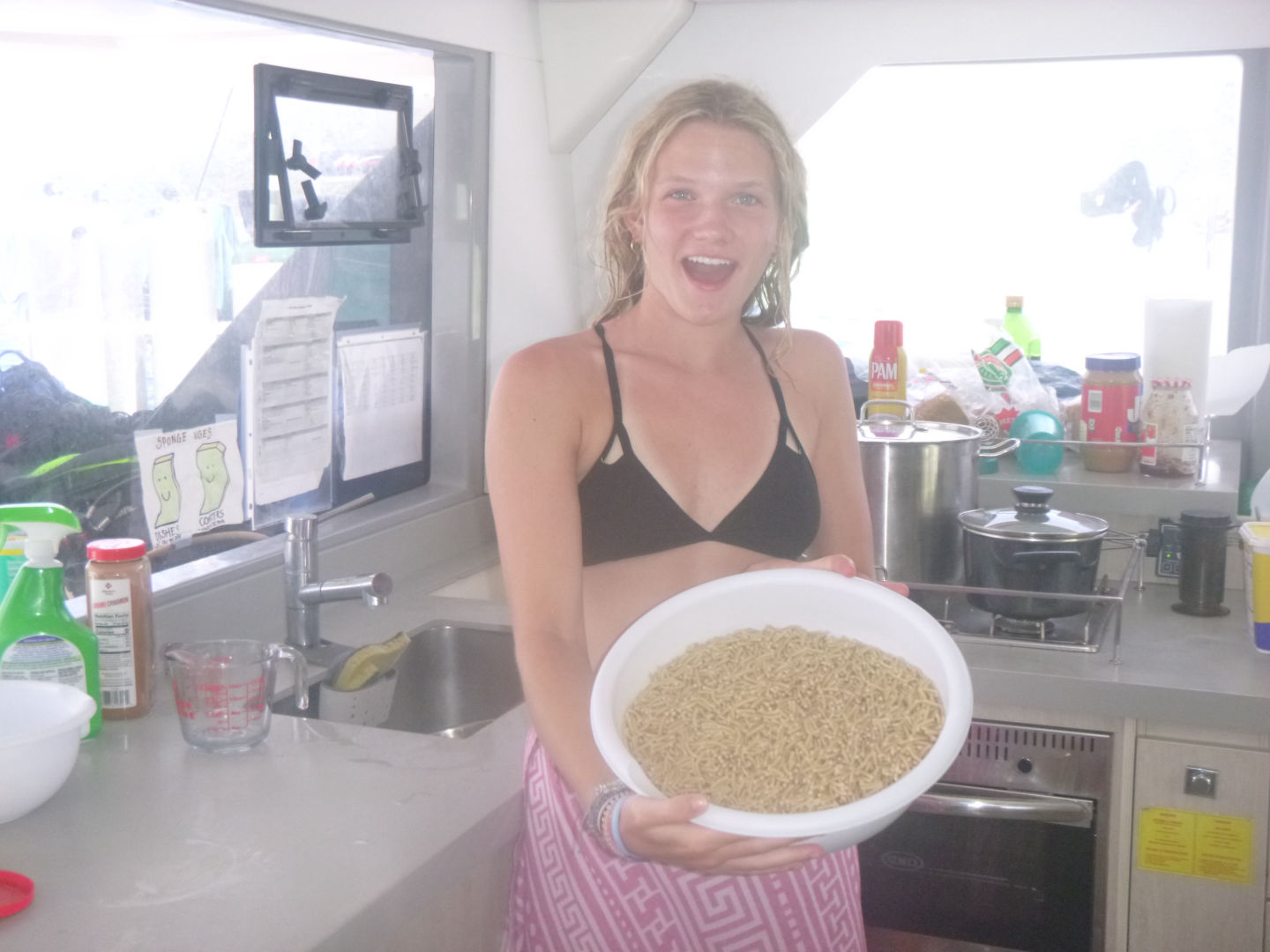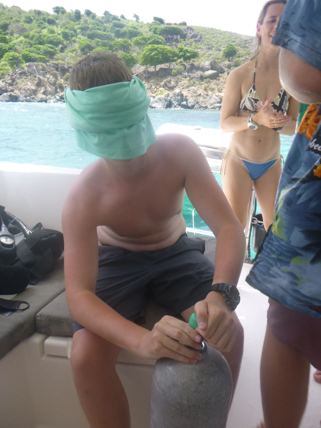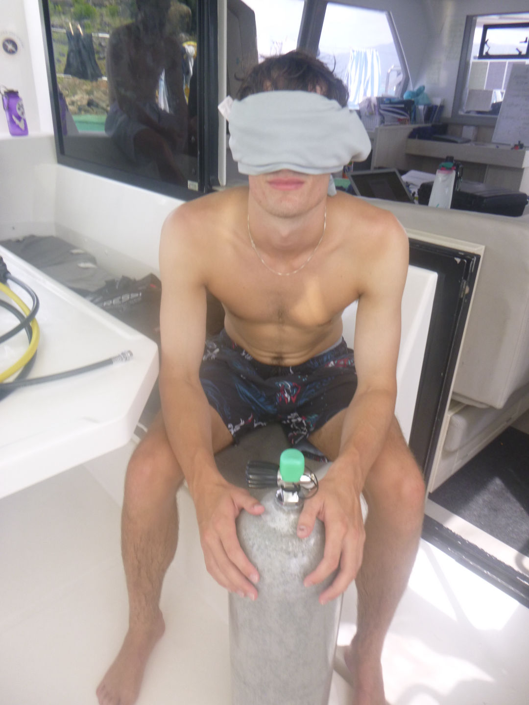 We had a leisurely wake-up this morning with breakfast at 8. Most of us were up around seven, but a few people slept in until about 7:30-7:40. We ate a breakfast of French toast made by Tylah (Aussie) and Alexis while the staff headed off to their meeting. Moorea wanted more food, so Tylah cooked up the rest of the egg/cinnamon French toast dip thing into scrambled eggs, and it was really bad, so we threw it overboard. We set sail for playgrounds as the Dolphins prepped for their 2nd (or 3rd) research dive, and the Neptunes were excited about their fun dive. We arrived at our dive site (Playgrounds) and got our gear ready. We dinghied over to the dive site and backrolled off of the dinghy into the water. The dive sight was really pretty, with a lot of soft coral. The research groups went their separate ways to continue to collect more data. Tylah, Zack, and Alli analyzed the reaction time of feather dusters, Ty, Alexis, and Moorea chased parrotfish around gathering data on their feeding patterns, and Scarlett, Kyler, and Jack set out a transect and analyzed the amount of sea fans with disease present at the site. After that dive, we headed back to the boat, where we had a great lunch of Mac and cheese that Alexis cooked (Tylah cleaned the kitchen after the meal as he was hanging out on the roof) while the rest of us hung out on the roof watching the rescue boat, Event Horizon, complete their first real scenario. It was very entertaining. After lunch, the tanks were all refilled, and the Neptunes finished their equipment specialty by setting up their dive gear blindfolded. Once that was done, the Neptunes (Caleb, Brian, Dylan), Ty, Alexis, and Moorea headed back to the playgrounds for another fun dive/research.