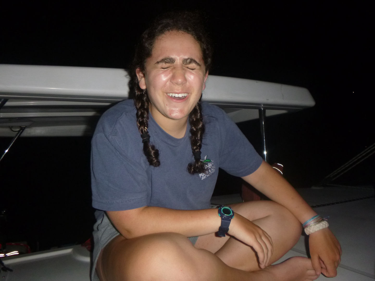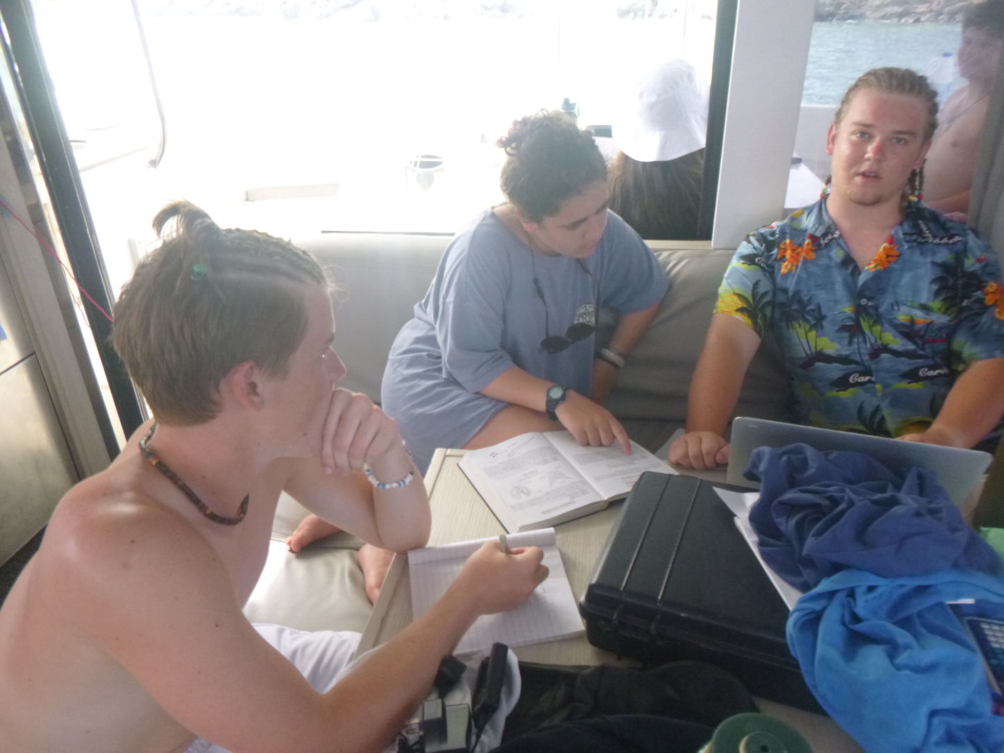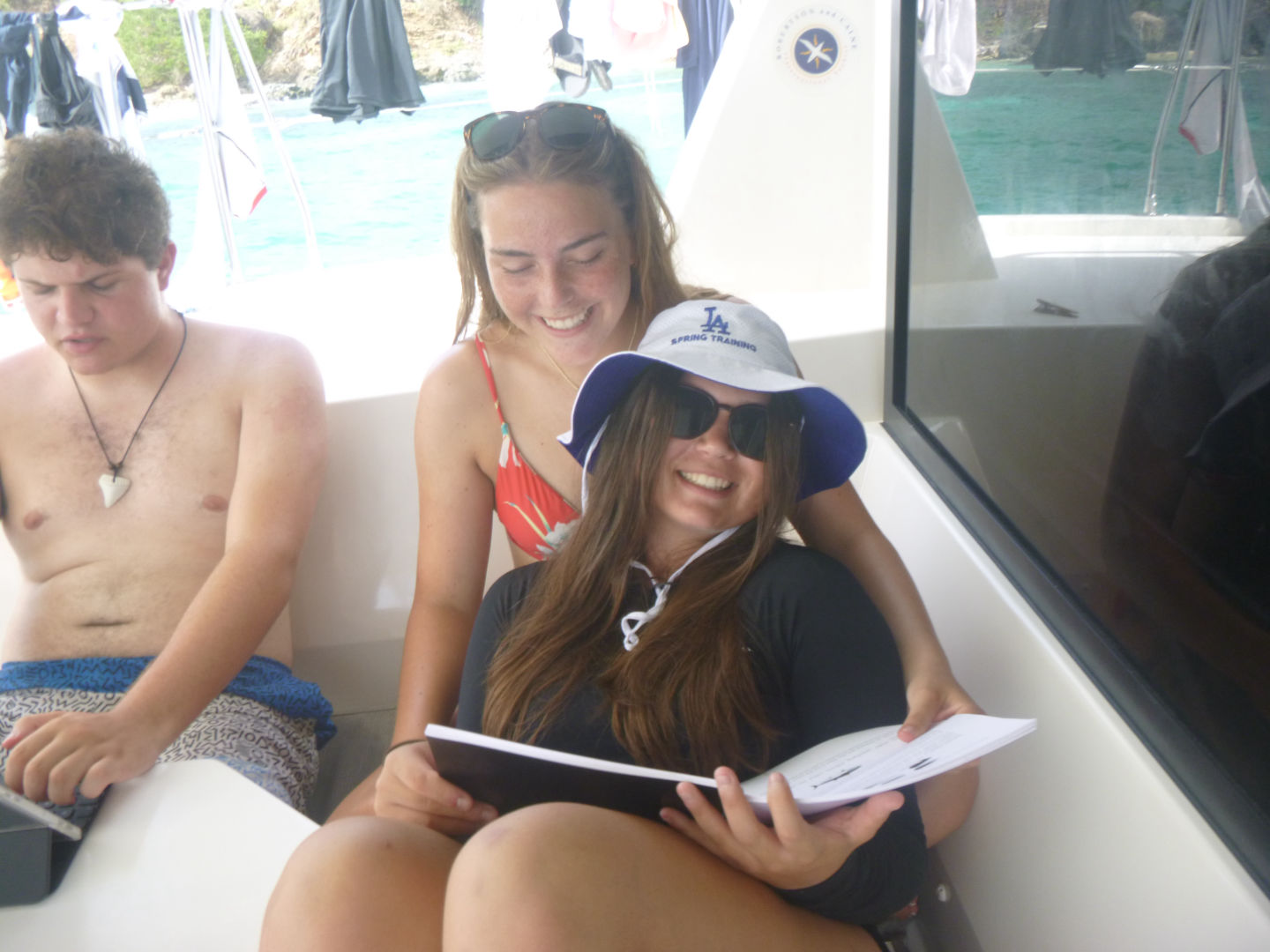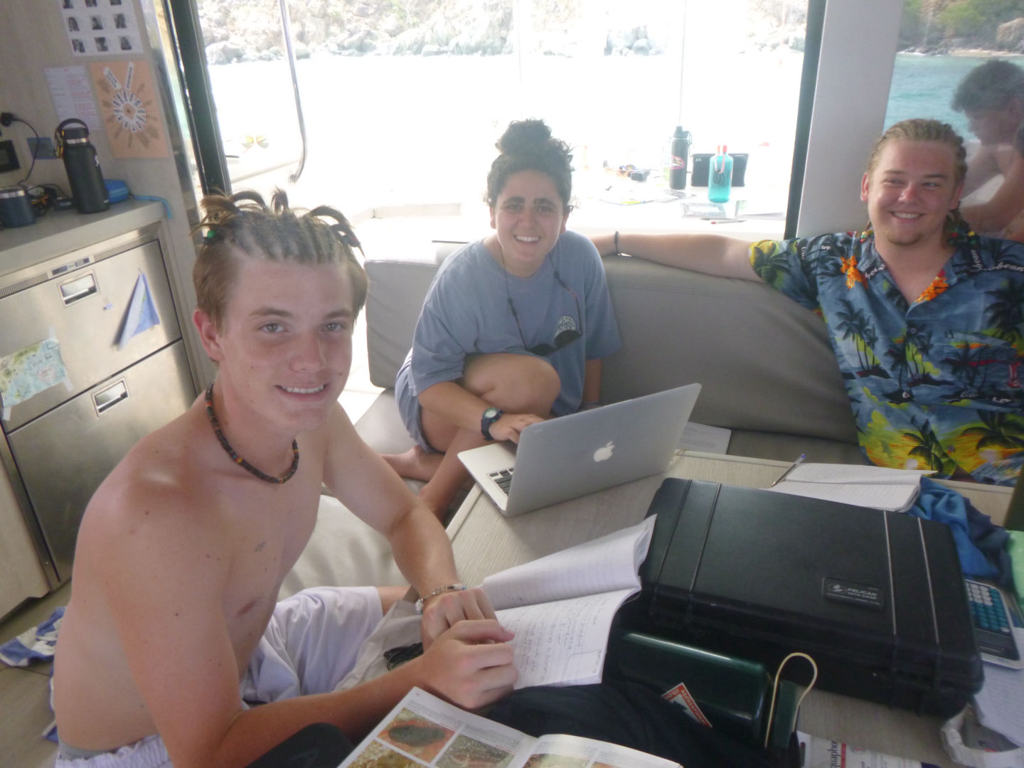The research group saw four squids doing what seemed to be a mating ritual, and the Neptunes saw four lionfish. We also all saw a baby trunkfish. It looked like an M&M. Caleb said he wanted to eat it. At the safety stop, we played a fun game of grab each other’s fins, and Alexis ended up with no fins, Dylan, Moorea, and Caleb need up with their fins, and Brian and Ty had switched fins. Once we ascended, we headed over to this tiny island that looked like it was right out of SpongeBob and had some time to hang out at the beach. Some of our boats, Jack, Zack, Alli, and Tylah, joined us at the beach. After the beach, we headed back to the boat where we had time for showers and to put our dive gear away. Once we were done with that, it was time for the dolphins to take their final exam and the Neptunes to chill out. Midway through the exam, dinner was ready (thanks to Cara and Anna). It was a meal of rice and franks. We did our nightly squeeze, dishied up, deckied the boat, and continued the exam. Now we are ready to hang out and go to bed. We miss you all!