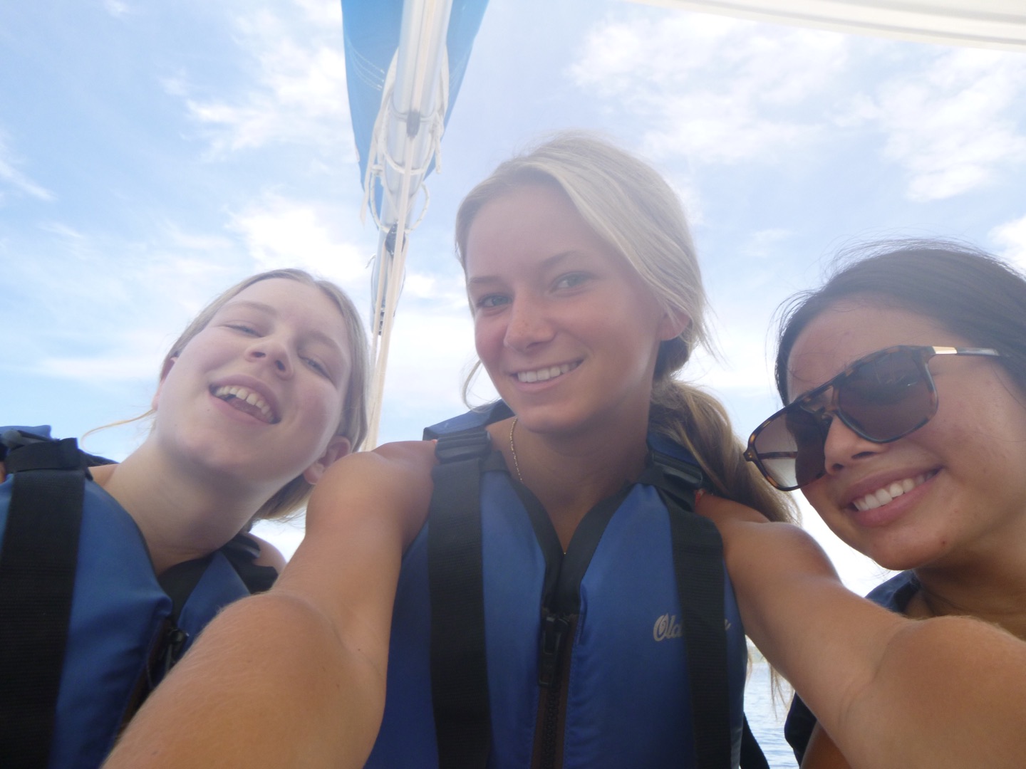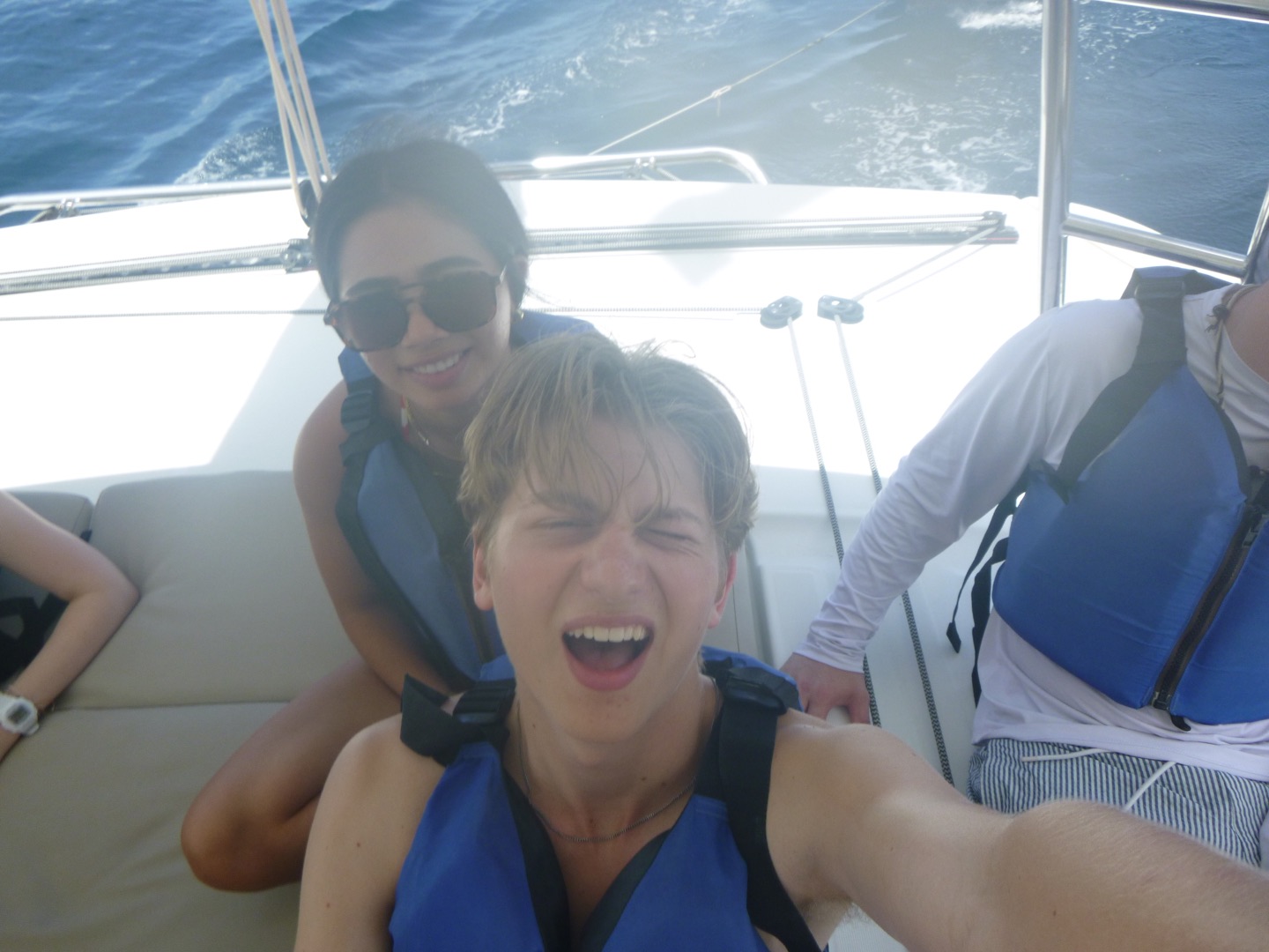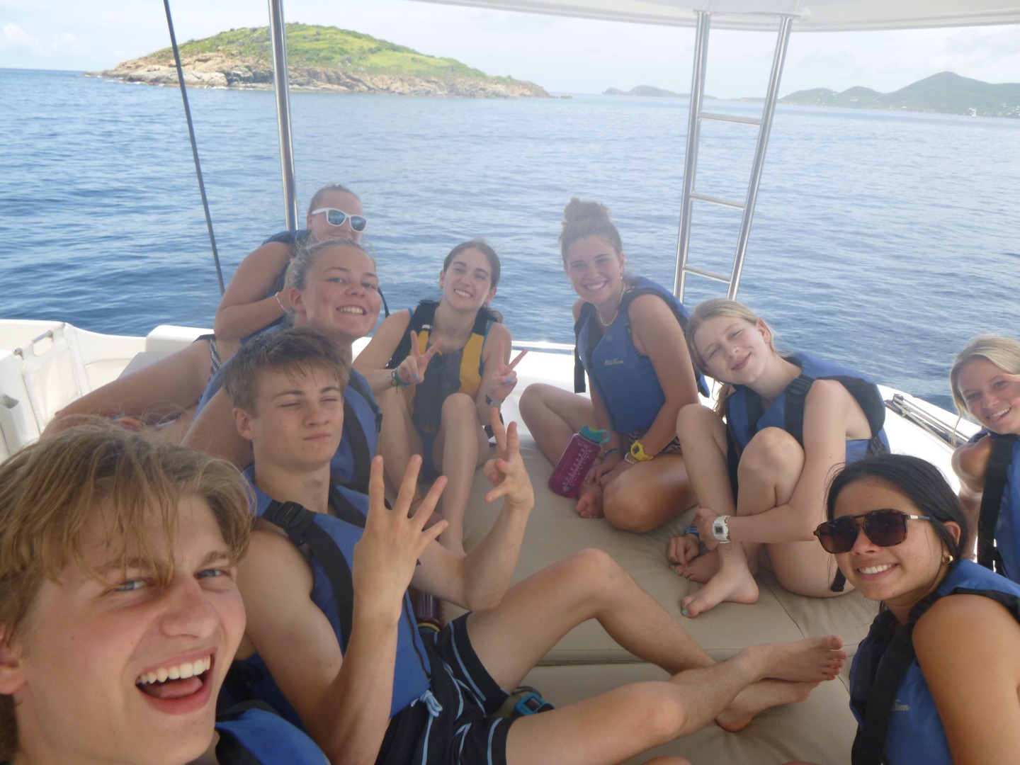 Hello from Odyssey today, shipmates Claire, Rachel, Catherine, Carson, Alyssa, Brig, Greta, Ella, Jordan, Freddie, Molly, and I enjoyed a fun-filled day made up of activities such as snorkeling and sailing; we learned valuable skills on how to raise a sail on a ship and how to properly steer a sailboat. During the Lesson, Greta, Jordan, and Alyssa led the group in a conversation about our experiences and reasons for coming on this trip. These skills not only teach us how to sail a ship but also to work as a team that all seek to achieve the same goal. Tonight, we are mooring, which means that we are “anchored” to a rope that is attached to the ground. In order to attach to the rope, Carson, Freddie, and I worked as a team to grab the rope using a special hooked stick. Freddie and Carson then proceeded to tie the ropes to the port and starboard parts of the Bow of the ship. Once we were stationary, we took our first Ocean “shower,” which meant that we had to swim in the ocean and use our soaps in the water. This experience showed us that even the little things require effort and that if we wanted to thrive during this trip, we would need to work hard for everything we do. Last night, Claire and Ella spent their night journaling about the new experience while Brig, Freddie, Carson, and I talked about our past experiences. During that time, Rachel, Molly, and Catherine converted the Living room into a giant bedroom.