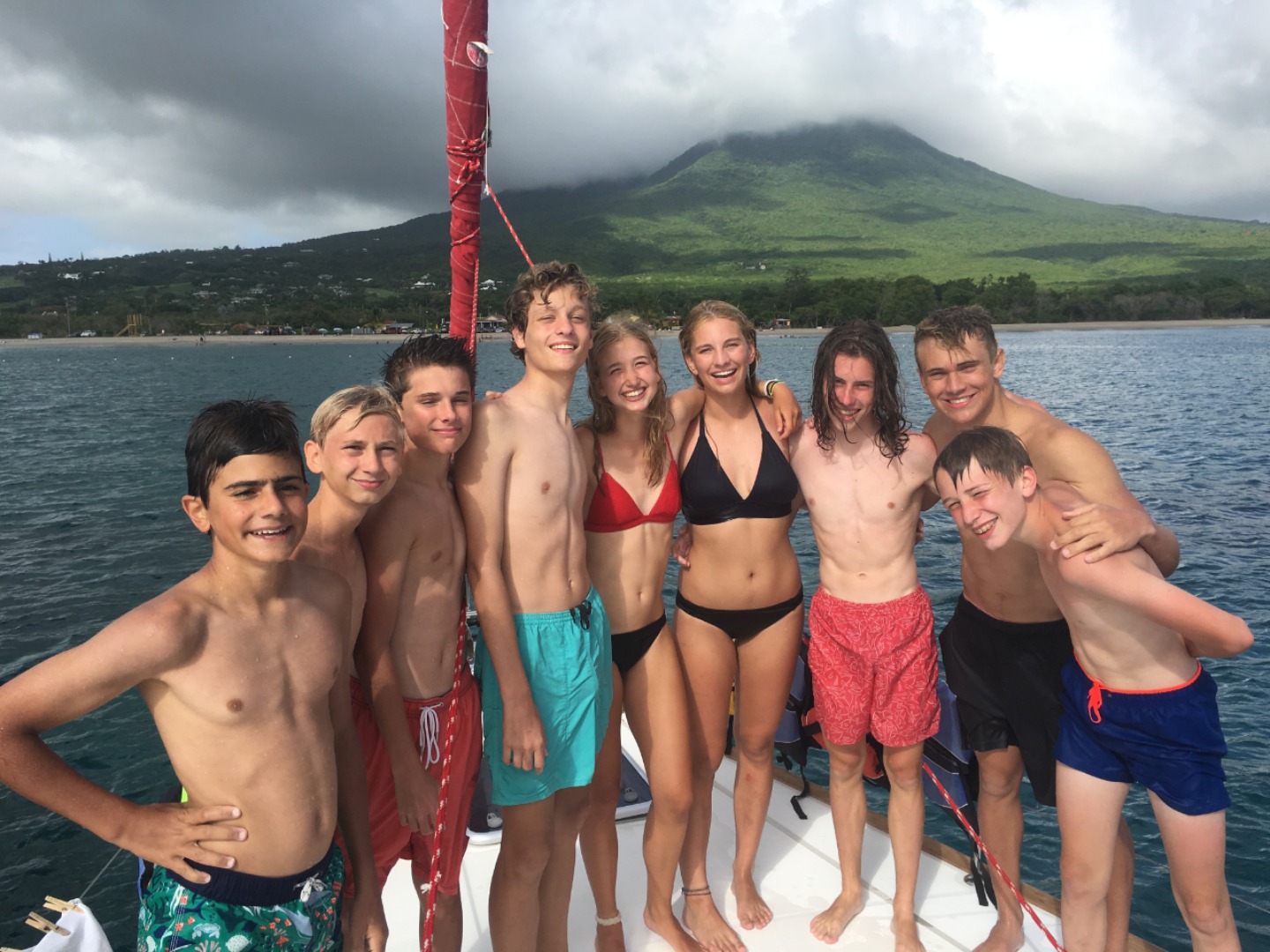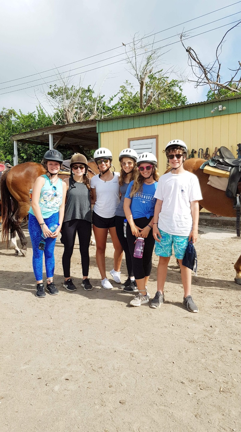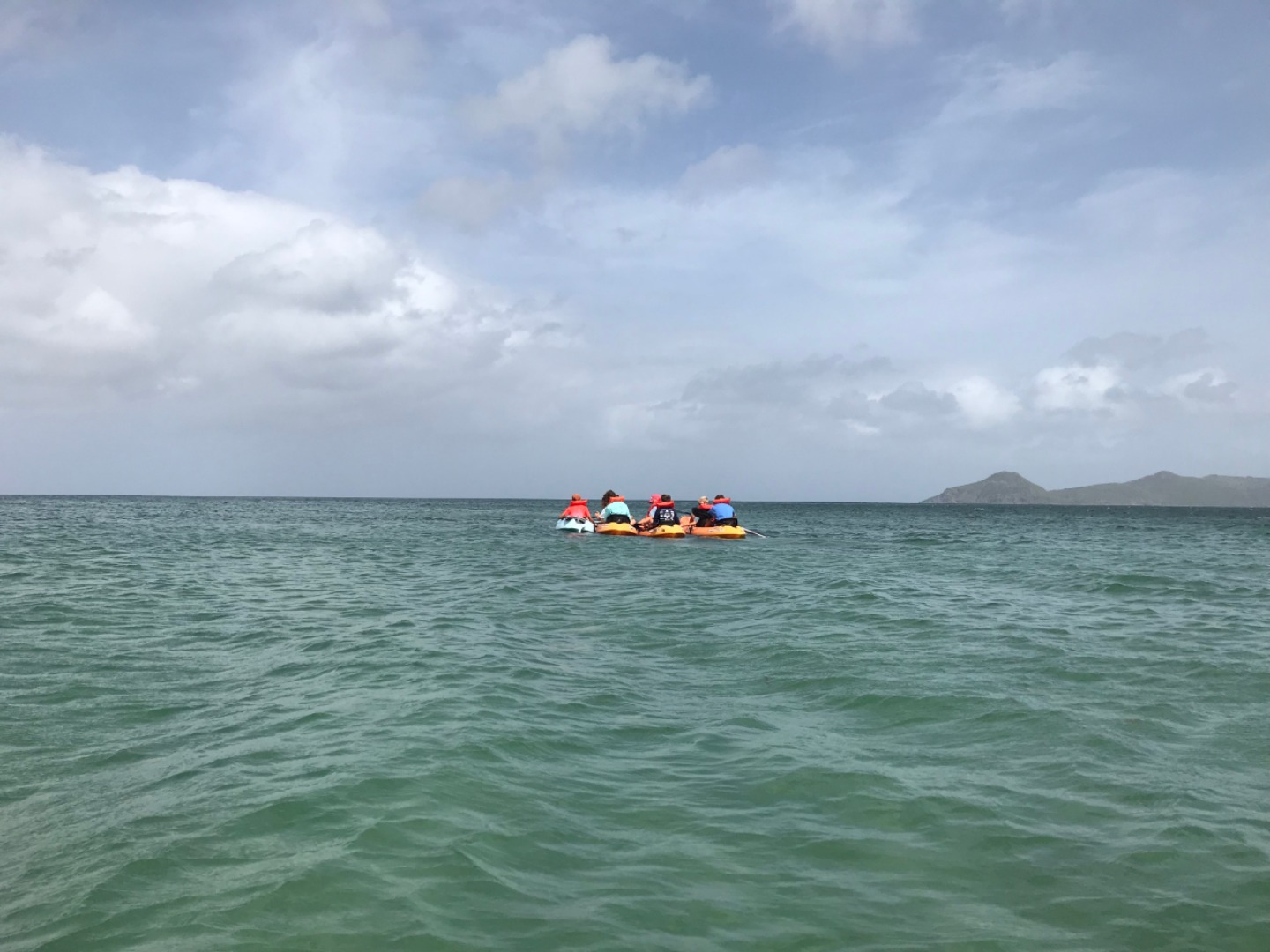 Today we started our day with a delicious breakfast. We had cereal and granola. Then as soon as we got finished with the dishes, we sent out on our journey. We got to choose to go kayaking, biking or horseback riding. I decided to go kayaking. We arrived in the dinghy and drove to shore to meet a taxi. The kayakers and bikers went in the same cab. Once we got there, we went our own way. The kayakers got in our boat and pushed away. We drifted down a half mile then the battle began. We had to kayak upwind. We started to go upwind and then we all started to splash each other. We got soaked! The fight only lasted a couple of minutes. After we finished kayaking, we decided to relax on the beach. The bikers came back after a little while, and we all went back to the boat for little free swim time and to get ready for dinner at Sunshine’s Beach Bar on Pinney’s Beach.