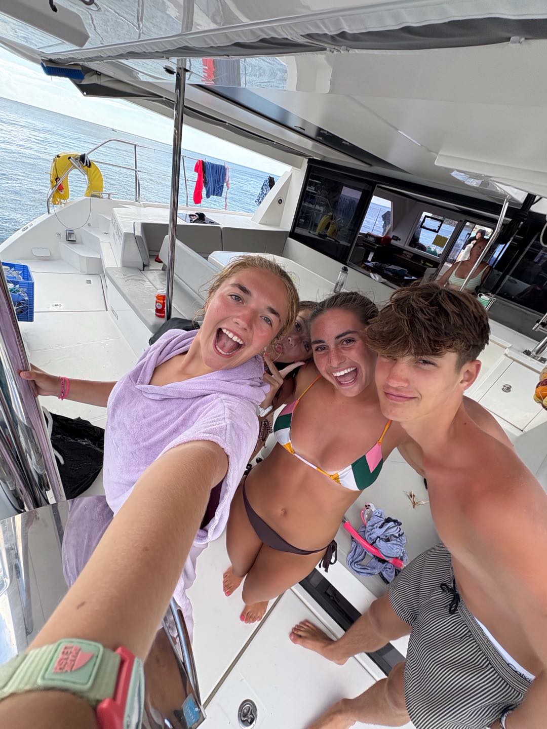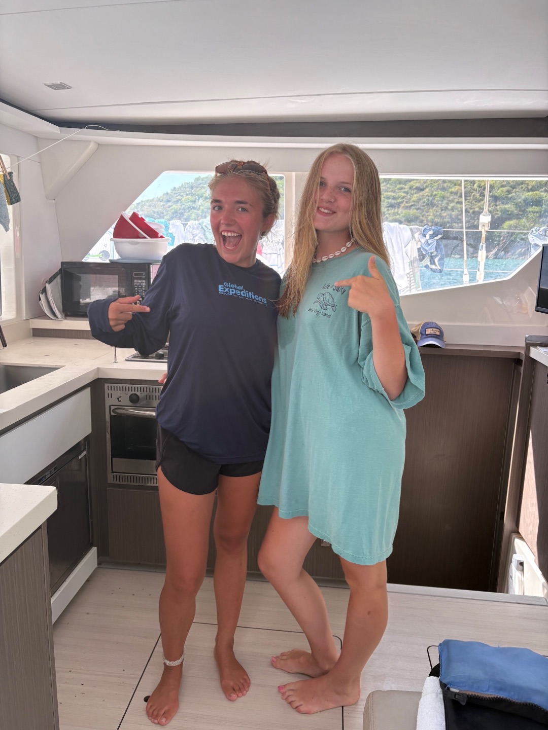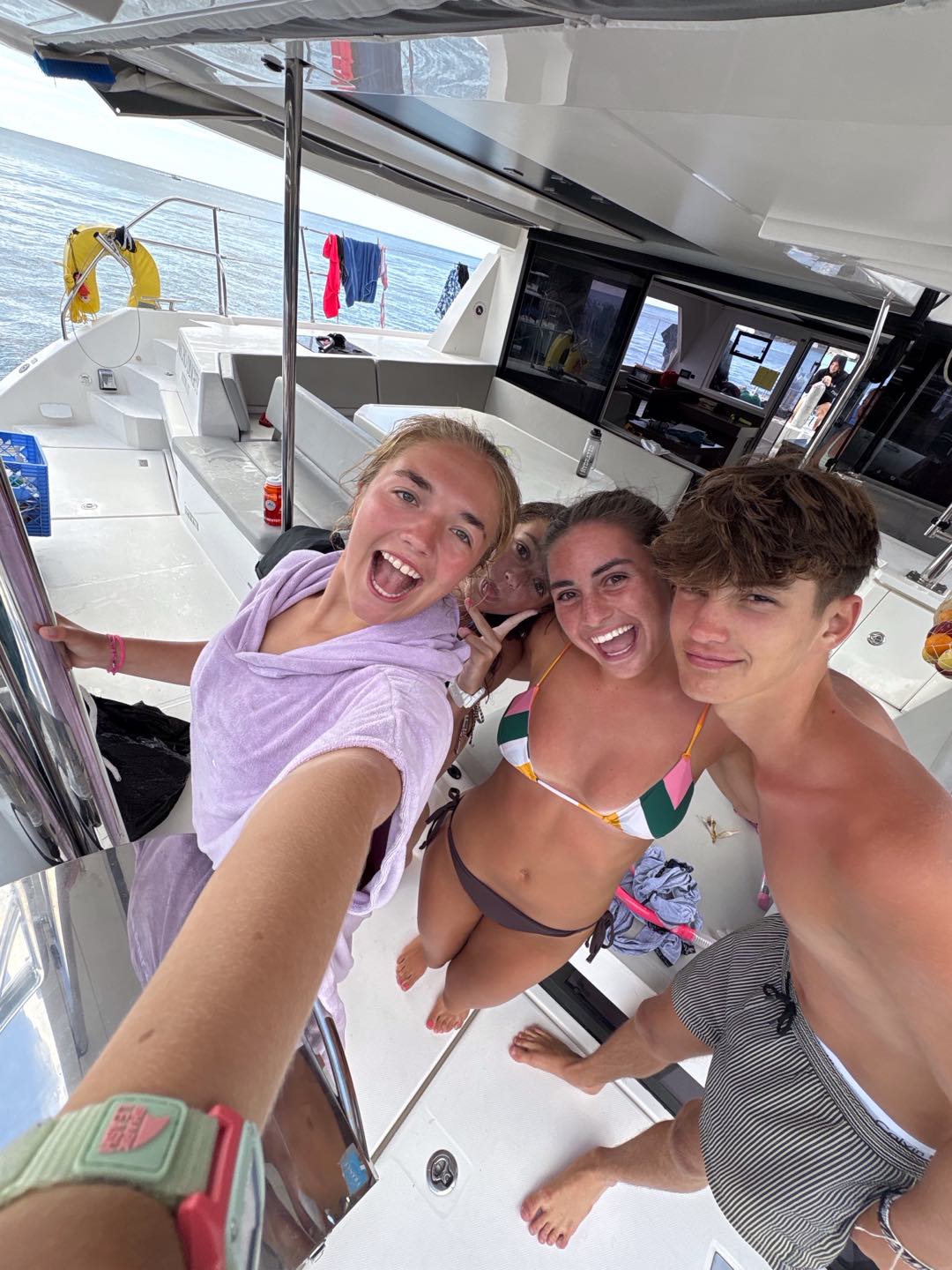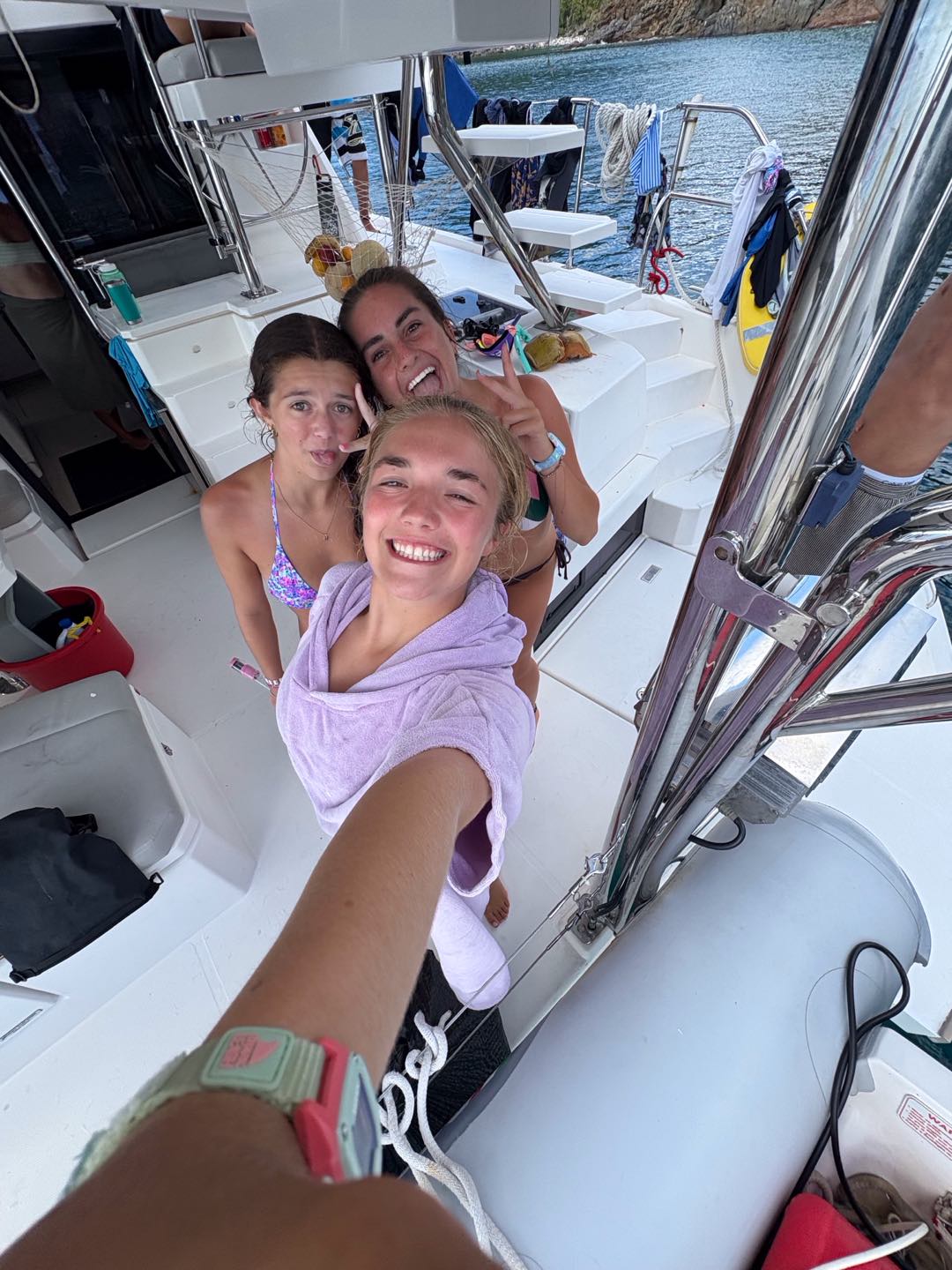 Today we woke up bright and early at 5:45 to get ready for our big hike! We ate cereal quickly, filled our water bottles, and applied sunscreen. After we were given back our phones, we hopped into the dinghy and headed to the dock. We started our journey up the massive, steep mountain. It was an 8-mile hike uphill. Obviously, I started off super strong but still got beaten by August, Eva, Jerry, and Clemmie. The hike took a while, and we got to socialize with other boats during the 4 hours. We finally made it to the top and got victory smoothies. After Tom, Thom, and I ran down the mountain, we immediately went to get lunch.