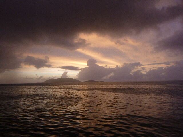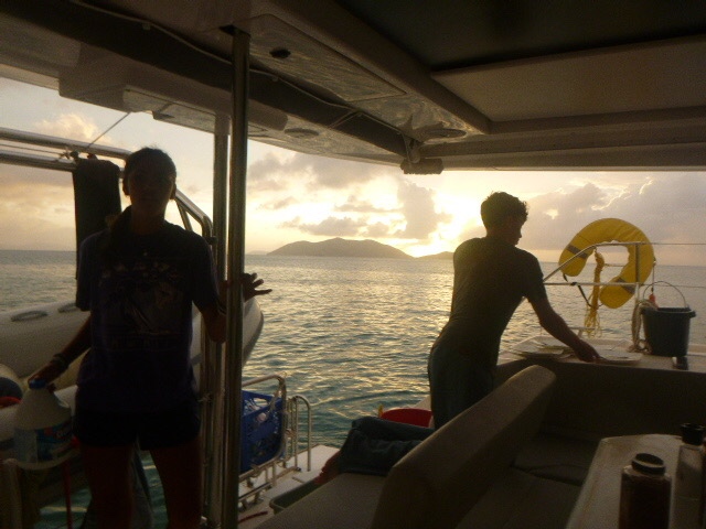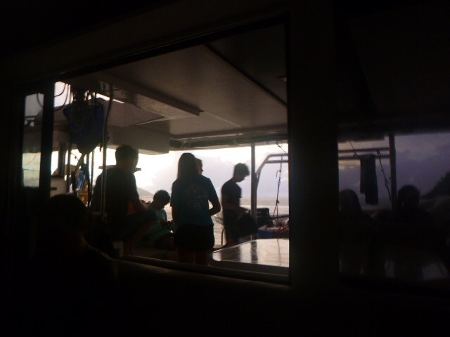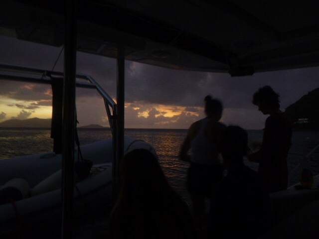 After lunch, we moved to a new spot to dive. Here, dolphins continued our research dives. Zoe, Maddie, Addy, and I counted the number of goby on different-sized coral heads. We also did not get lost, which, for me and Maddie, is always a win. Kennedy, Maya, and Gabe continued to study damsel fish aggression. The Neptunes had a fun div.e Sloane, Breckyn, Ellory, Arther, and Dylan all said they were glad they were able to successfully navigate back to the boat. When we got back, we were able to take down below showers, so we all feel extra clean. Maddie and Ellory then started dinner, which would have been pretty good if it hadn’t been for the lettuce in the salad being frozen and then becoming extremely mushy. I don’t think a single bite of the salad was eaten. Now as I write this everyone else is doing dishy pit, and we dropped another fork which is quite unfortunate as we already don’t have enough, meals have become a race of who is able to use a fork and who is stuck with a spoon. We will have to see who gets sacrificed to free dive down for it. It’s also raining, which created the most gorgeous sunset. Tonight we will hopefully get to sleep early, as we need to wake up at 6 am for a hike tomorrow. X