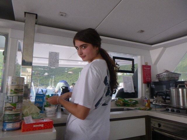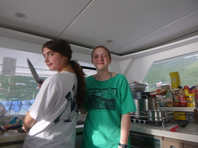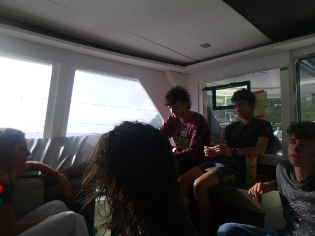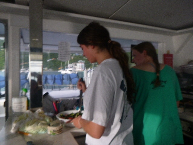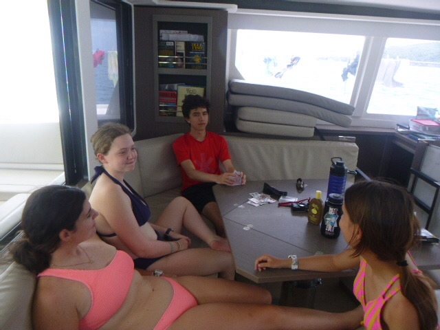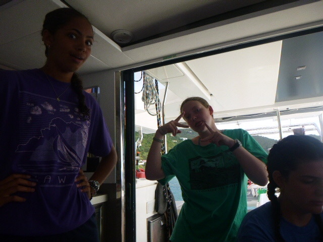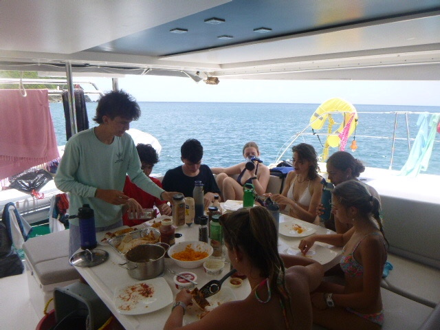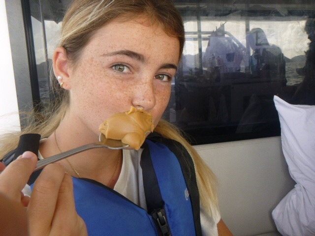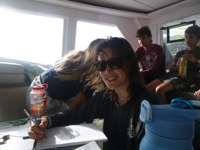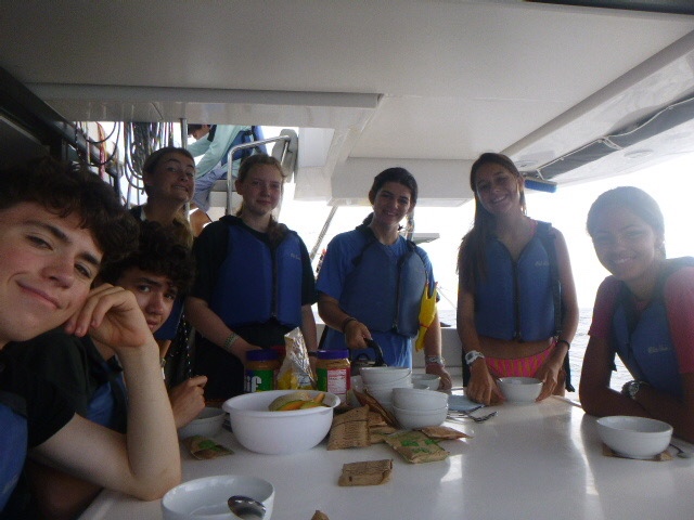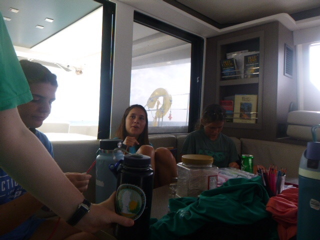 It’s official, the amount of peanut butter our boat consumes as a whole is concerning. It seems that every meal we somehow find a way to incorporate peanut butter. This morning we woke up and started out the day with breakfast, which was oatmeal. And surprise, surprise, the peanut butter was brought out. It was a hard morning for Zoe because we ran out of apples, so her normal apple and peanut butter became just a spoonful of peanut butter. We finished eating and dishy pitting while under, then Zoe, Addy, Kennedy, and I all worked on our friendship bracelets. My water bottle is now covered in strings for all the bracelets I’m making. When we anchored, all the dolphins went turtle tagging. It was not very successful, considering we saw a grand total of 0 Turtles. But Dylan and Arthur said it was funny to see all of them just getting towed around the boat. We then ate lunch, where Maddie beat her fear of hot cheese by trying a quesadilla.