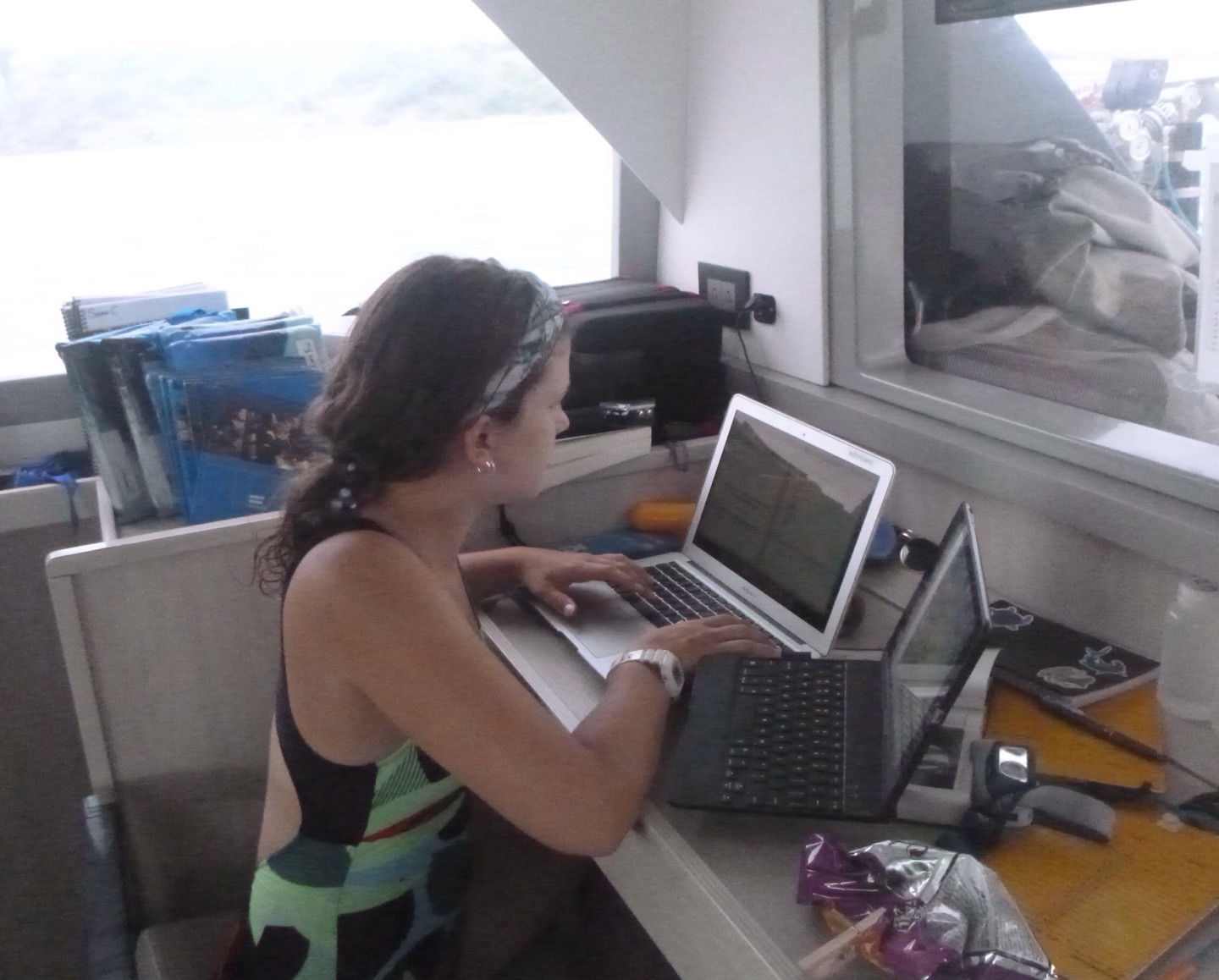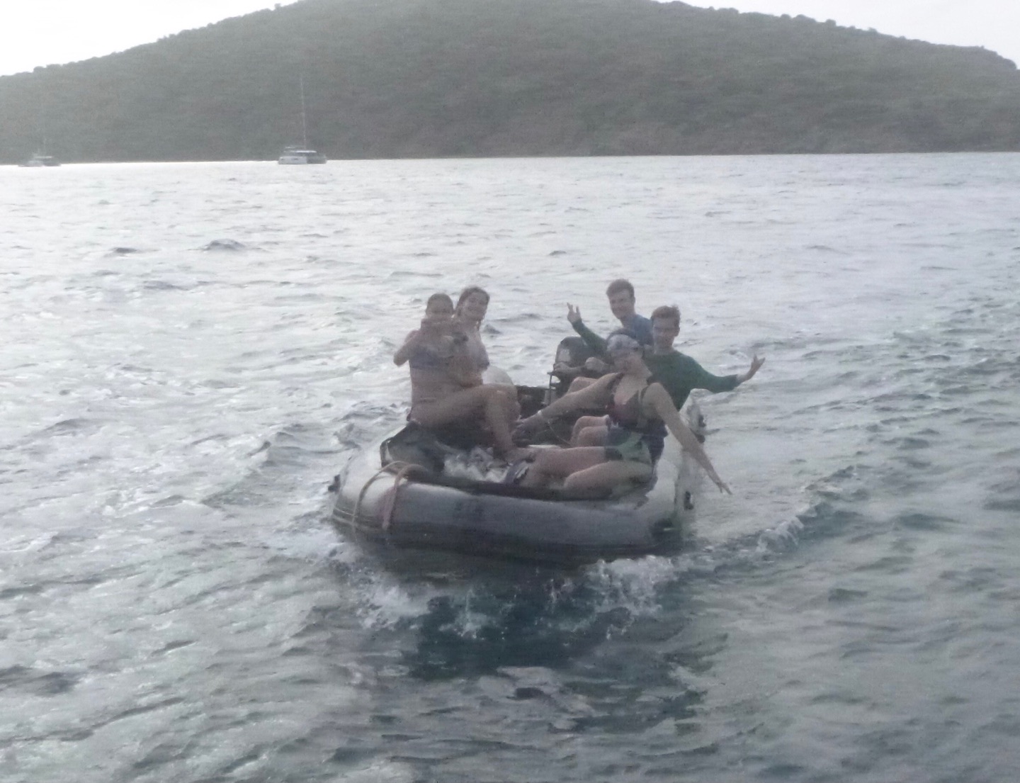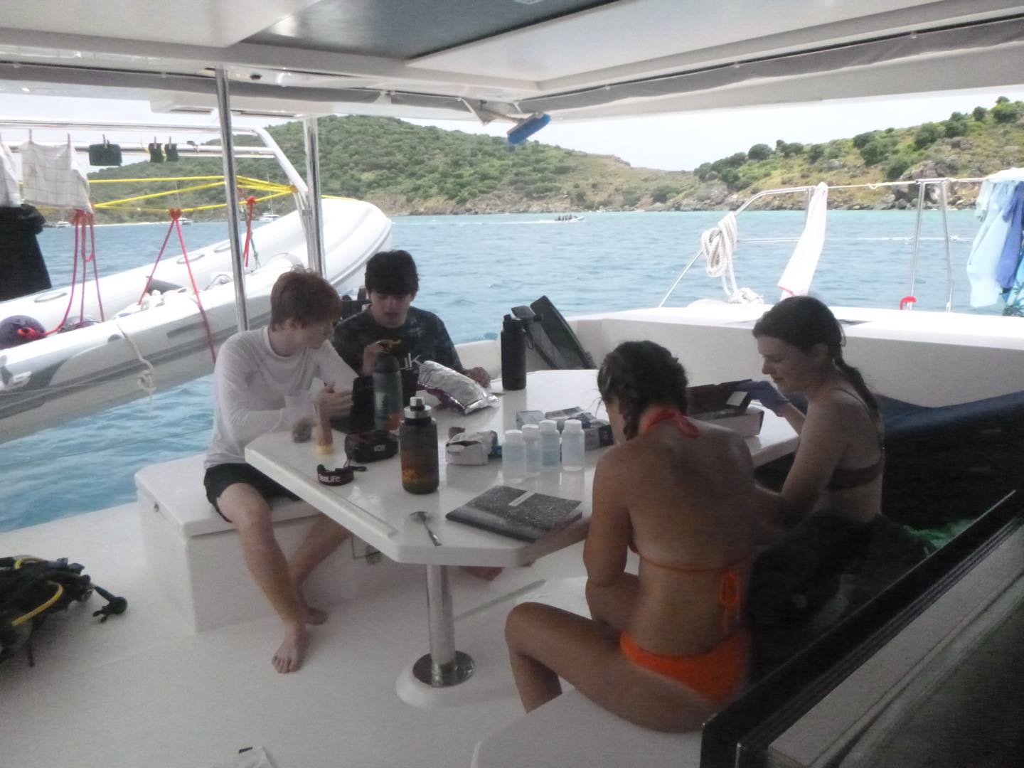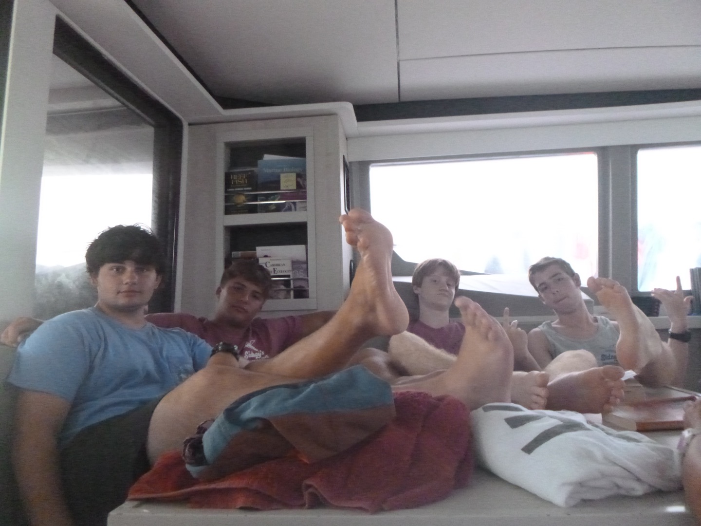 Today, we woke up later than usual, at eight o’clock. The staff went to a morning meeting, and we made, ate, and cleaned our breakfast of cereal before they got back. Then, we went underway to The Playgrounds for our first dive of the day. The Dolphins had their final official research dive, and the Neptunes had a fun dive. The Neptunes Katie, Parker, Maya, and Mason were excited because they saw a baby lionfish, a cobia, a large octopus, and three reef sharks. Team Plummage being Paloma, Lucy, Jasper, and I saw a spotted moray eel and a pea-sized baby trunkfish. Lunch was chicken salad wraps, and afterward, we had a little downtime where the Dolphins worked on their research projects. For our second dive, the Neptunes decided to moon dive, which means diving without fins, and the Dolphins hopped back into a dinghy to dive into The Playgrounds again. Team Plummage saw a large barracuda, a porcupine fish, two baby golden tail moray eels, and five huge lionfish. The other Dolphin group, Reese, Sean, Will, and Malea, saw a lot of small pufferfish and a peacock flounder. After dinner, the squeeze was screaming at a nearby AQ boat, which ended up causing multiple other boats to scream back, which was fun.