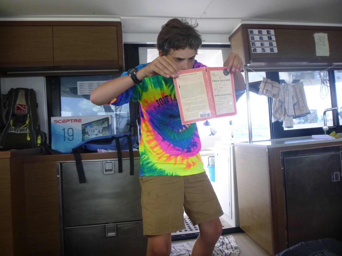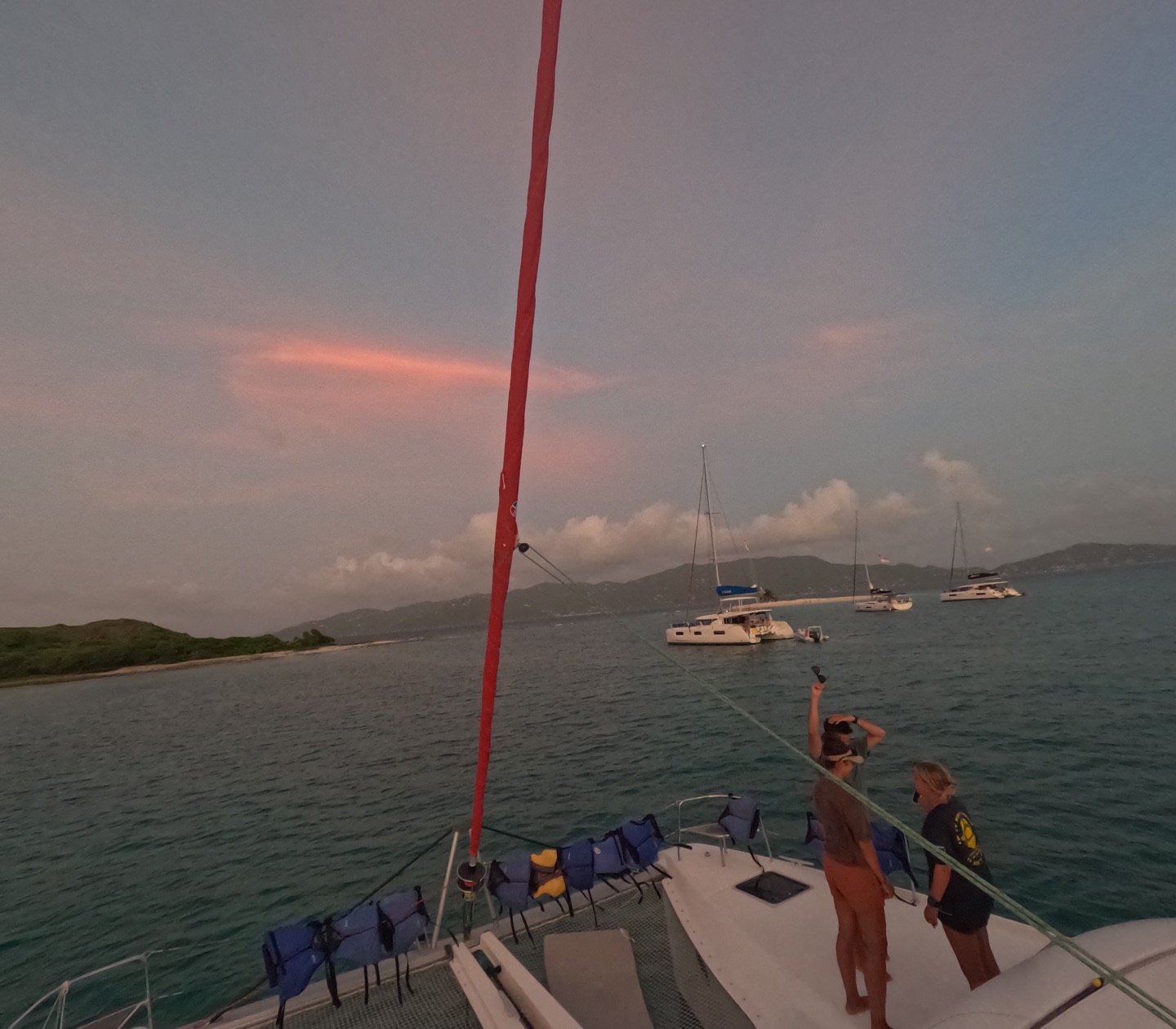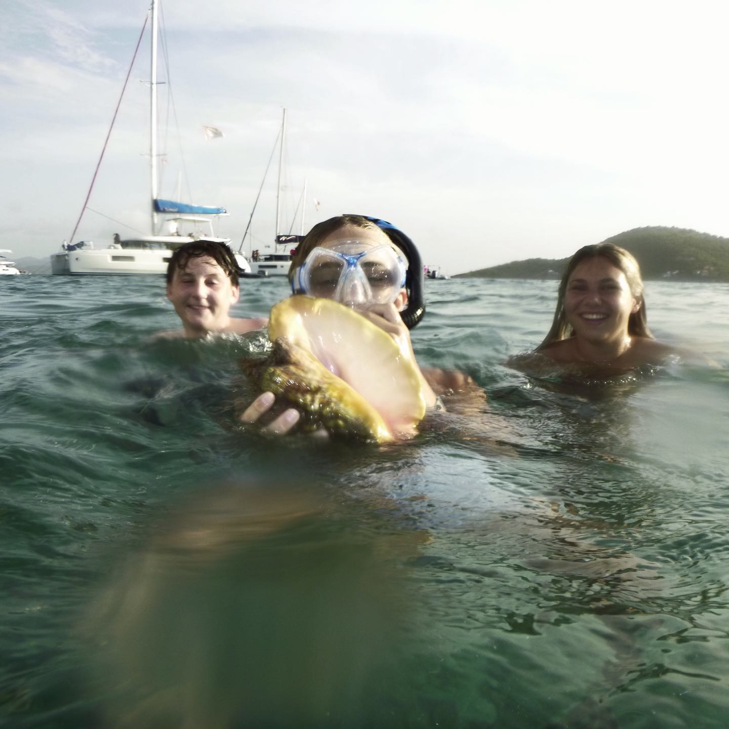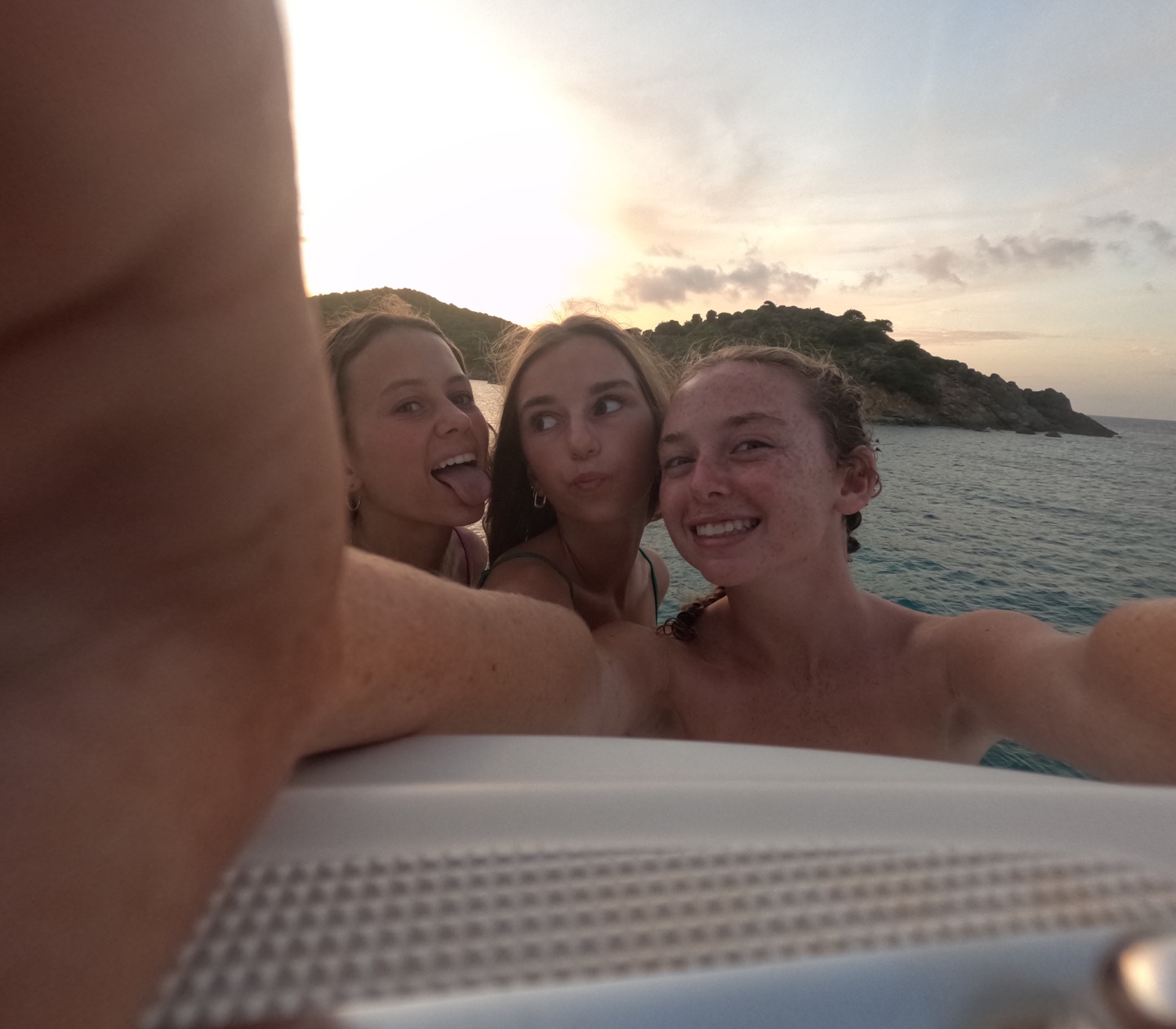 Avizia had a great morning, including French toast and the sun on all of our faces. Gavin munched on his Nutella-covered toasts peacefully as we started our day! Mike set up the groups for our sailing practical, which were Group 1: Jovian, Andrew, Cam, and Dawson. Group 2: Pearl, Katy, Amaya, and Kennedy. Finally, group 4: Gavin, Suki, Holden, and Liliana. Group 1 began right away. Andrew raised the main sail with Jovian while Dawson did the winch, and Cam steered. During the first group’s sail, Kennedy and Pearl took a very long nap in the salon, and Amaya and I (Suki) read, which was nice because I finished my book. The first group put down the jib and main sail, and we went to Brewers Bay to have a delightful lunch of chicken salad wraps and some PB and Js in tortillas. Then, the second group began their practical and had a great time. Most of the groups who weren’t doing their practicals all chilled or made bracelets. I decided to take a small nap, and I was quickly woken up by my name being screamed from the salon, which was startling, haha. I went upstairs and began my sailing practical with my group mates, and we did things like raising the main sail and jib, using the winch, tacking and jibing, and easing the lines. Another section in the practical was that Mike would name a part of the boat, and we would have to go up and touch it. For example, Mike would say, “Go touch a stanchion!” And someone would run down and touch it. Btw, a stanchion is a metal pole that provides support for the lifelines. Then we moved on to tying different knots like a square knot 🪢 haha, that is actually a square knot emoji, lol. Then there are other knots like a clove hitch, figure 8, bowline, sheet bend, and a round turn double half hitch. I’m very happy to say that everyone who participated in the practical passed! Once all the groups were done, we went to Sandy Spit and set an anchor. After we anchored, everyone took their saltwater showers and did some optional snorkeling. The area we are at currently is very shallow, so when Dawson went snorkeling he was able to go to the bottom. He picked up a live conch shell and happily took some photos with it (which I’ll include). Everyone started to mess around, including Kennedy, getting tackled into the water. Everyone continued their showers and dried off for a dinner of cornbread, beans, rice, and salad. Everyone really liked the cornbread, which I can positively agree with. The squeeze question for tonight was, “What is your favorite movie?” There were some answers like Fantastic Mr. Fox from Pearl, Andrew said the movie Action Point, and Mike had an interesting choice of V For Vendetta. After the squeeze, the action for tonight was a Congo line! We played “La Cucaracha!” And happily waltzed around the boat while dancing. Amanda played some upbeat music, and everyone had a great time. Tonight, we are going to have a movie night, which we are all very excited about! I’m pretty sure we are going to watch Surfs Up, Mike’s all-time favorite animated movie. That was about it for Day 16, time is passing quite fast and I’m sure everyone is having a blast in the BVIs.