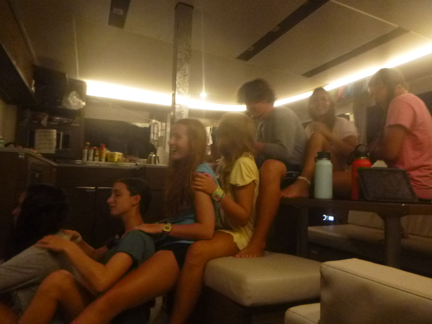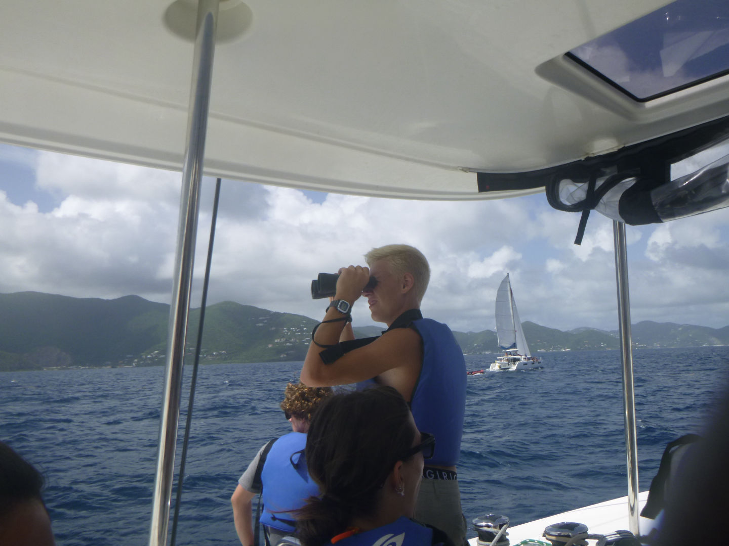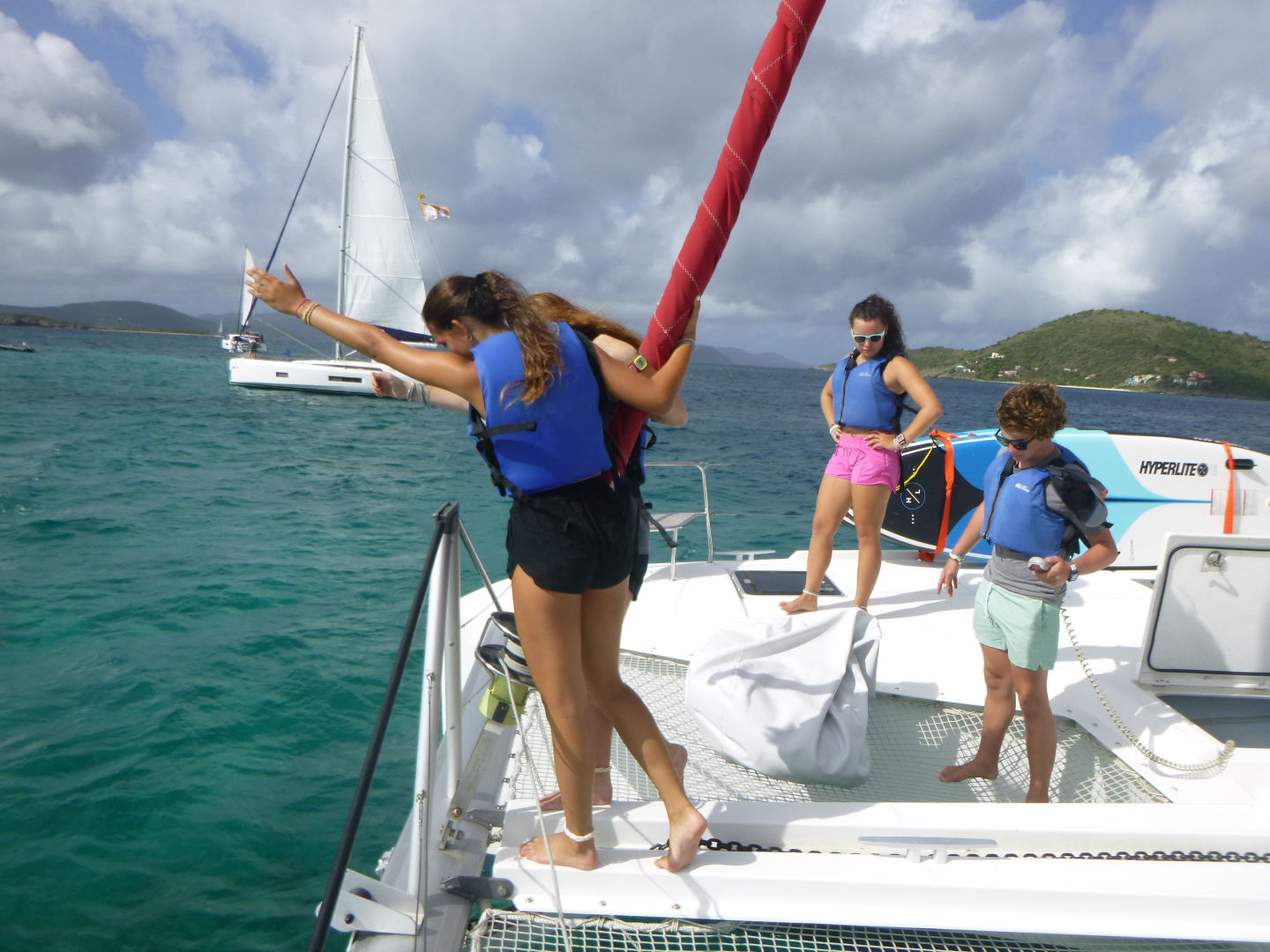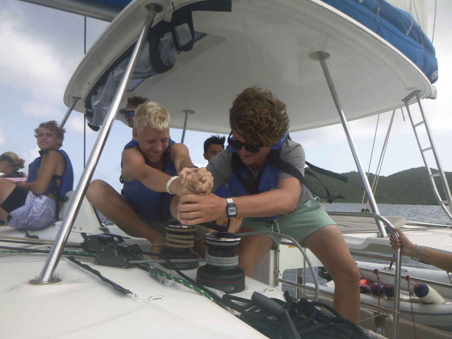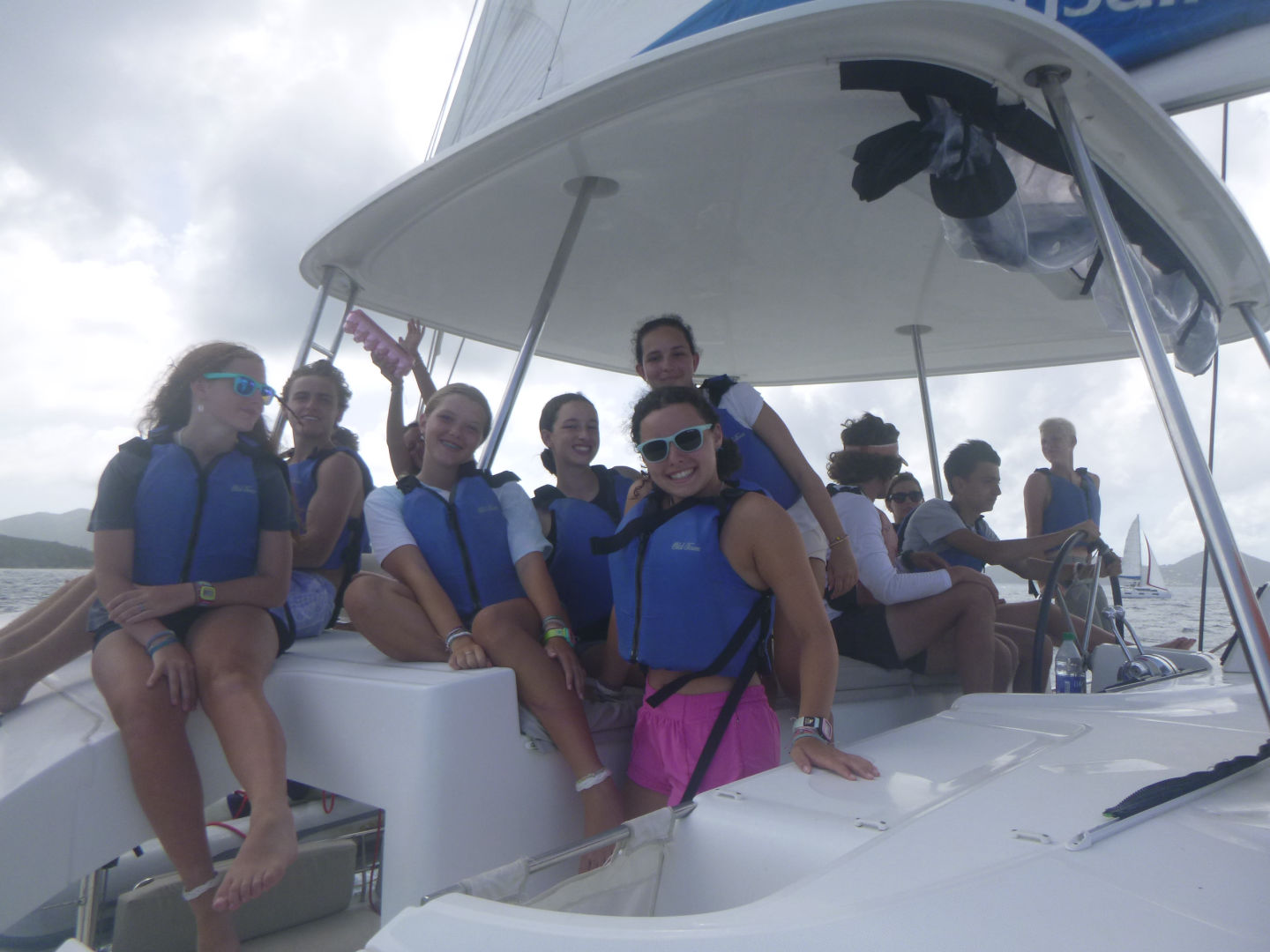 This morning started around 3 am for many of us. Ari, Macie, Alex, Niko, Jon, Maddy, Casey, and Cara (staff member) loaded up in the dinghy and headed out to the boat Nomada to prank them. First, we changed the name from Nomada Carribia to Nomada Estupida. Then we built a sand castle on their kitchen table. After getting caught by their head staff member and dinghied back to Avizia, we went to sleep. Then we and the rest of the crew woke up at 7 am with French toast preparing to start our first race of the day. We headed for the starting line and raised our sails. However, minutes into the race, we realized our dinghy was left behind. Having to rescue the dinghy, Cara jumped into the water while our skipper Max picked her up with the catamaran. Unfortunately, we lost the race but got to spend a couple of hours on land. Bridget, Caroline, Max, Will, and Erica ate at Pussers, a local restaurant. After eating and doing some shopping, the crew headed back to the boat for our second race of the day, where we placed fifth. We ended the evening rafting with Meow(another boat in the fleet) and had tacos for dinner as well as cake for Macie’s birthday. The crew is excited for tomorrow.