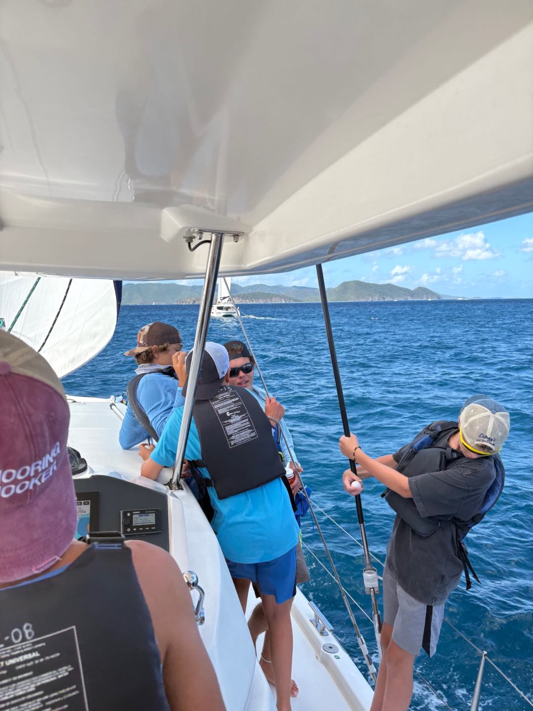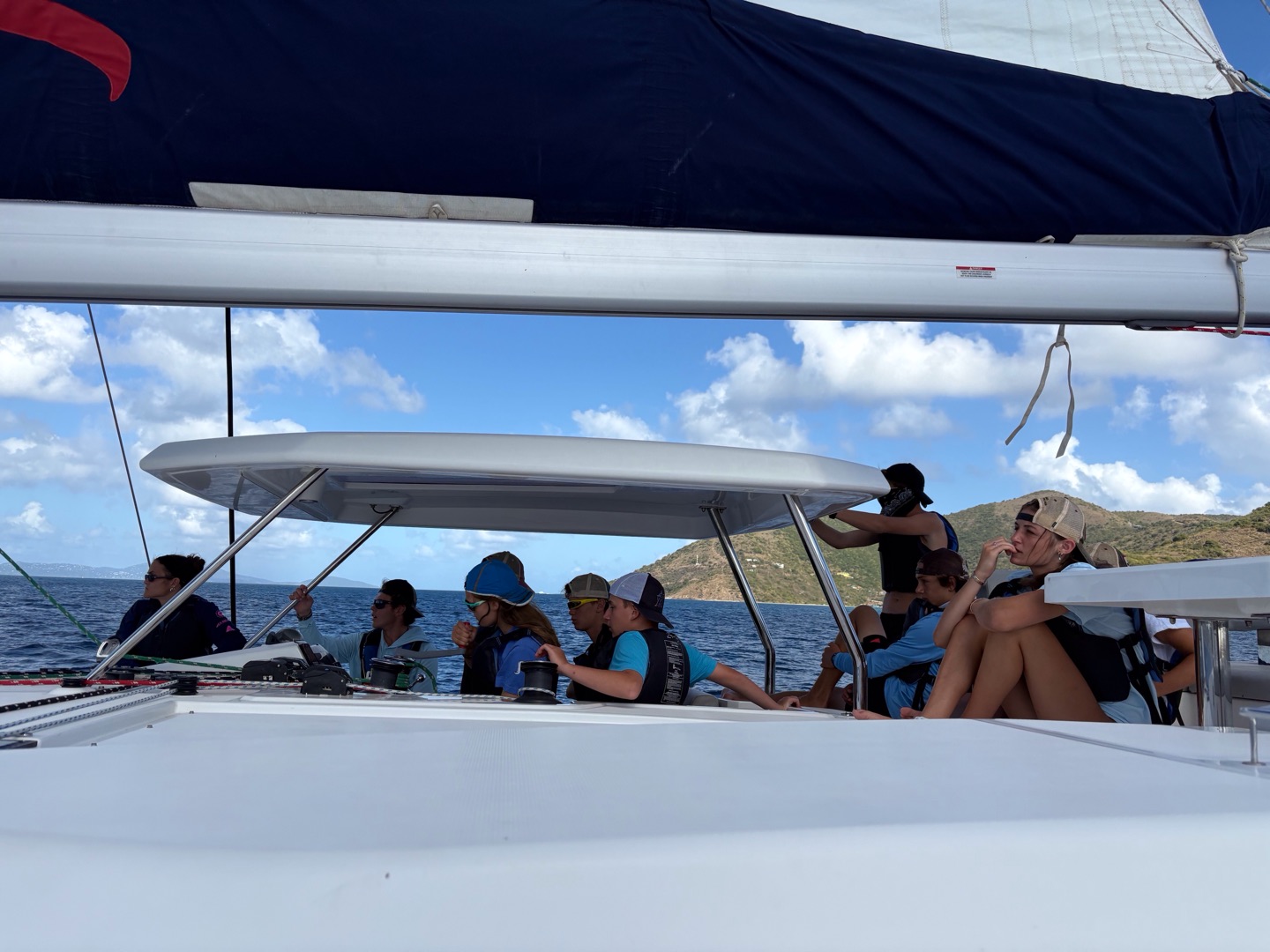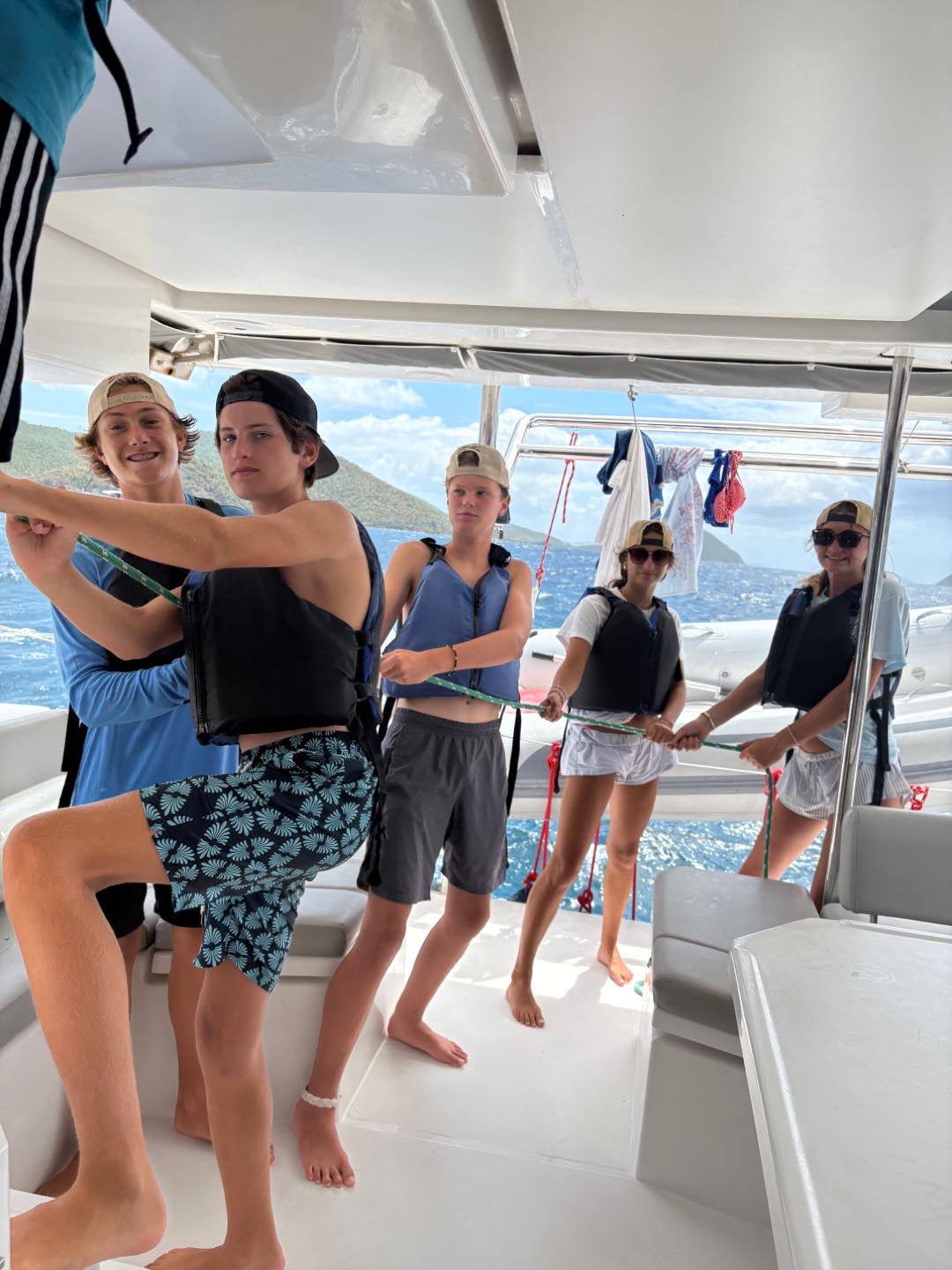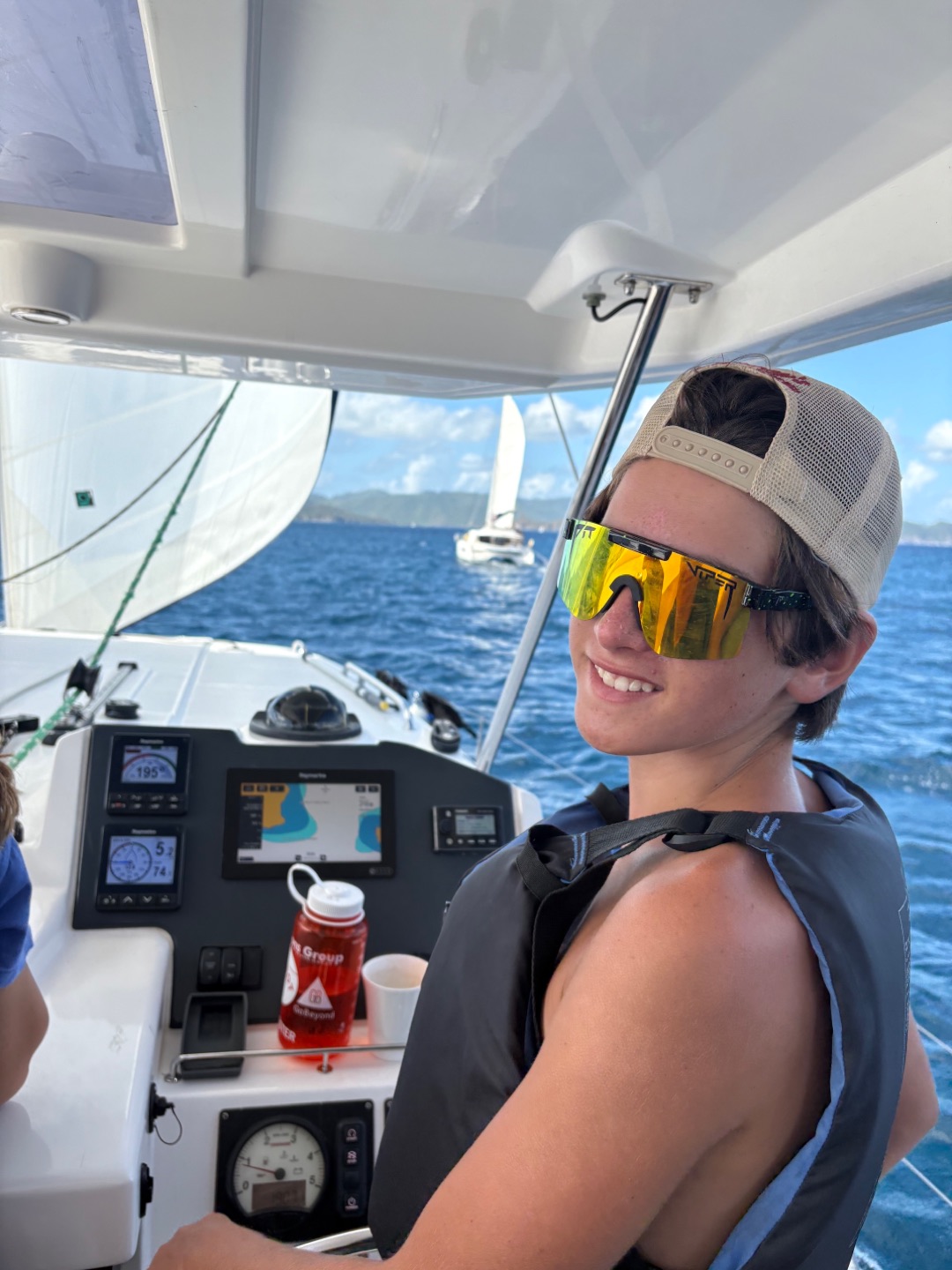 Today was race day, so we had to eat breakfast quickly, and at 9 a.m., all the boats lined up and raced to West End, the port we left from on the first day. Hope came in as the second catamaran; we were after Oryx and just in front of Eolé. Robert was at the helm, and I was helping with lines in the power tower. Wyatt came up with a dress code, which was inside-out PFDs, backwards ball caps, and cool sunglasses. After the first race, we went ashore and ate lunch at a restaurant, and then shopped. After we got back on the boat, we prepped for the second race. Elliot was driving the boat in the race. The race was upwind, so we had to tack a lot. We also had to unfurl and switch the jib very quickly, so in order to do that, we had a team of everyone who didn’t already have a job in the dining area with the jib sheet, and they pulled it so quickly that we didn’t need to winch it in. In the second race, we won 3rd place. We had chili for dinner, and tonight we need to sleep with life jackets because we are leaving at 4 in the morning tomorrow.