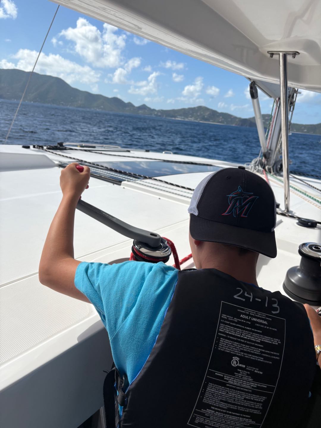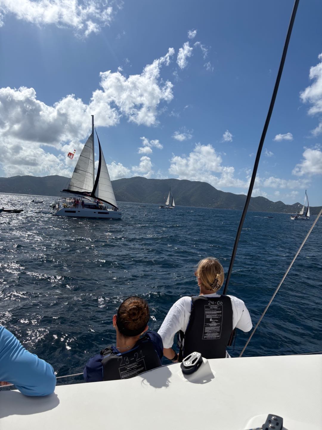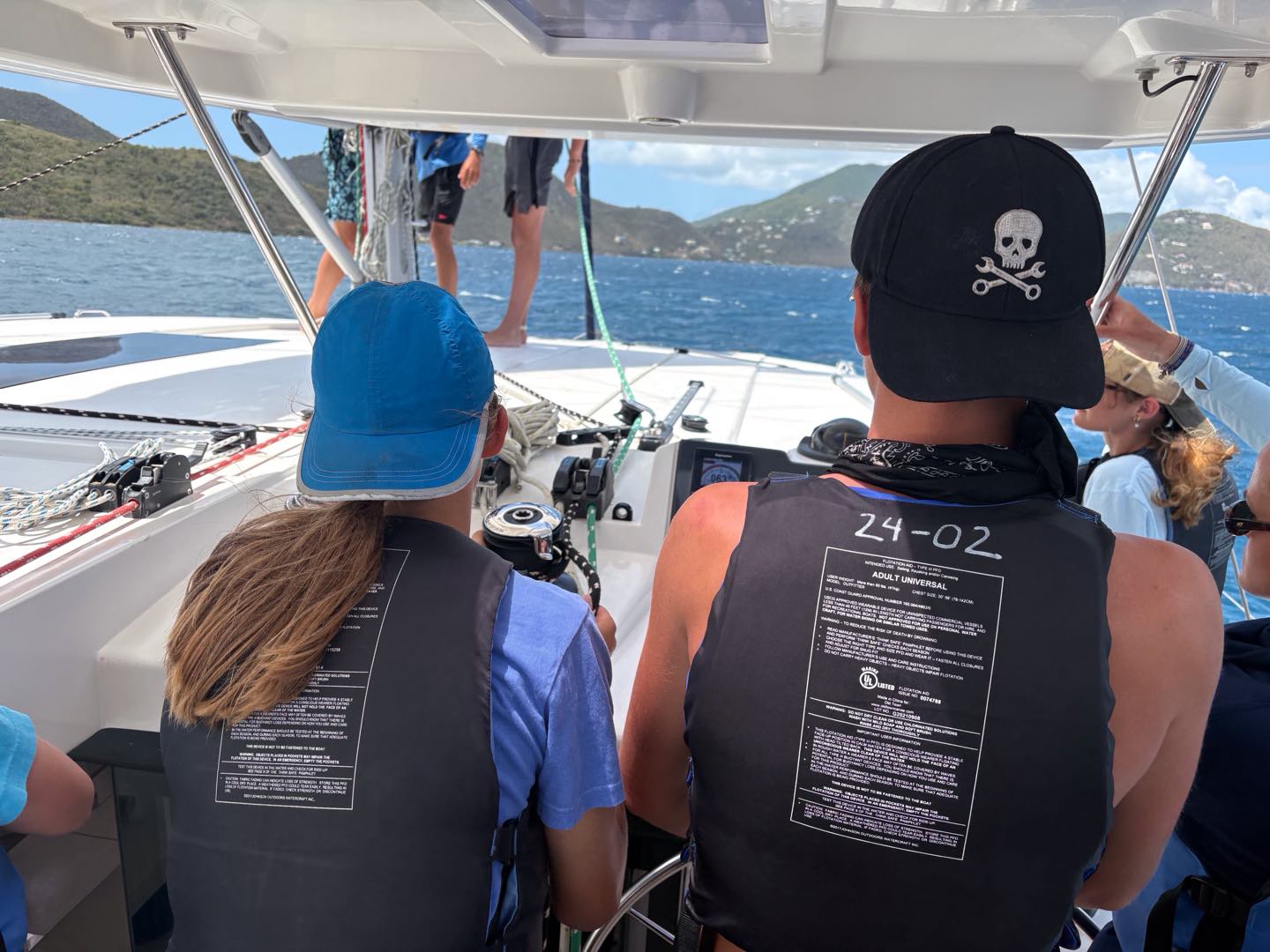 Today was race day, so we had to eat breakfast quickly, and at 9 a.m., all the boats lined up and raced to West End, the port we left from on the first day. Hope came in as the second catamaran; we were after Oryx and just in front of Eolé. Robert was at the helm, and I was helping with lines in the power tower. Wyatt came up with a dress code, which was inside-out PFDs, backwards ball caps, and cool sunglasses. After the first race, we went ashore and ate lunch at a restaurant, and then shopped. After we got back on the boat, we prepped for the second race. Elliot was driving the boat in the race. The race was upwind, so we had to tack a lot. We also had to unfurl and switch the jib very quickly, so in order to do that, we had a team of everyone who didn’t already have a job in the dining area with the jib sheet, and they pulled it so quickly that we didn’t need to winch it in. In the second race, we won 3rd place. We had chili for dinner, and tonight we need to sleep with life jackets because we are leaving at 4 in the morning tomorrow.