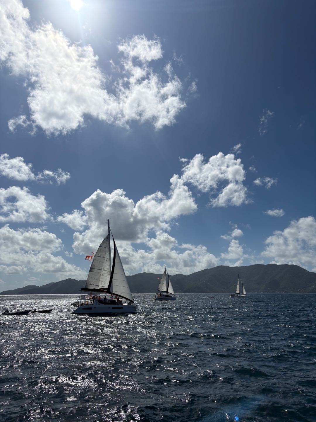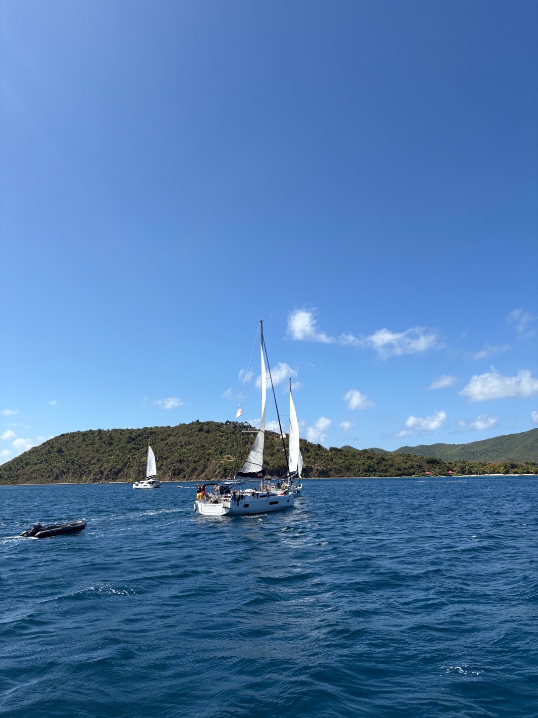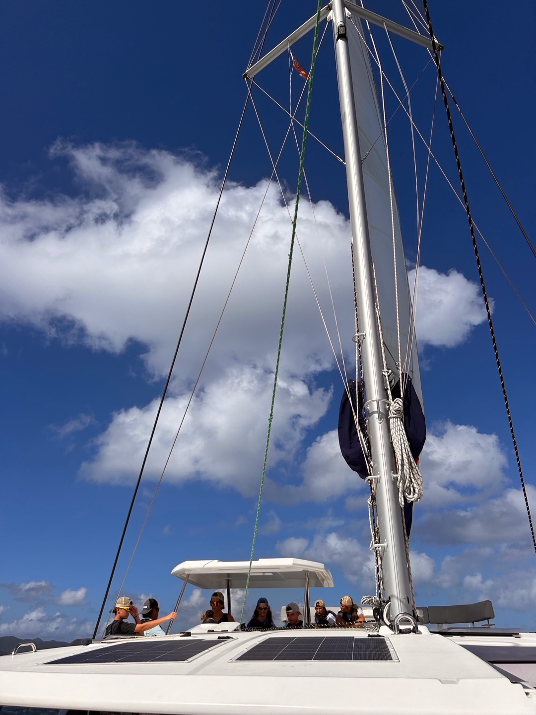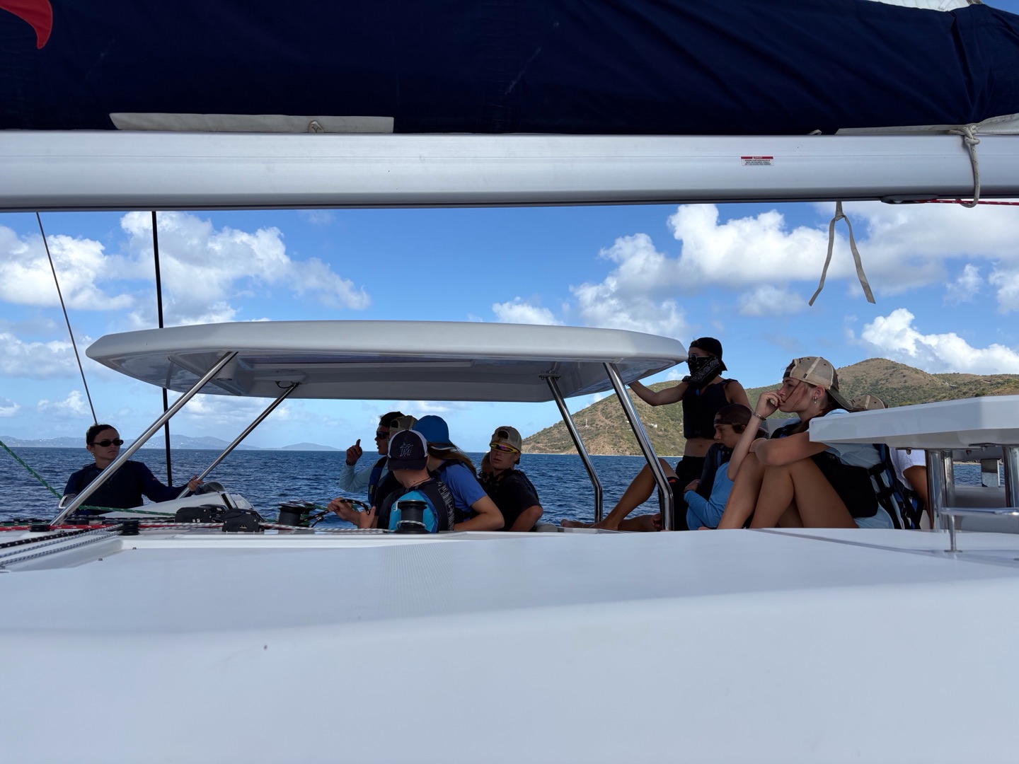 Today was race day, so we had to eat breakfast quickly, and at 9 a.m., all the boats lined up and raced to West End, the port we left from on the first day. Hope came in as the second catamaran; we were after Oryx and just in front of Eolé. Robert was at the helm, and I was helping with lines in the power tower. Wyatt came up with a dress code, which was inside-out PFDs, backwards ball caps, and cool sunglasses. After the first race, we went ashore and ate lunch at a restaurant, and then shopped. After we got back on the boat, we prepped for the second race. Elliot was driving the boat in the race. The race was upwind, so we had to tack a lot. We also had to unfurl and switch the jib very quickly, so in order to do that, we had a team of everyone who didn’t already have a job in the dining area with the jib sheet, and they pulled it so quickly that we didn’t need to winch it in. In the second race, we won 3rd place. We had chili for dinner, and tonight we need to sleep with life jackets because we are leaving at 4 in the morning tomorrow.