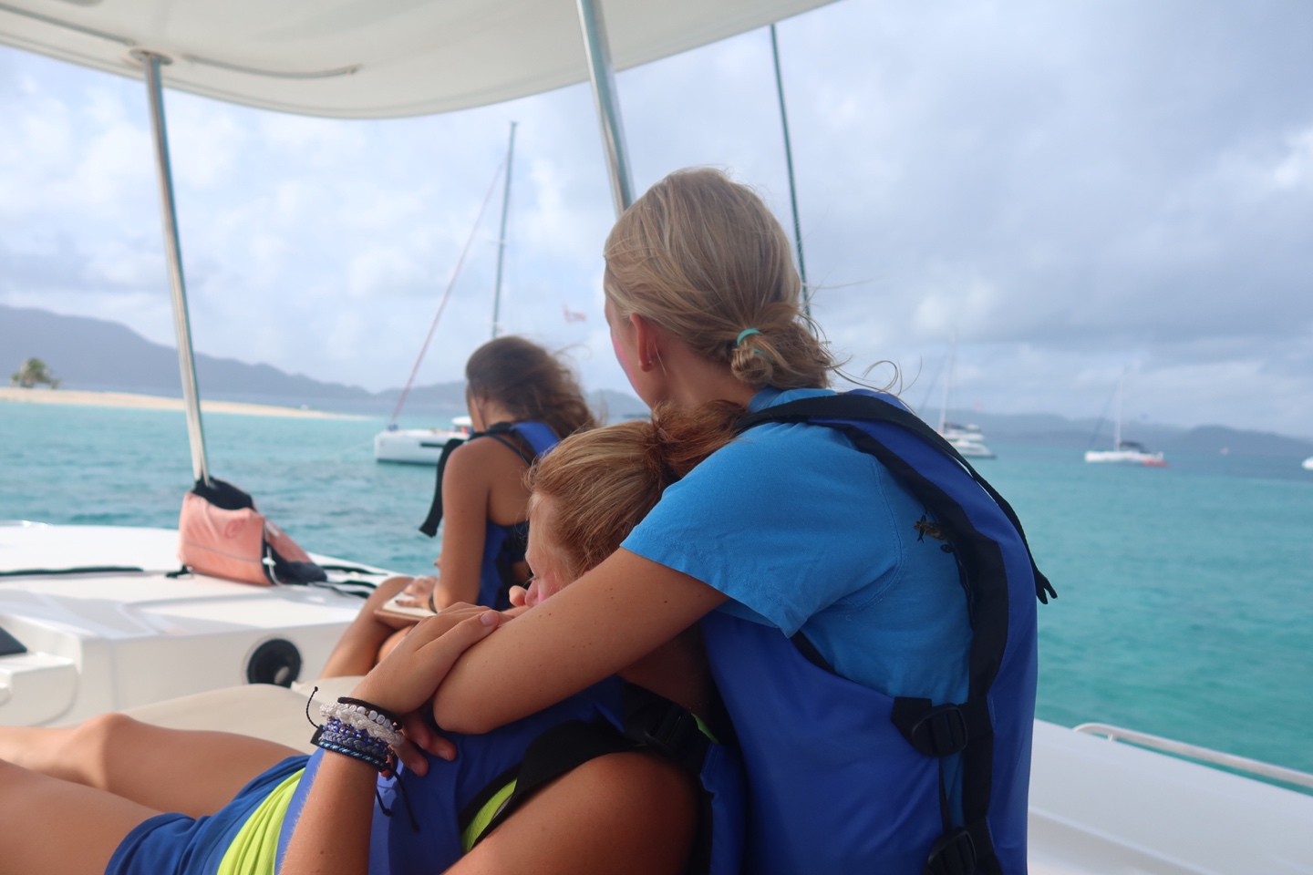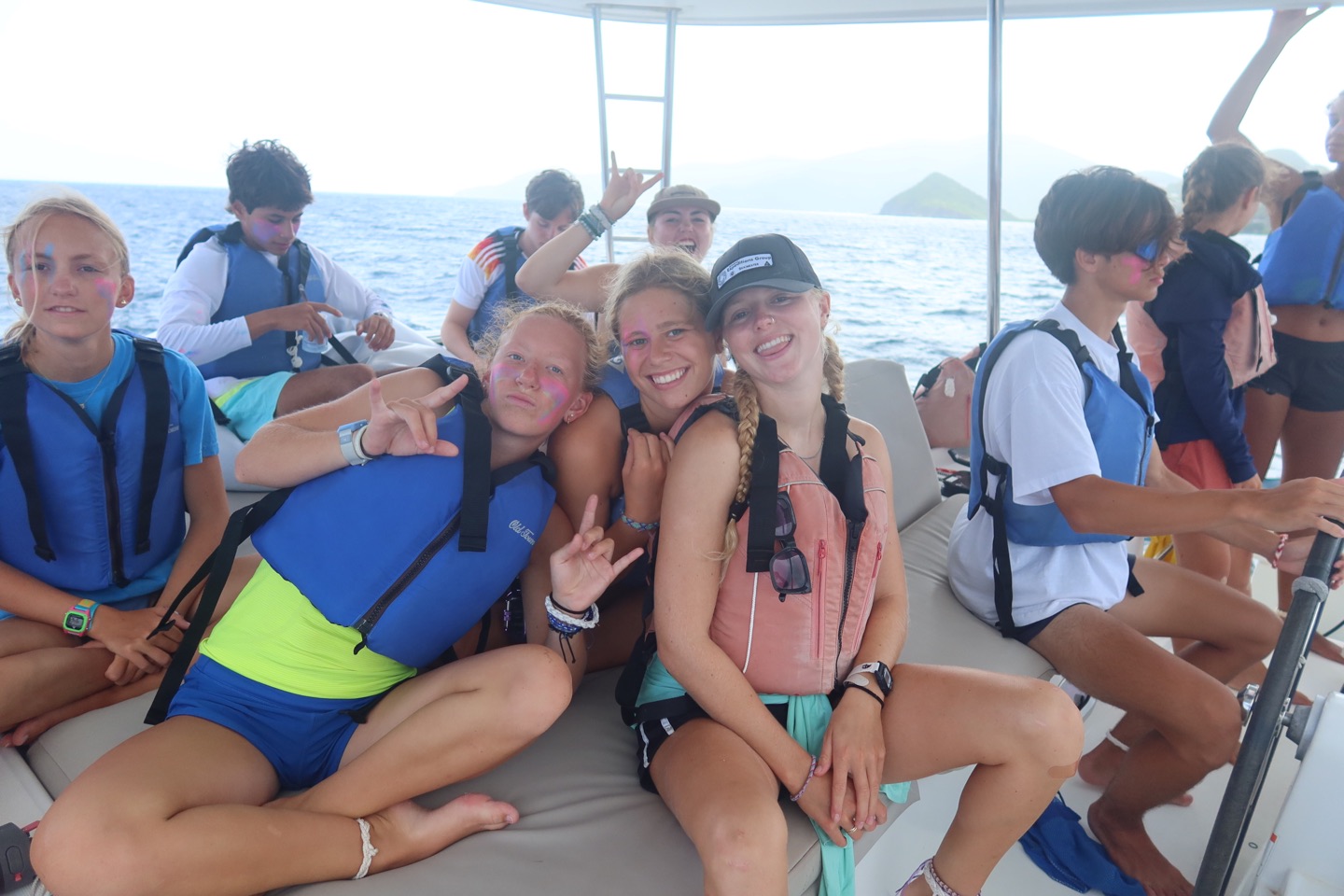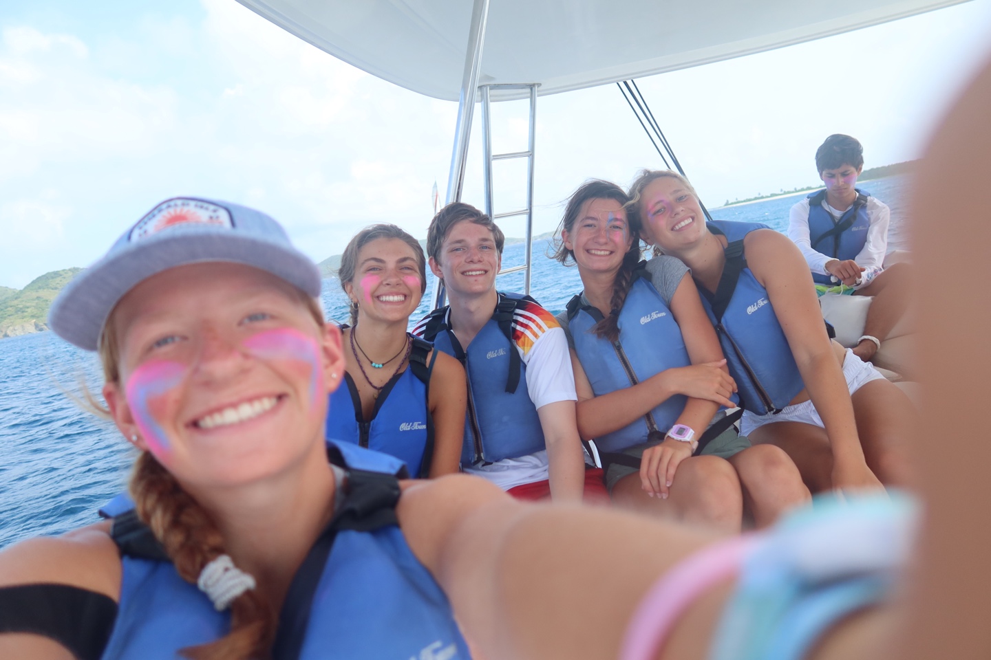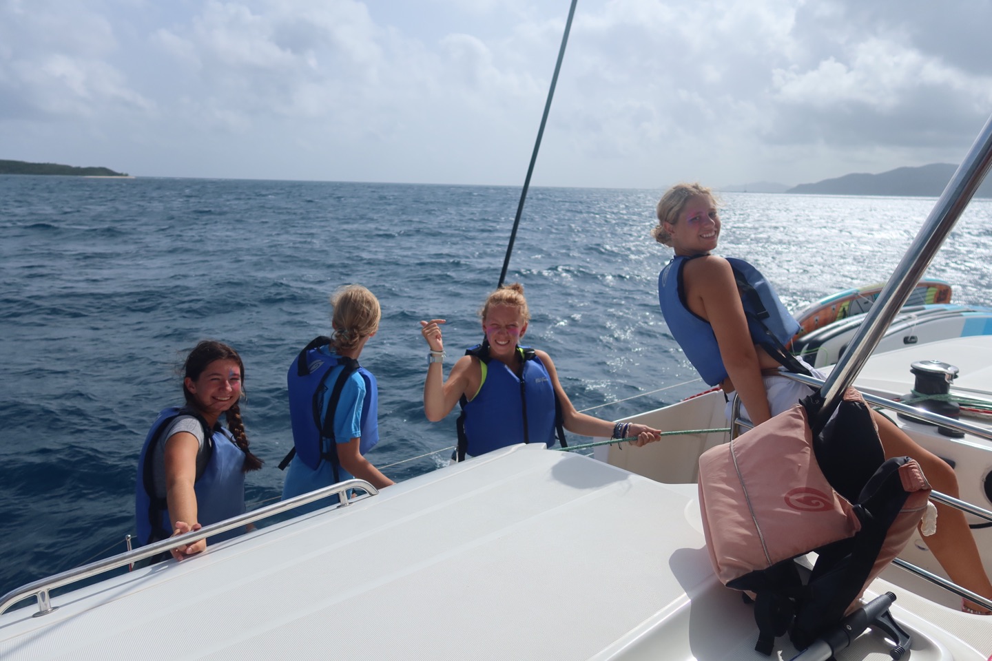 We then docked at West End to grab lunch. Our whole table had pizza except for Nate, who had a below-average fish sandwich. The pizza was 6/10, kinda sweet for some reason. After shopping at Arawak and getting snacks, all of AQ was summoned together by Big Boss Mike, who informed us of some scary news: a storm was brewing up, and it was headed for the BVI. That meant that we would have to motor to the Moorings base camp to dock for the night in case we got hit by the potential storm. The way there was an adventure through waves that were so high they peered over our bow. Taking advantage of the situation, Sophia, Kayla, Nate, Maddie, Grace, Nat, and I lay on netting up front to be almost drowned by the waves (in a fun way). We needed the day off, but having our second Mexican night and having our daily squeeze. In conclusion, Avizia had an action-packed day filled with fun and a bit of stress, but just like any other day, we moved on and looked forward to the next day and what it had to offer us.