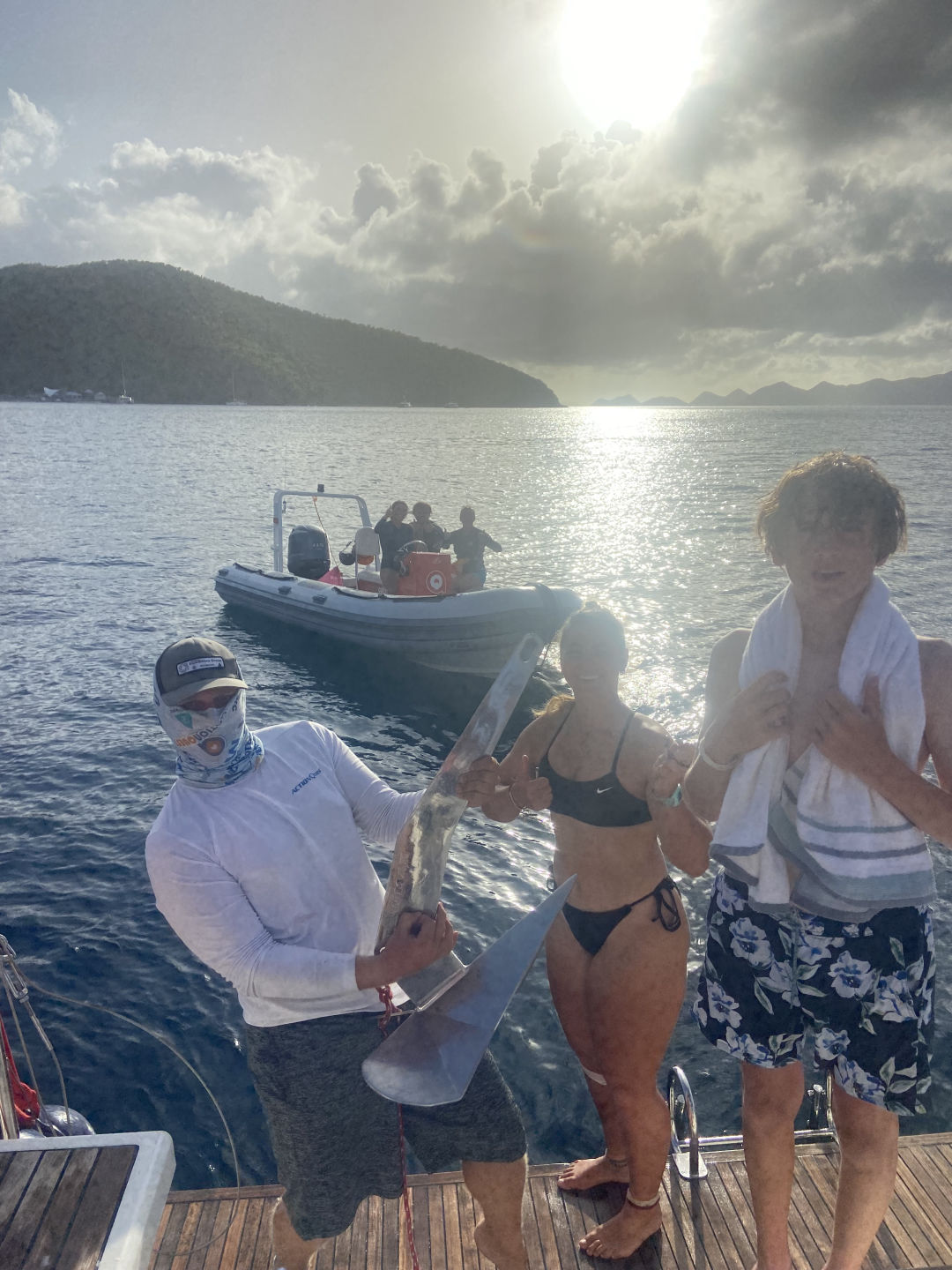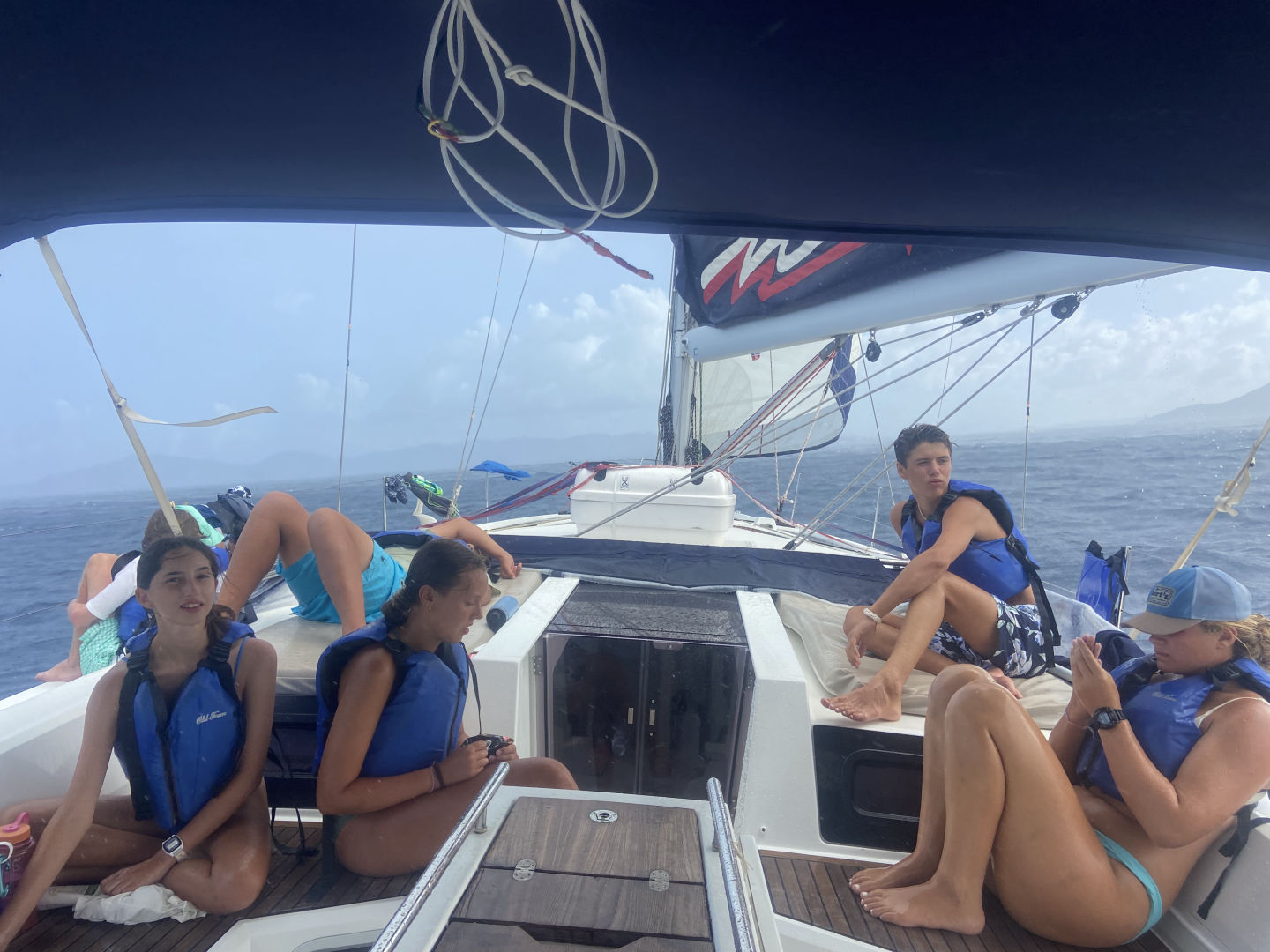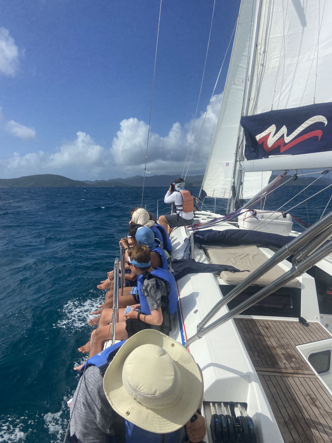 Hello, I am Cameron, and I am the skipper of the day. Our day started when we all woke up at seven sharp. We had eggs and french toast for breakfast, but Amelia and I had a skipper’s meeting for the races ahead of us for today. Then after dishy pit was done and the deckies(Conrad and Sienna, but Sienna was at the clinic for half of the day and missed the first race) cleaned the cockpit, we headed to the first drag race. We were the seventh boat on the Leeward side in the middle of our two rivals, Avisia, and second wind. The official start was 8:30, with Caitlin at the helm, Giles and I unfurling the jib, and the rest of the crew hiking. We started in 4th place and had a steady race for the whole race. A boat ahead of us had its main sail rip during the race, and Avisia did not cleat its dinghy on, and it floated away at the start of the race. We finished 7th out of 9 boats, and the ripped sailboat still beat us sadly, but we did our best. We then headed to shore at West End, Tortola, where we started the beginning of the trip. We had shore time for 2 hours, and that is when all of the students called their loved ones and friends. Amelia and I then had another skipper meeting about the next race of the day, and we ended up with the best possible starting position. We then headed off, and we started the race with a rough start, not being able to put the jib on us as fast as we should have, but we made up for it later. The race was a bit upwind, so tacking was very crucial in doing well in this race. Conrad was manning the main sheet and kept us steady for the whole race. Arhan was on jib sheet duty and was one of the fastest people to winch today.