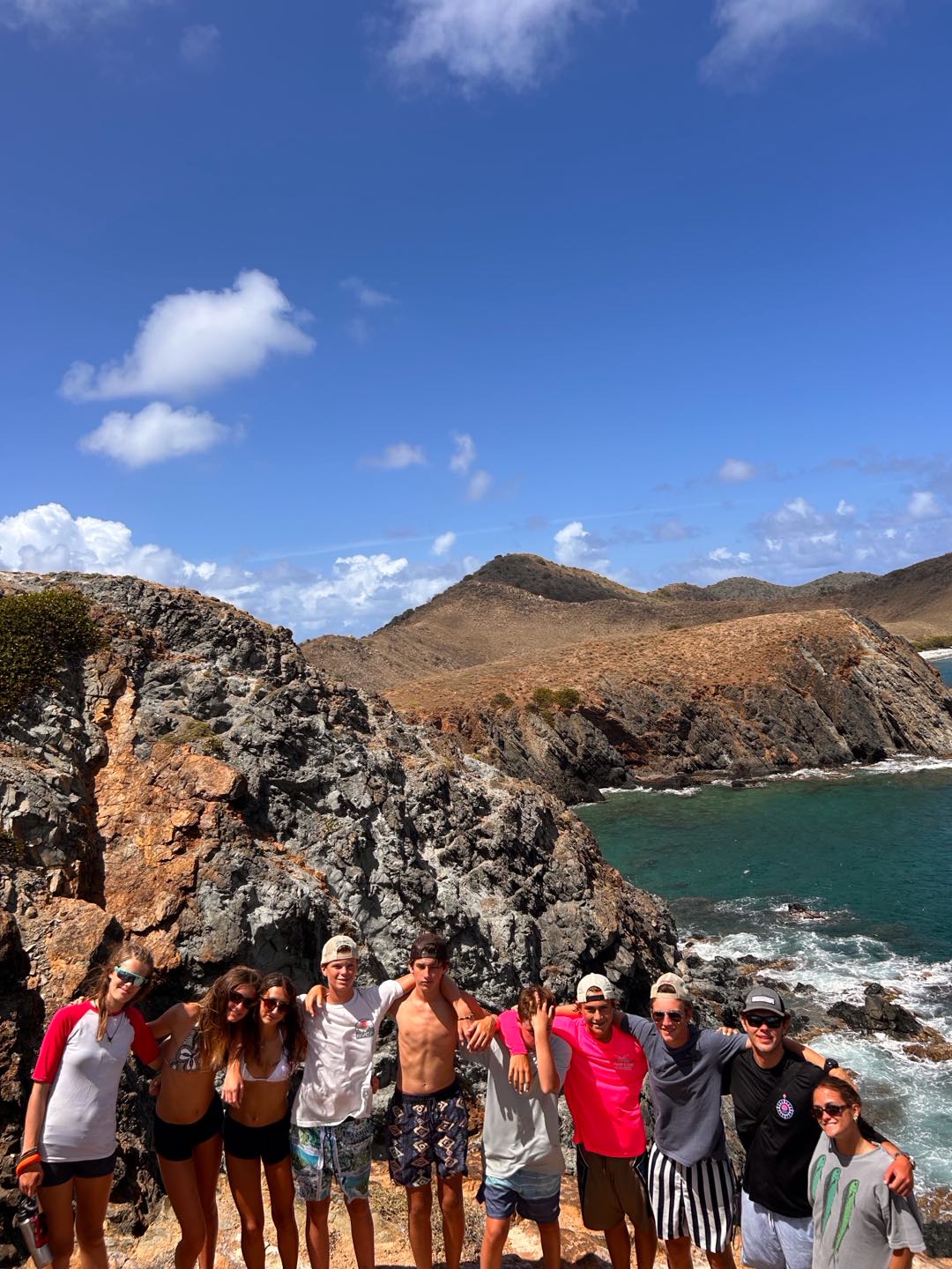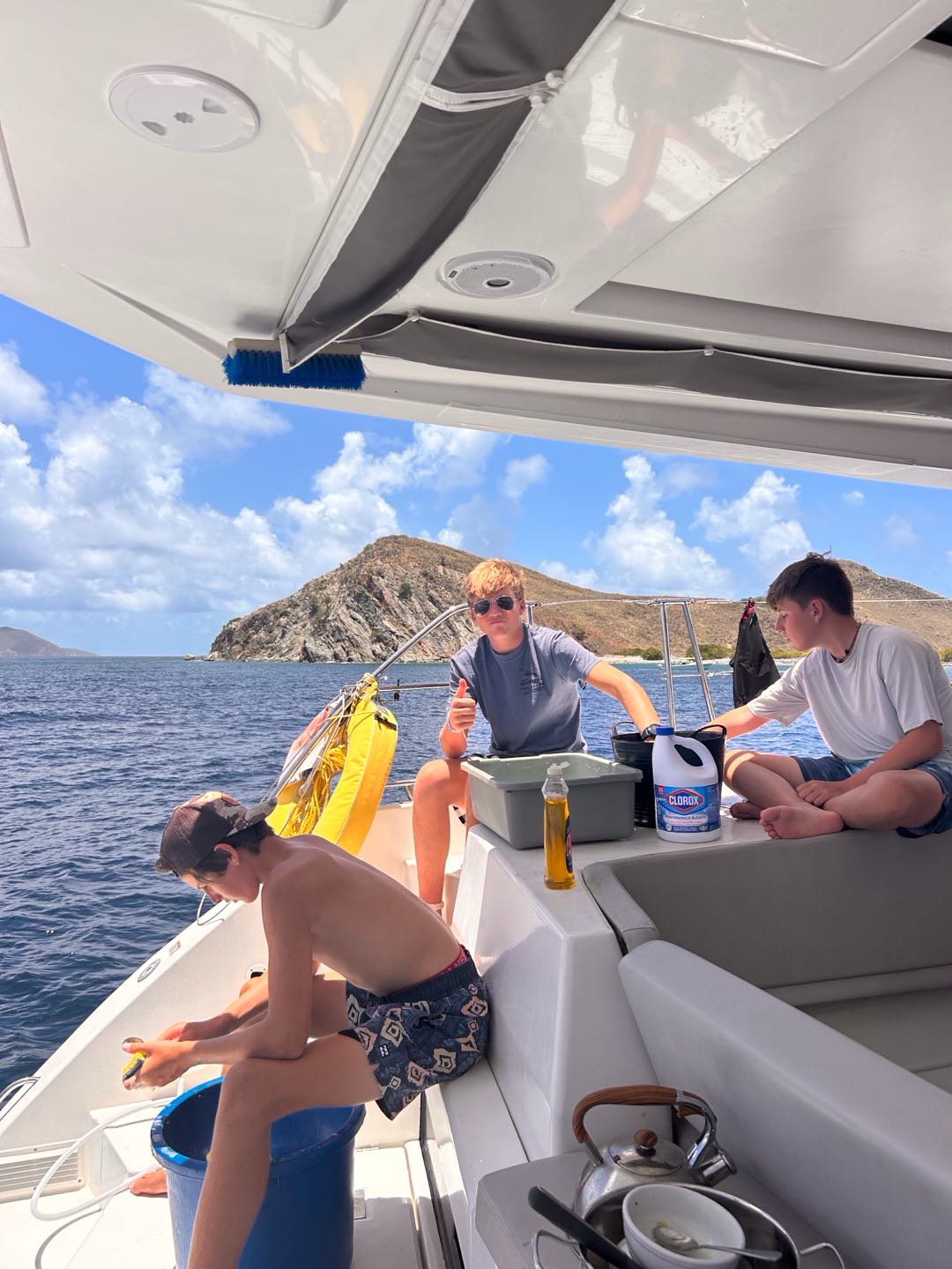 After that, we went on a hike, and afterwards, we began our epic prank that we had planned all day. We took the dinghies over to Glad 2 Be Here and tied all of their pots and pans and water bottles and stuff to the main halyard and hoisted it up super high. Then we hid all of their PFDs in the sail bag and hid all of their silverware above the cabinets in their galley. The best part about it is that we got to see their reaction and then drive off very fast in the dinghy. After we got back to the boat, we got underway and headed for GHP Bay for the mega raft, which was where all of the sailside boats rafted together. After dinner (Mexican night) and a surprise dive chat and a sail chat, everyone hung out on all the boats, and it was super fun. Then we all went to bed and had a good sleep.