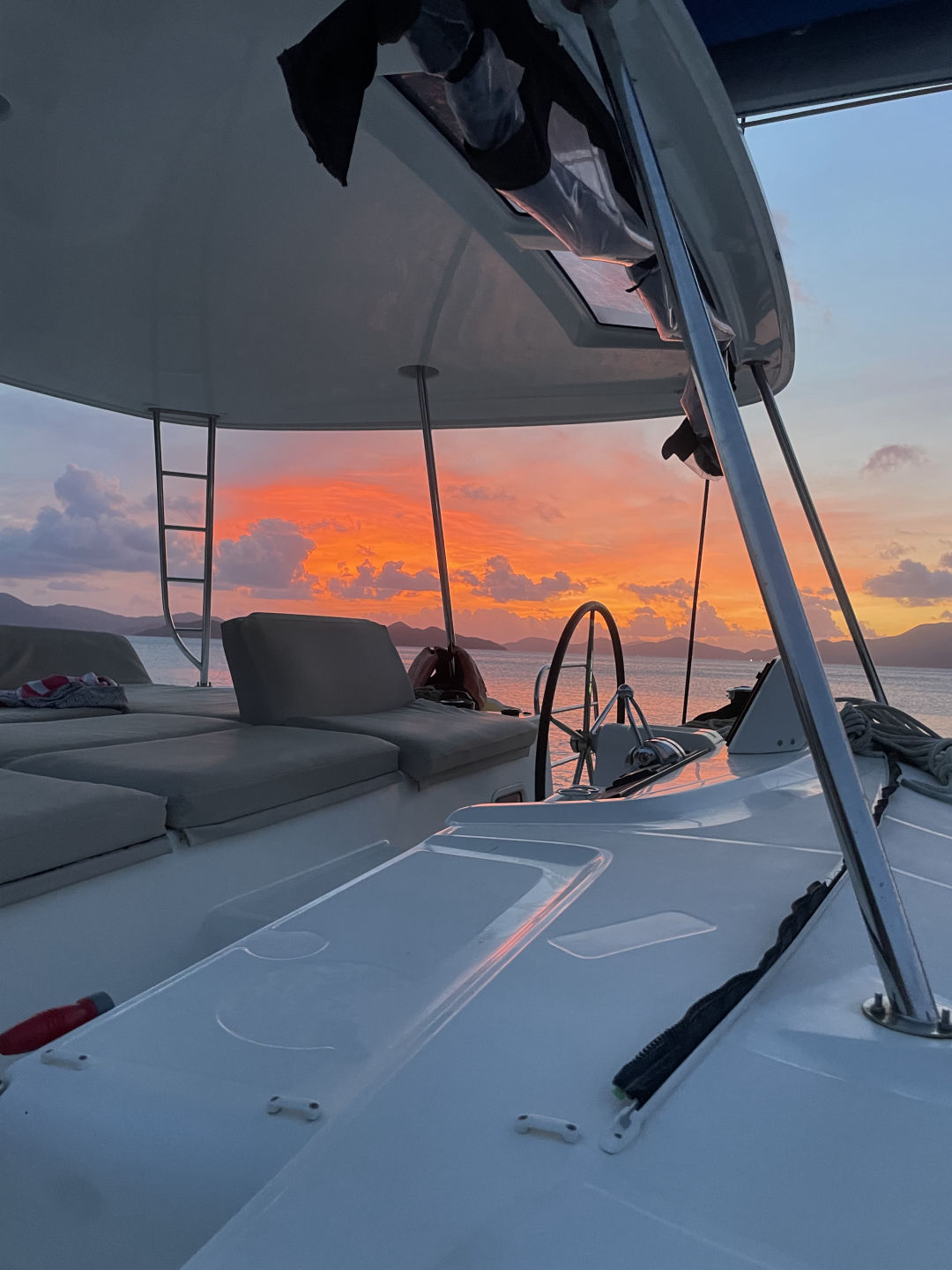 Today our staff woke up at 3:30 am to drive us to the Rhone wreck dive site, the spot of our final dive for the trip and our first dive as certified advanced open water divers. We slept at the place where the Rhône’s anchor lies, and we motored through the same route that the crew of the Rhone went through on the night of the explosion of the ship. The staff went on a dive at 6 am to scout the site, and the whole boat woke up and sat up on the hardtop to speak. When the staff came back, they started playing sandstorm to motivate us for what would be, in my opinion, the best dive of the trip by far. We were all very hyped for the dive as we set up our gear, and we started the dive on a great note. We split ourselves into three groups for the dive; the first group was Luke, Blake, Brendan, and me. The second was Cobrin, Louella, and Evan, and the third was Scarlett and Matthew because Micah was not able to dive with us. We descended about 100 feet from the shipwreck, and as we swam closer, the bow became uncovered. We hovered around the wreck for a while and then penetrated a hole in the hull. It was a relatively small hole, and our instructors were impressed by our finesse while swimming through it. We later swam to the stern of the ship, which was broken off from the bow, and swam through the propeller and rudder of the ship, which was enormous and about 15 feet in diameter. My group saw a ginormous lobster, and Matthew and Scarlett saw a spotted morray peeking through the coral. We ended the dive, and everyone was equally impressed and amazed. We later went to another boat in the AQ fleet to take our sailing exams, some of us the advanced and others the basic. We went on a hike on Salt Island, where we saw amazing views of the ocean, and Scarlett even said it was her favorite spot in the BVI’s. There were also some very interesting conversations had on the hike. We had ramen for lunch on another boat and later went back to our boat and relaxed and conversed as other students from Mango Tango did their Rhone dive. We got ready to head back to where the anchor of the wreck is to do a mega raft and we struggled to connect ourselves to a hurricane mooring ball that would hold the weight of the whole sail side a fleet. Luckily we had very willing and helpful shippies, including Luke, Micah, Violet, Brendan, and several others at times, who made the process much smoother. We had fun with the other boats and went to sleep a little later than usual.