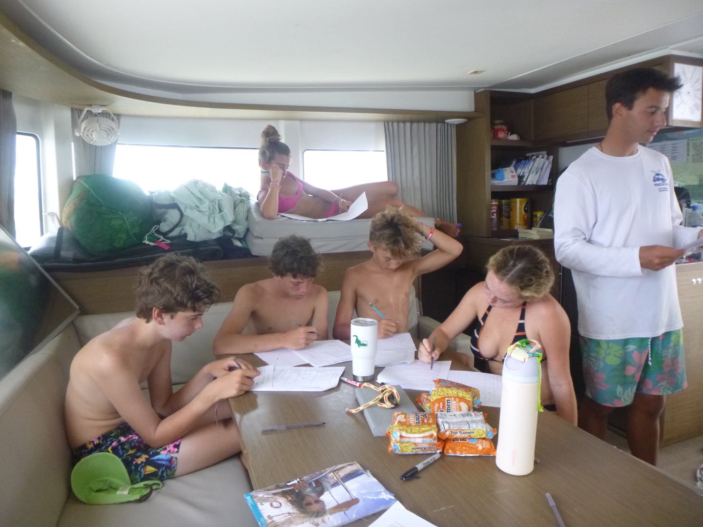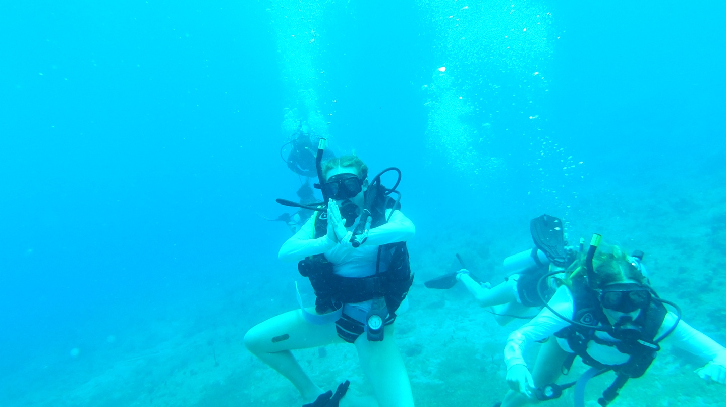 Amaya and I saw two lobsters, a ton of cool fish, and the huge anchor sitting next to the ship. It was sooo cool. After our dive, we came back and had ramen, which was good, but it wasn’t good today because it was like 100 degrees outside. Pearl and I filled up our water bottles and came to sit outside and try and get a good tan, which we did. My face got fried, probably because I forgot to reapply sunscreen! My all-time favorite part of the day today, and I think a few other people could agree, was definitely doing flips off the dinghy and the stern of the boat. I could do a front flip, but I wanted to learn how to do a backflip. Cam taught me how to, and I kind of just went for it off the dinghy, and I realized it wasn’t even that hard. It took me a while to do it off the stern, but I’m super excited I finally got it.