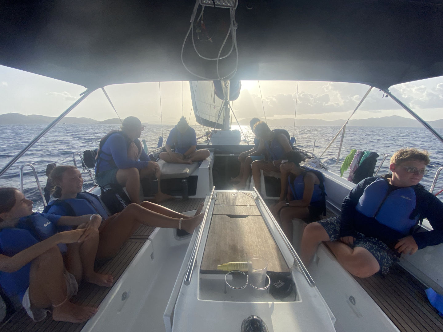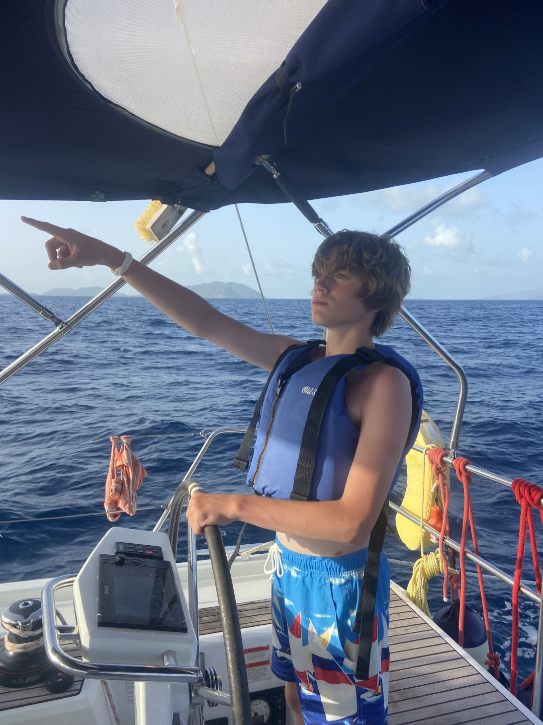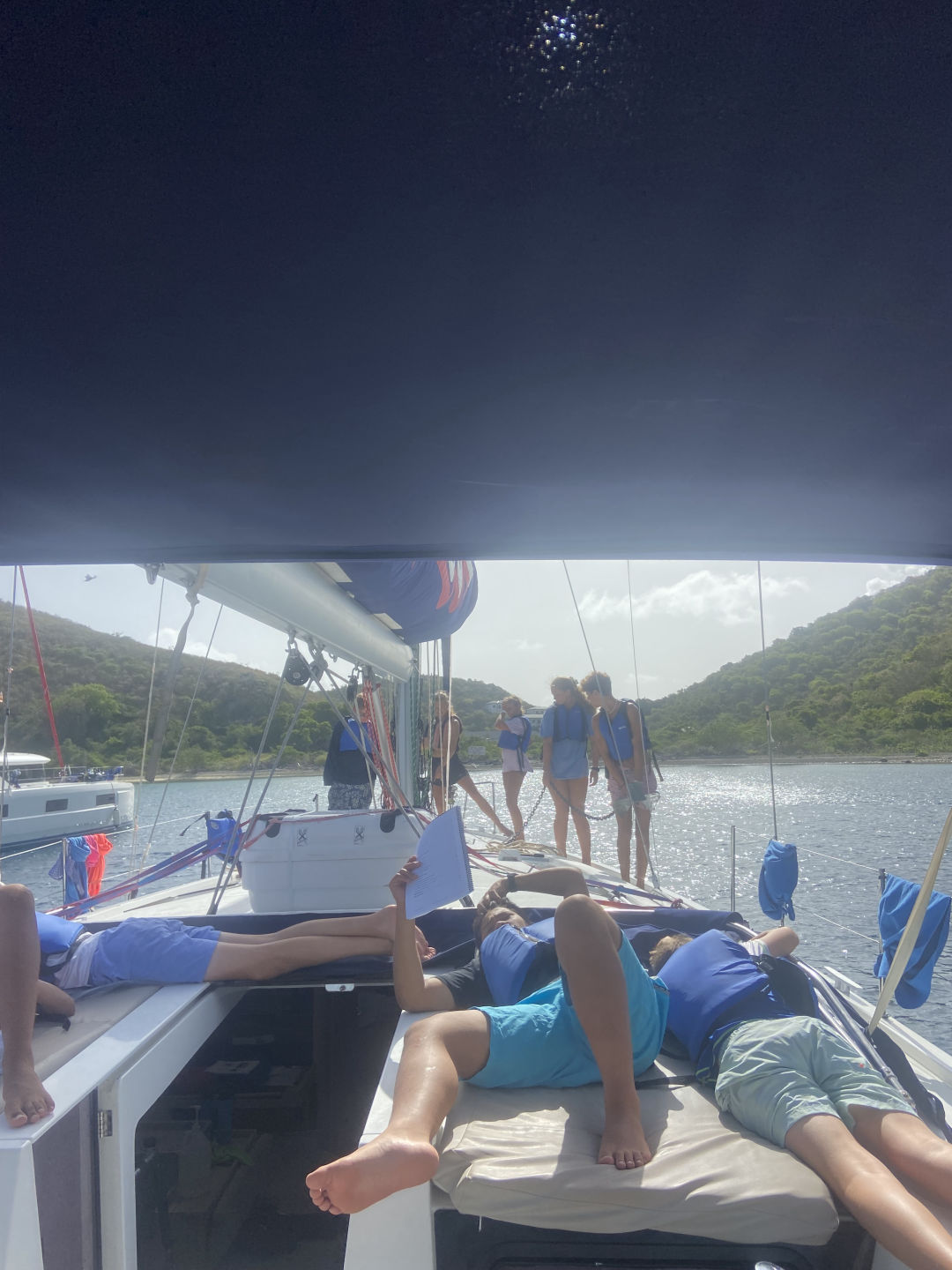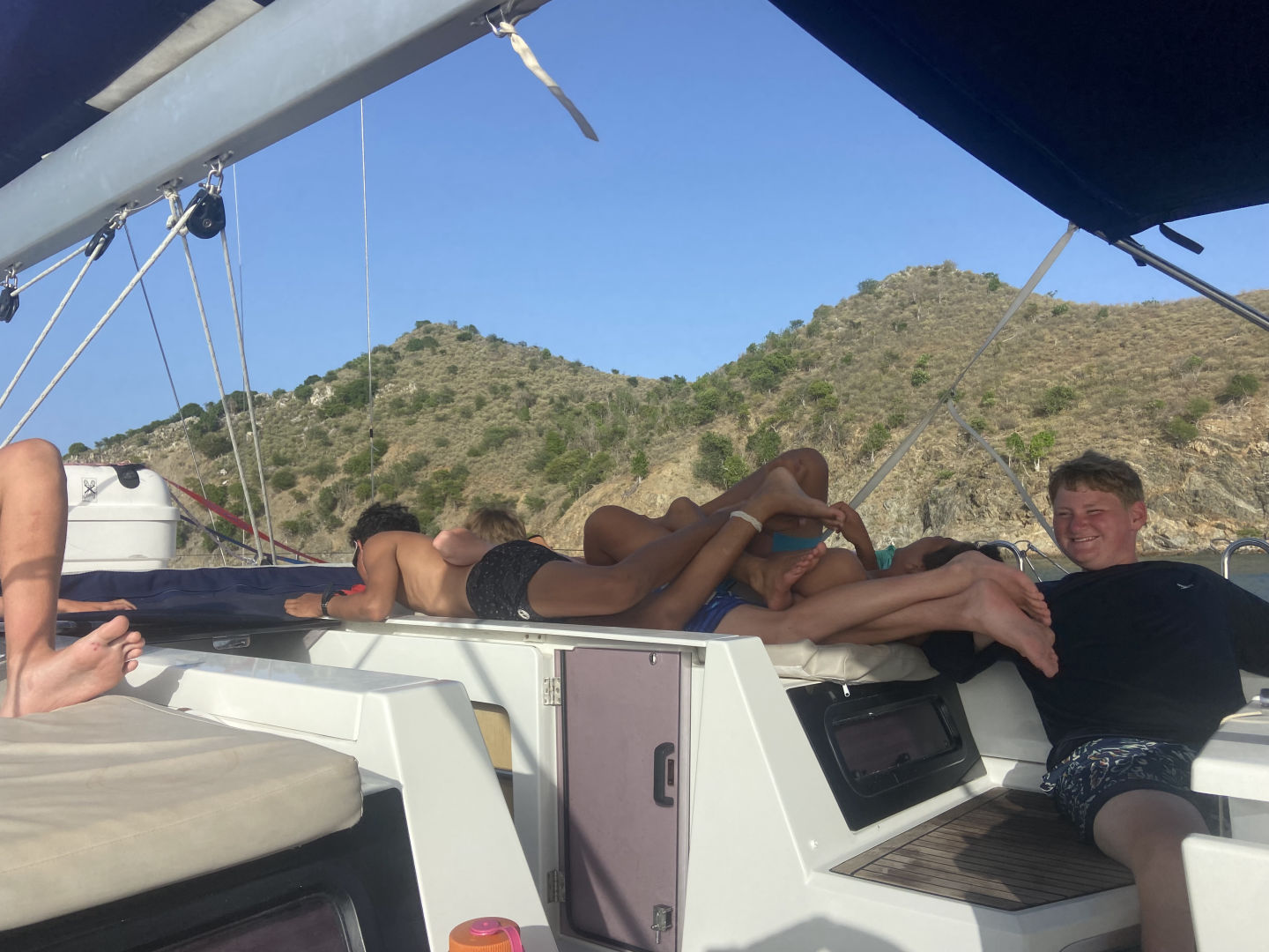 We finally got to the top of the hill, and we also saw Friendship‘s group, and we both had an amazing view of the ocean, and where Noah got a very cool photo while sitting on the edge of the rocks. We made our way down, where we saw Second Wind‘s group, and we swam in the ocean for 45 minutes, where an intense chicken fight ensued with me and Adnan, Cameron and Giles, Caitlin and Sienna, Jacob and Noah, Jasper also with Cameron, and Conrad also with Adnan. It was a tough fight, and the winner was undecided. We made our way back to our boat, where we chilled, swam, some slept, and Arden prepped dinner. We then made our sail to __. It was a short sail with music and fun. As we arrived, we ate breakfast for dinner and then did a squeeze. As I am the skipper, for the question of the day, I chose What was your childhood nickname. As an example, Alexa‘s nickname as a kid was Lex. We then got started dishy pit and decky and overall just cleaning the boat. And now, here I am, writing as your skipper of the day. Thanks for reading. Until next time.