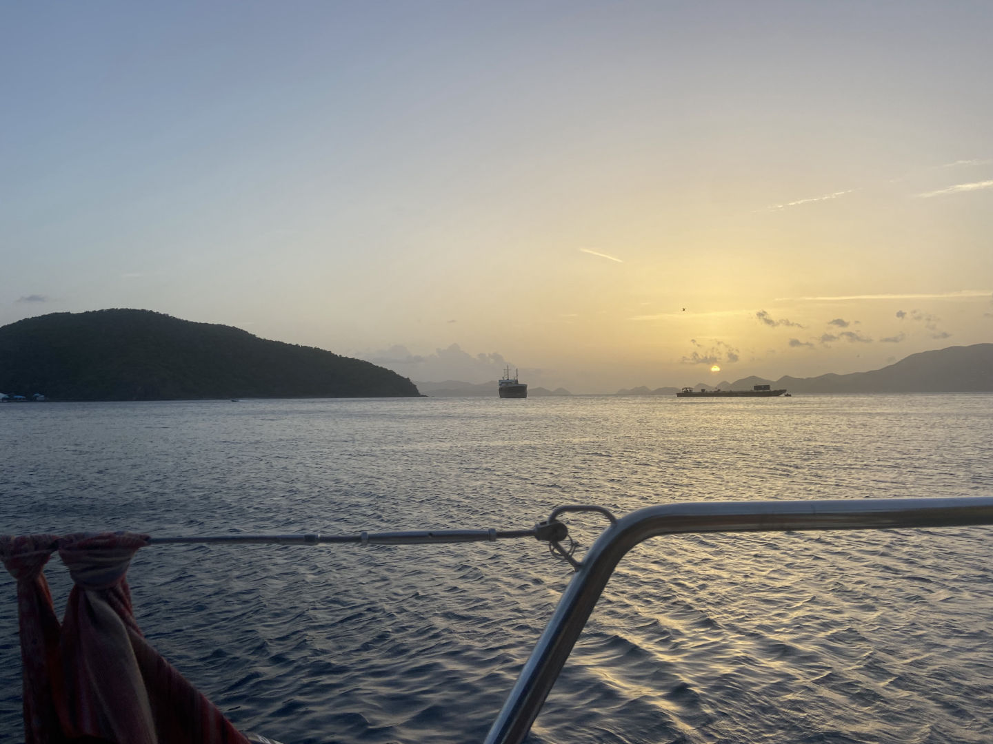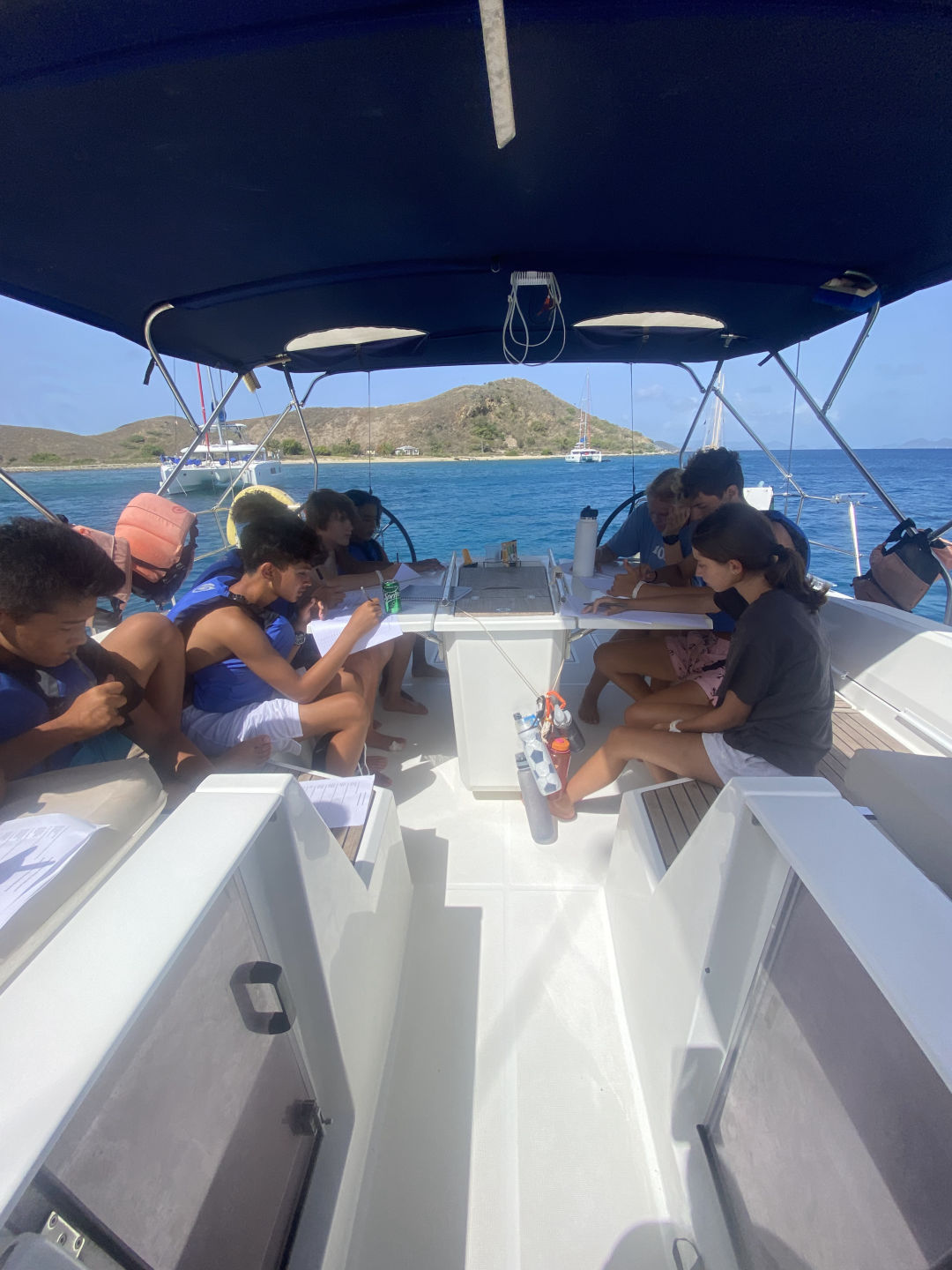 Hi, my name is Arhan, and I am your skipper for day 14. We had a very fun day starting off with a late wake-up call at 7:30. Conrad and Sienna, being the chefs, brought out oatmeal for breakfast, which everyone enjoyed before we started sailing towards Salt Island. Our short journey was but an hour. Upon arrival, we took our sailing exam, which went well, especially for Lily, who got the highest score on the test. A few minutes after the exam, we took a dinghy to another boat in the fleet called Second Wind. We then dove off there and saw a very cool shipwreck from the 1800s called The Rhone. The Rhone is a big shipwreck ranging from 20-100ft and would take 2-3 dives to fully complete, but we had a good time with just one. We reached a maximum elevation of 60ft and swam around.