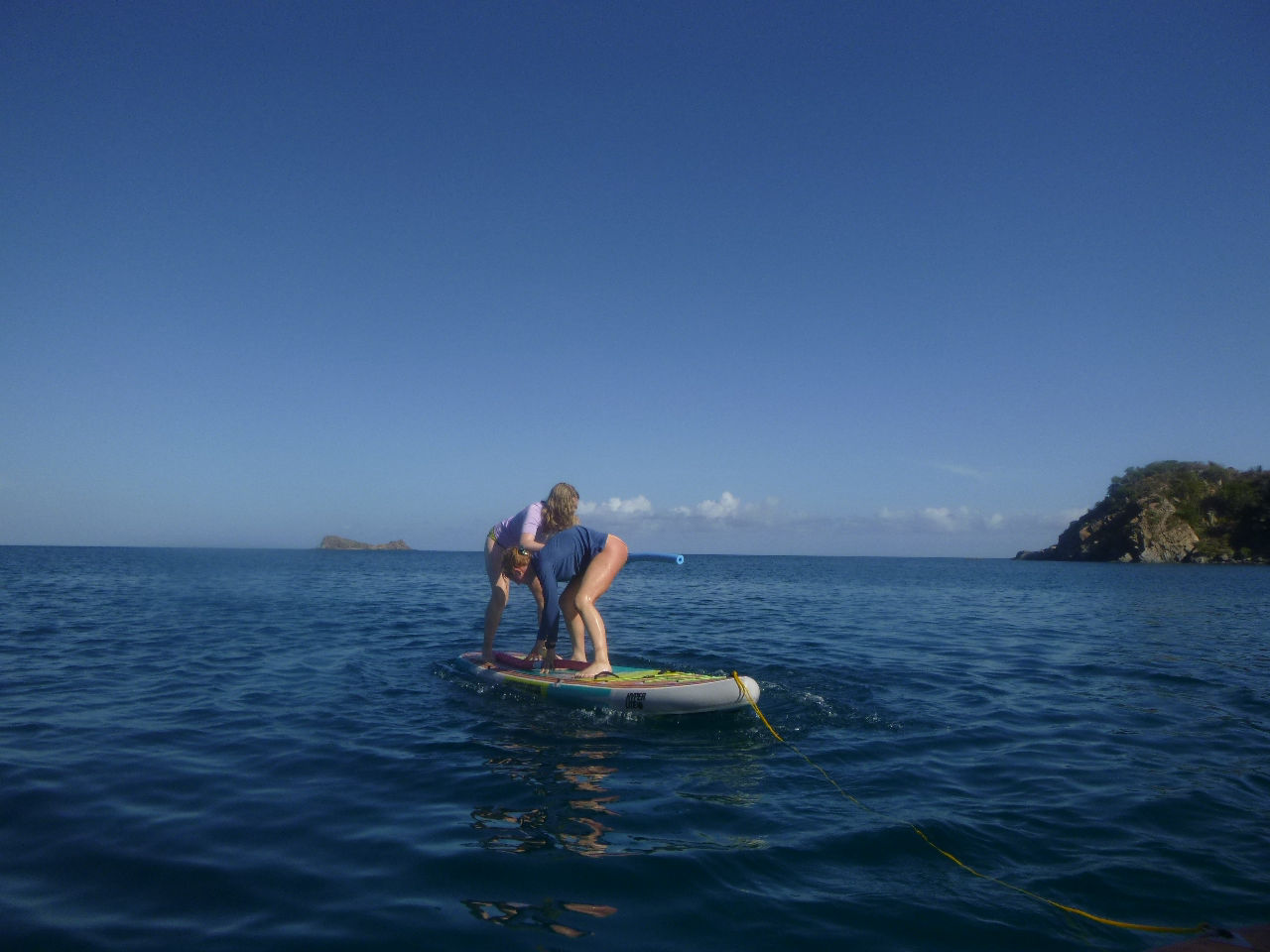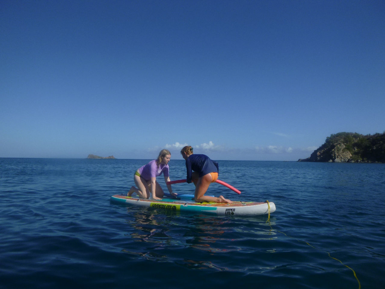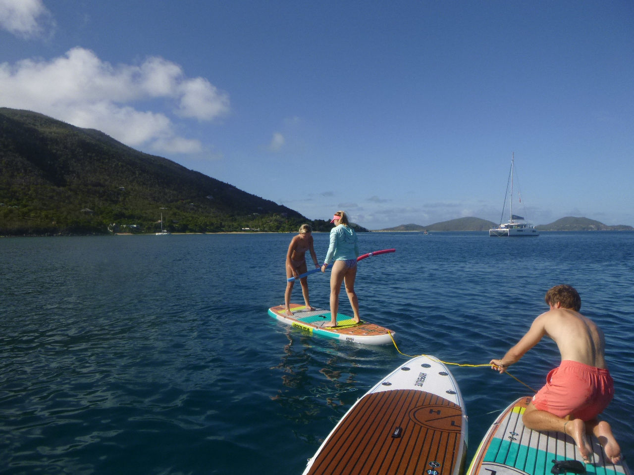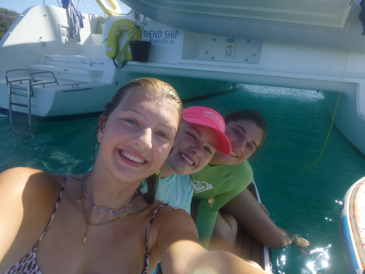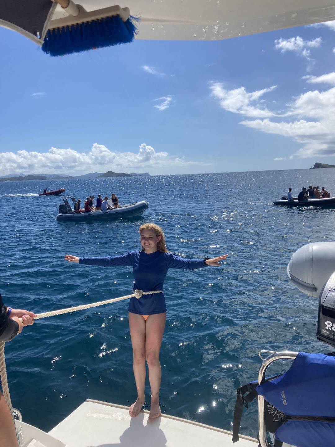 Day four for the Nomada Caribena crew was an exciting accumulation of various adventures! At five in the morning, we awoke to the sound of a surprise simulated rescue dive for our three dive masters, Georgia, Ned, and Lauren. Georgia and Lauren promptly jumped overboard in their pajamas off the bow and swam out to rescue one of the crew members who had pretended to be an unresponsive diver while Ned proceeded to take down his hammock. After the rescue, we started our main activity for the day, which included a rotation of various activities on the other ActionQuest boats. First, we went over to another boat and used the paddle boards. It was super fun, especially when we had a standing competition to see who could stay on the board while fighting to get another person off. The winner of the competition was Maude, who surprised us with her extremely competitive spirit and calculated strategies to knock people off, while Lucas and Harry made everyone laugh with their battle. After that, we rotated to another boat, where we tried various water sports, including wakeboarding, kneeboarding, and water skiing! Everyone had a super fun time, especially Aubrey and Lana in kneeboarding, Stella wakeboarding, and Issy, who succeeded in water skiing for the first time by adapting what she calls “butt skiing”. Next, we learned how to tie various boat knots and had an exciting competition to see which team could tie them the fastest. Towards the end of that rotation, Maude tied the rope around her while Kate held her over the boat. She then accidentally dropped her into the water, giving everyone a good laugh. Lastly, we learned to dive in groups while the dive masters assisted us. We ended the night by sharing our favorite parts of the day and all dancing to “the wobble”. Overall it was a super fun and interesting day where we all tried a new activity and promptly grew closer as a group!