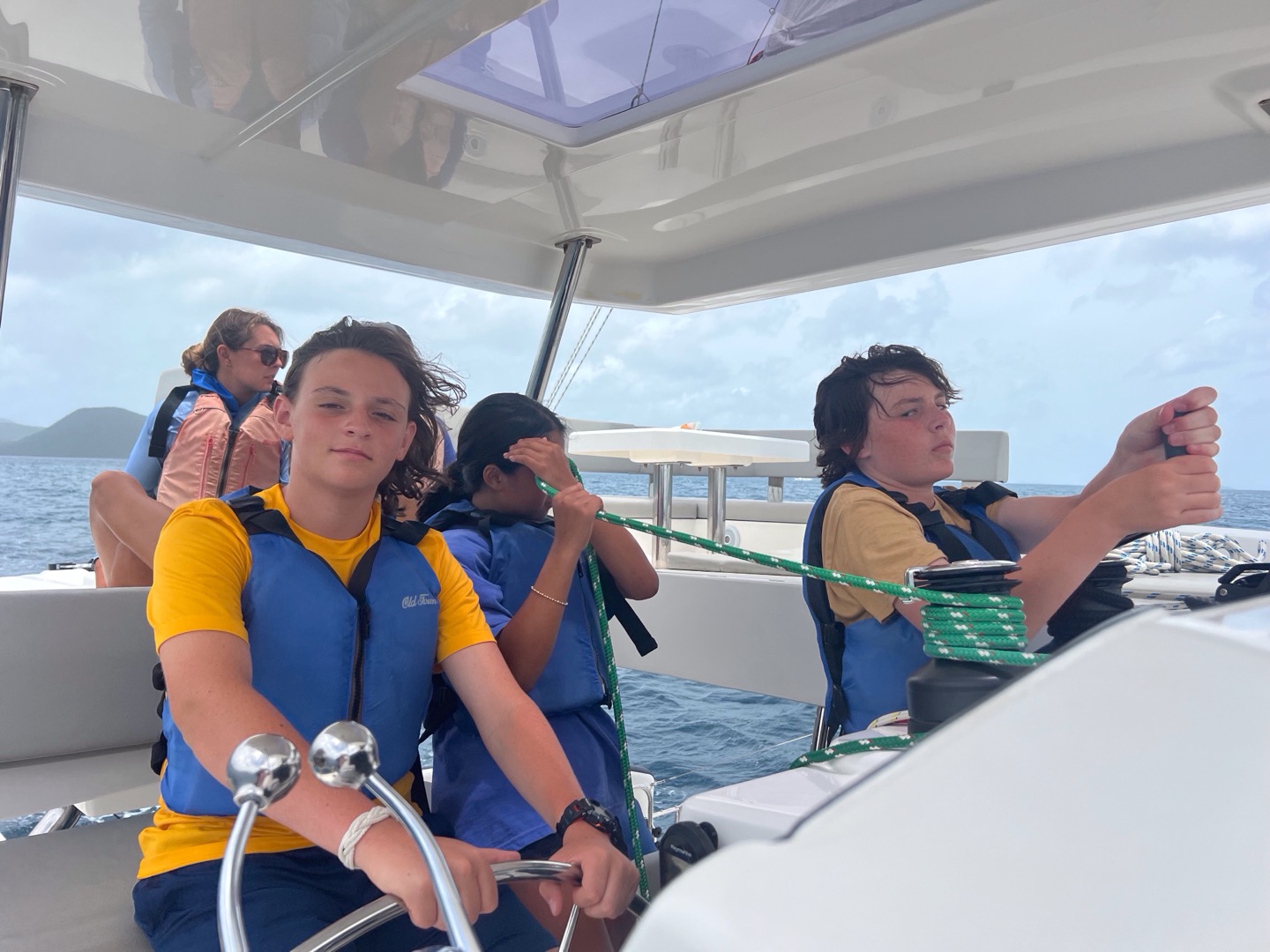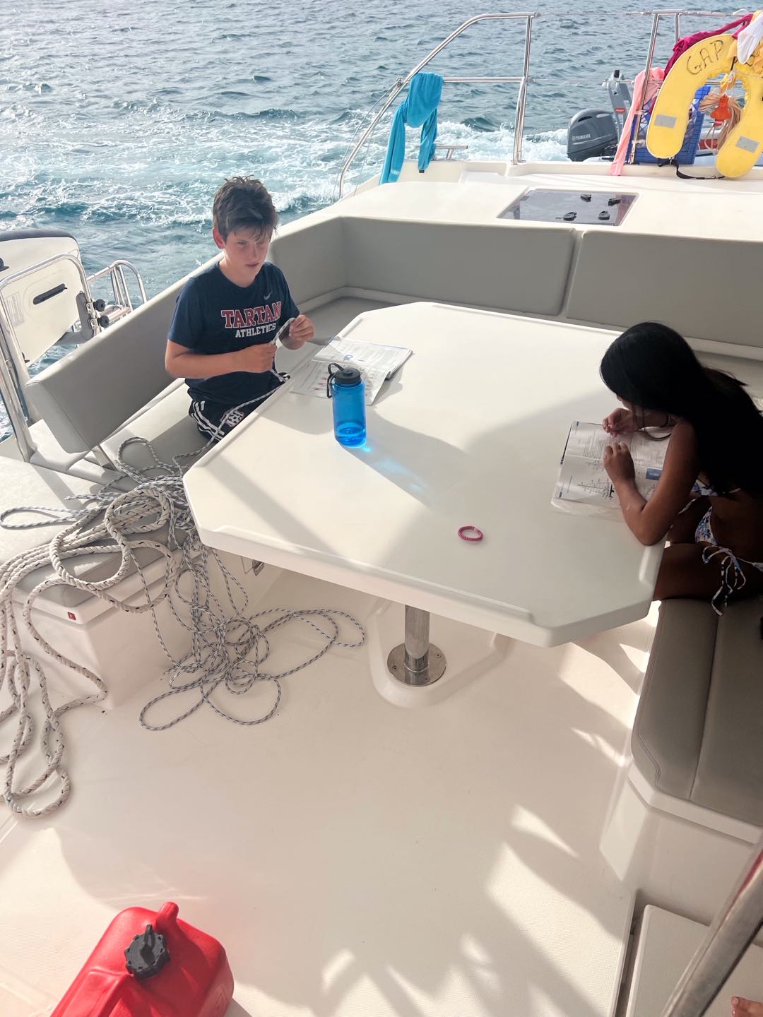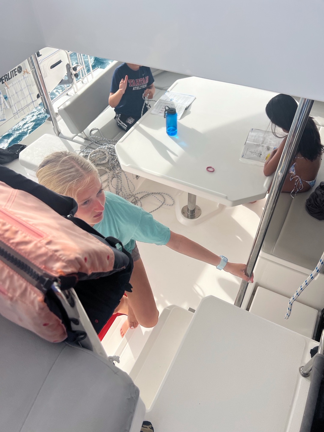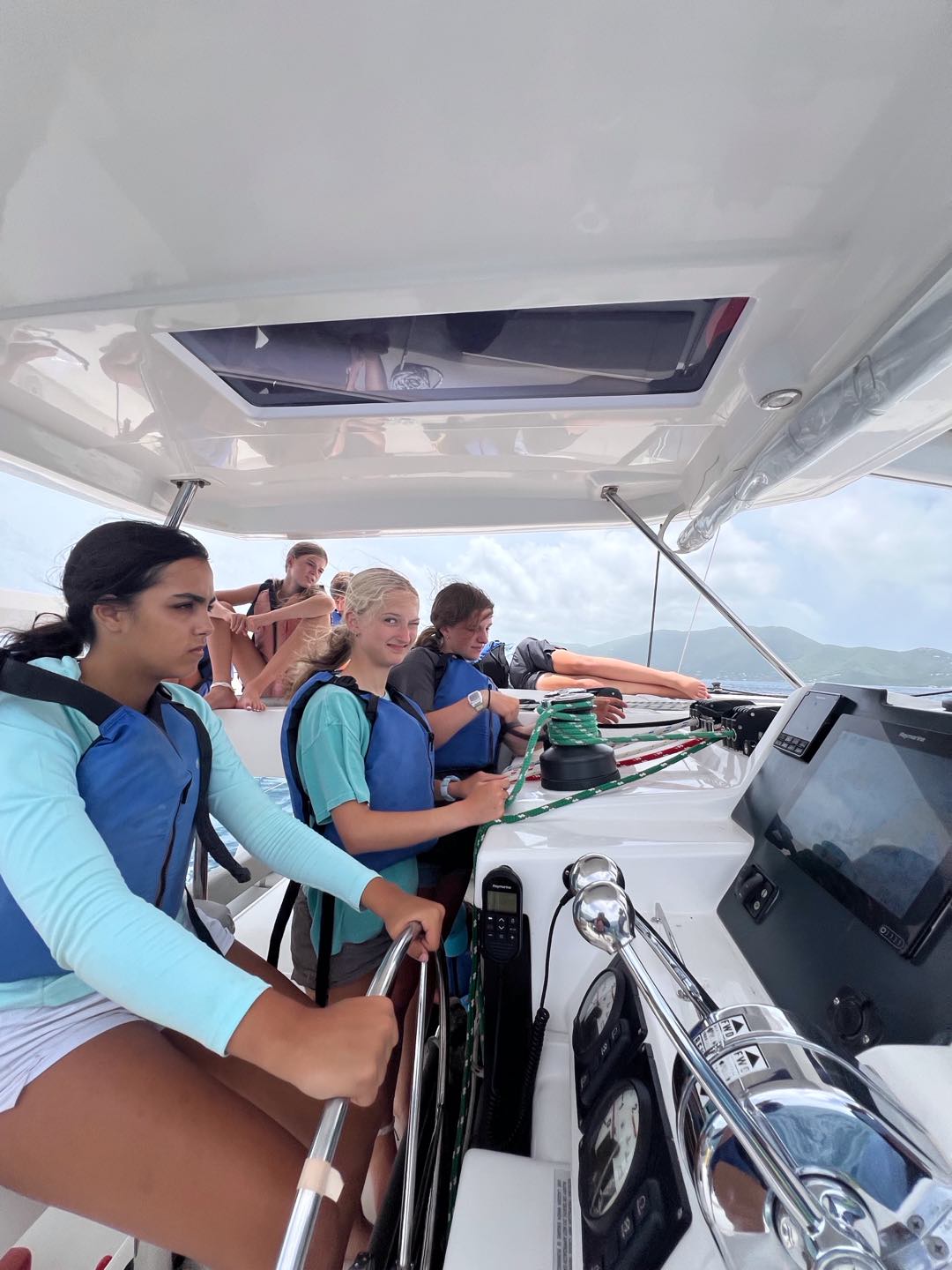 Today, we started off the day again by waking up to music. Nate and Lola started off our day by making us some amazing French toast. Our counselors needed to go to a staff meeting, so we decided to surprise them by deep cleaning our couch cushions, rooms and bathrooms, the top and front of the boat, and the dining area. After 1-2 hours of work, it was time to set off for a long day of sailing in order to practice for our sailing tests. Everyone got the chance to do everything that we had to do for sailing; with the towering waves crashing and shoving our boat side to side, walking across our boat was like an obstacle course. We were helming, pulling the lines, and cooking lunch. All the while, the boat was rocking so hard that it really showed us the feeling of what real sailing is like. We decided to anchor to eat our lunch, which was chicken salad sandwiches. The lunch was so god it really fueled us to rock out the rest of the day. Then, back to sailing because some students had to go scuba diving while the other students relaxed, practiced knots, and tanned on the front of the bow. After a chill but long day, it was time to shower, and we played with a football in the ocean for a little bit and ran around, then took our hibiclense shower. Feeling refreshed after our showers, we were served some hotdogs, beans, and cornbread to finish off our day.