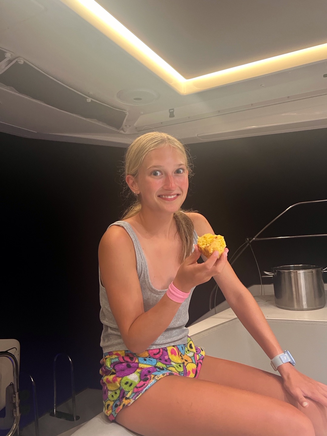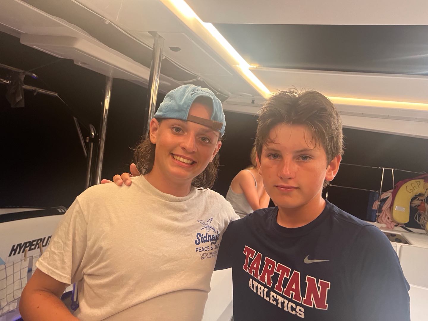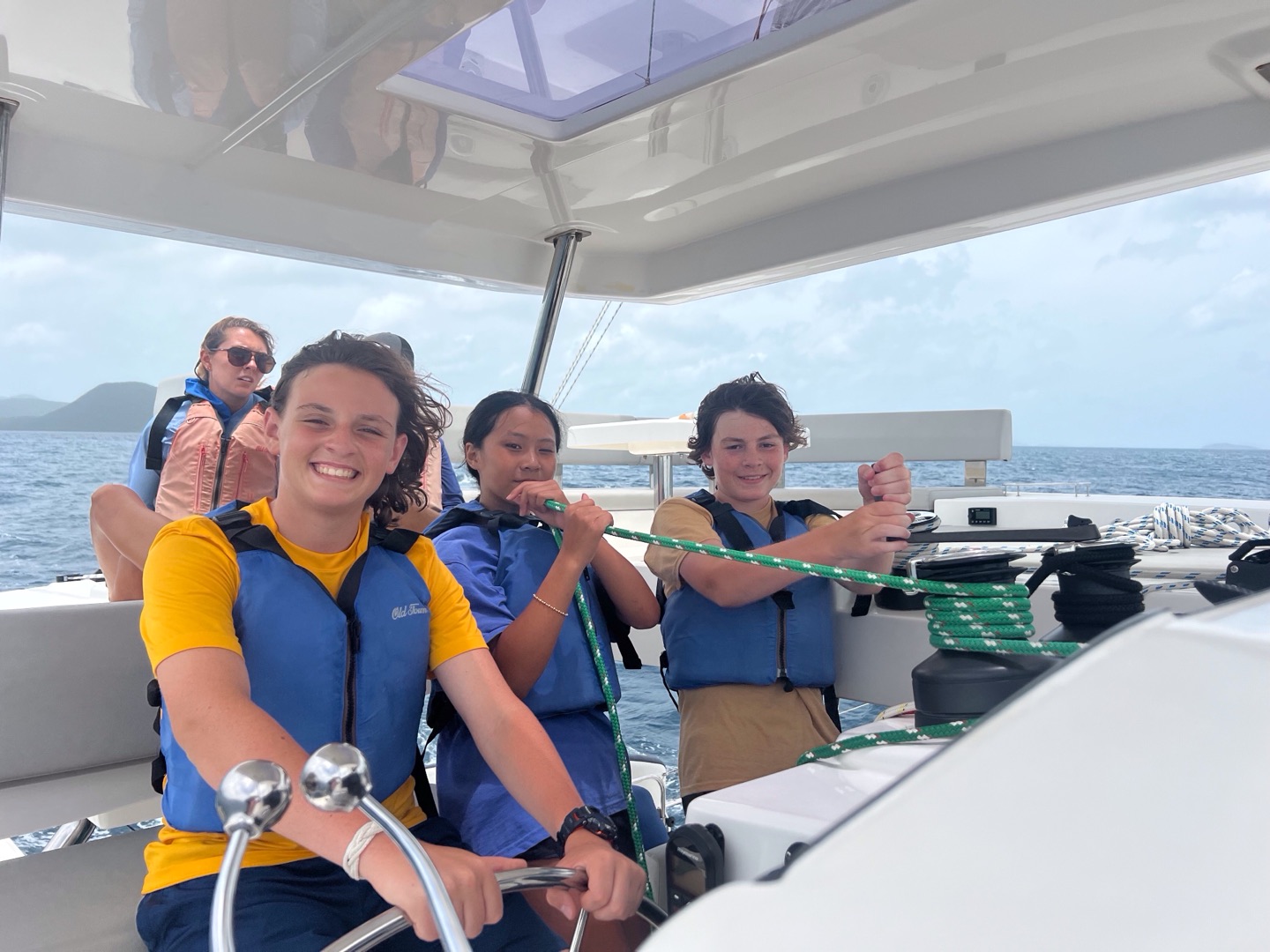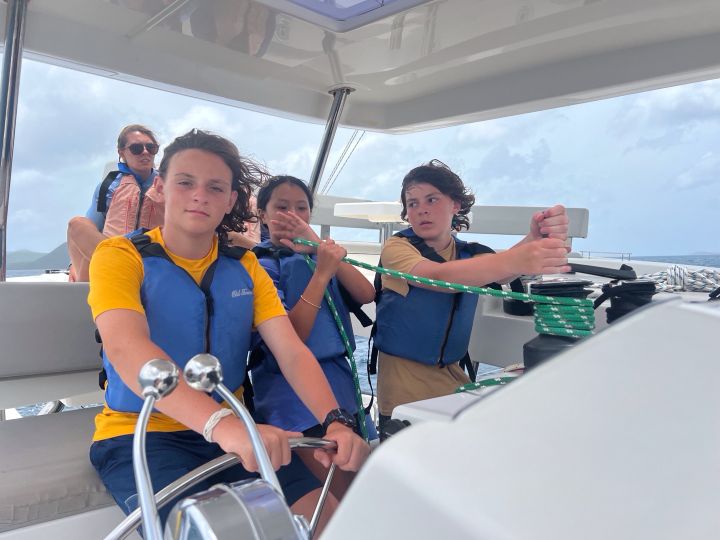 Today, we started off the day again by waking up to music. Nate and Lola started off our day by making us some amazing French toast. Our counselors needed to go to a staff meeting, so we decided to surprise them by deep cleaning our couch cushions, rooms and bathrooms, the top and front of the boat, and the dining area. After 1-2 hours of work, it was time to set off for a long day of sailing in order to practice for our sailing tests. Everyone got the chance to do everything that we had to do for sailing; with the towering waves crashing and shoving our boat side to side, walking across our boat was like an obstacle course. We were helming, pulling the lines, and cooking lunch. All the while, the boat was rocking so hard that it really showed us the feeling of what real sailing is like. We decided to anchor to eat our lunch, which was chicken salad sandwiches. The lunch was so god it really fueled us to rock out the rest of the day. Then, back to sailing because some students had to go scuba diving while the other students relaxed, practiced knots, and tanned on the front of the bow. After a chill but long day, it was time to shower, and we played with a football in the ocean for a little bit and ran around, then took our hibiclense shower. Feeling refreshed after our showers, we were served some hotdogs, beans, and cornbread to finish off our day.