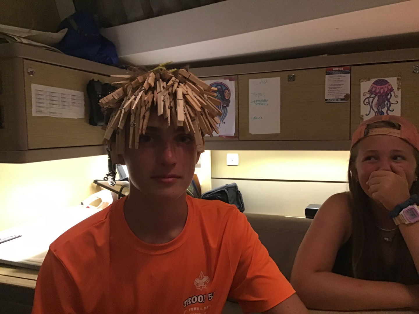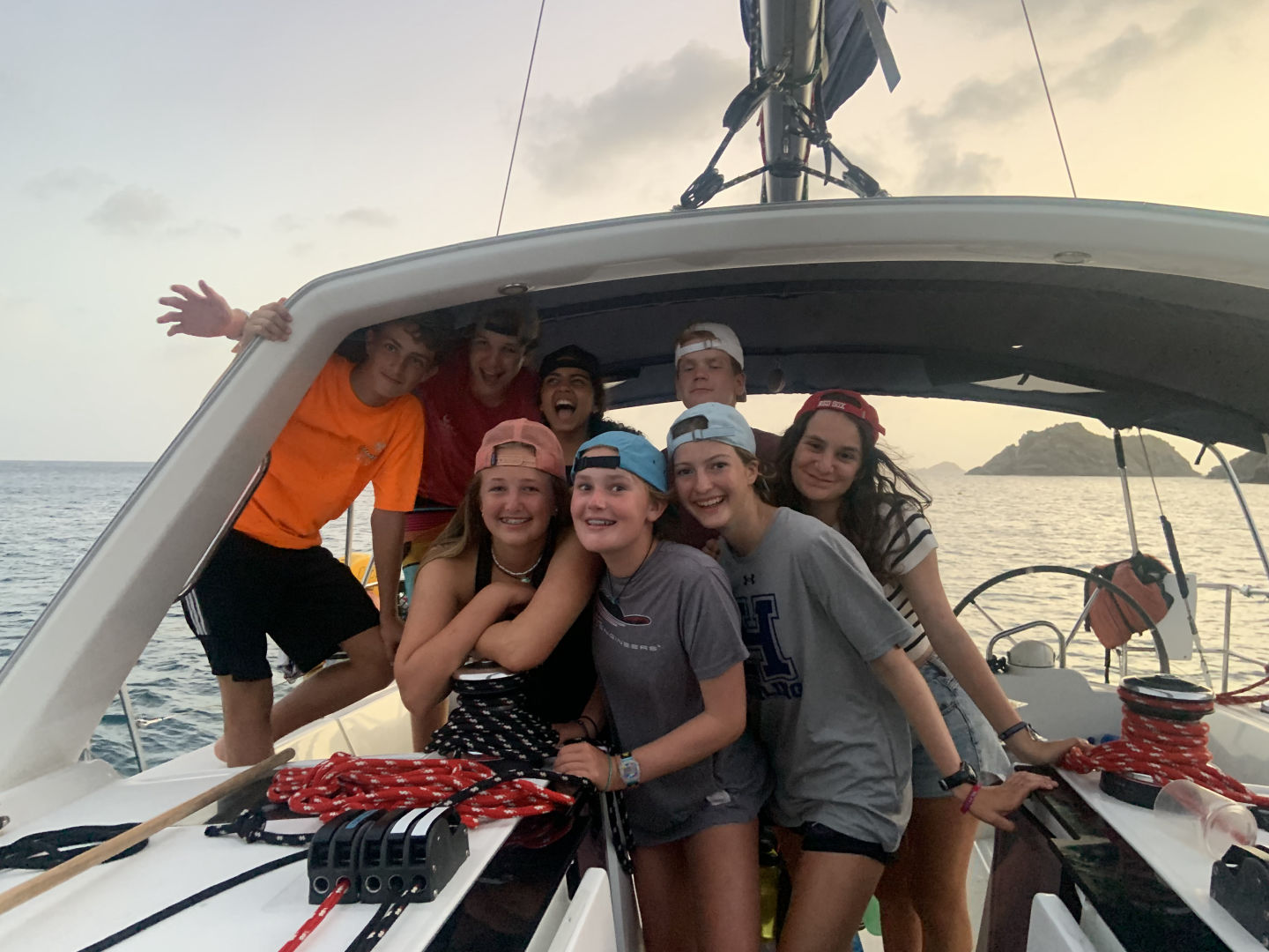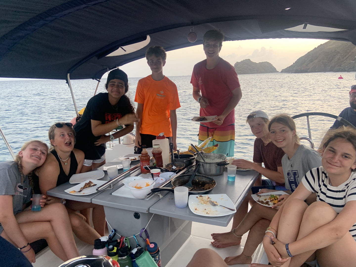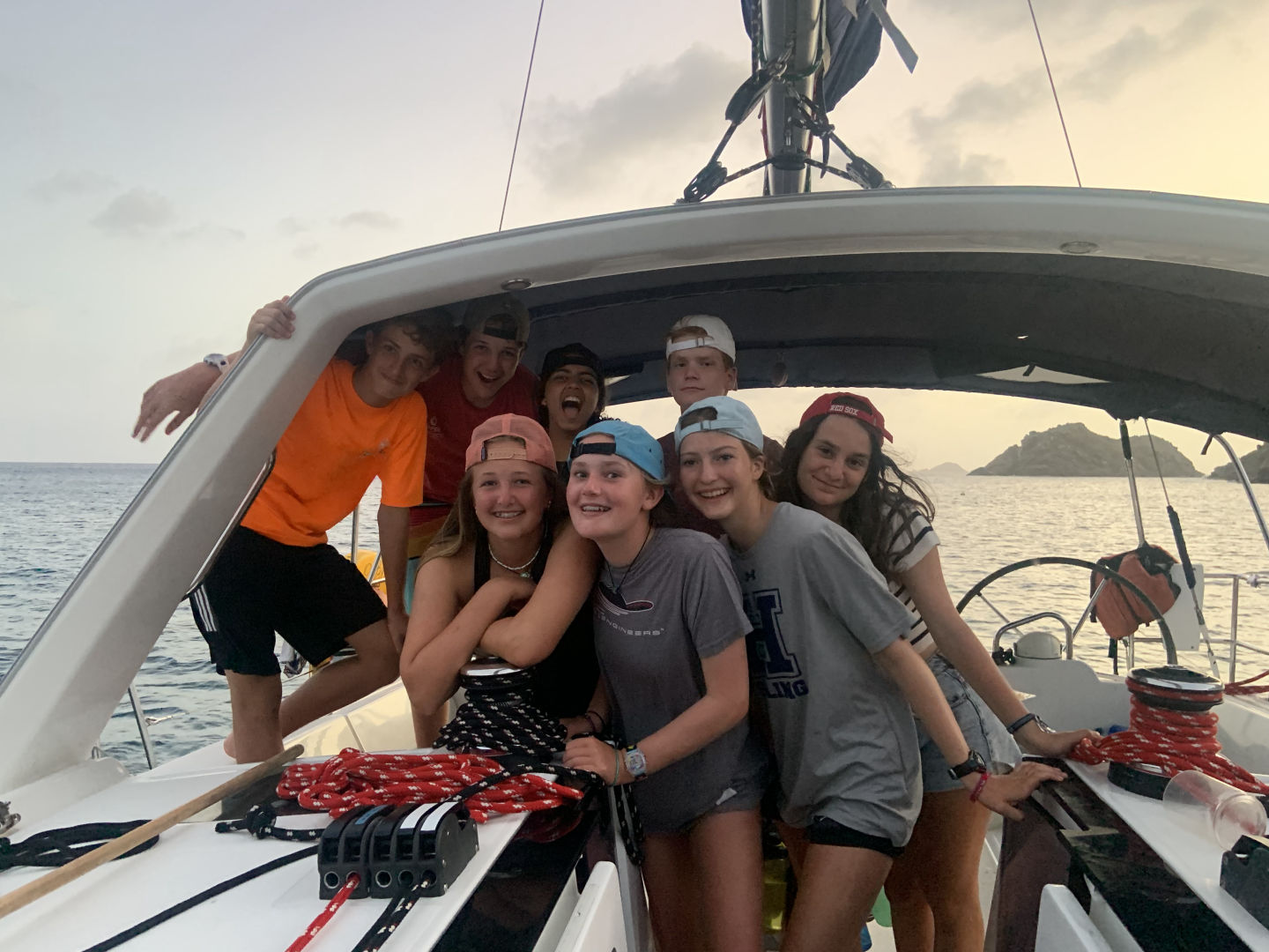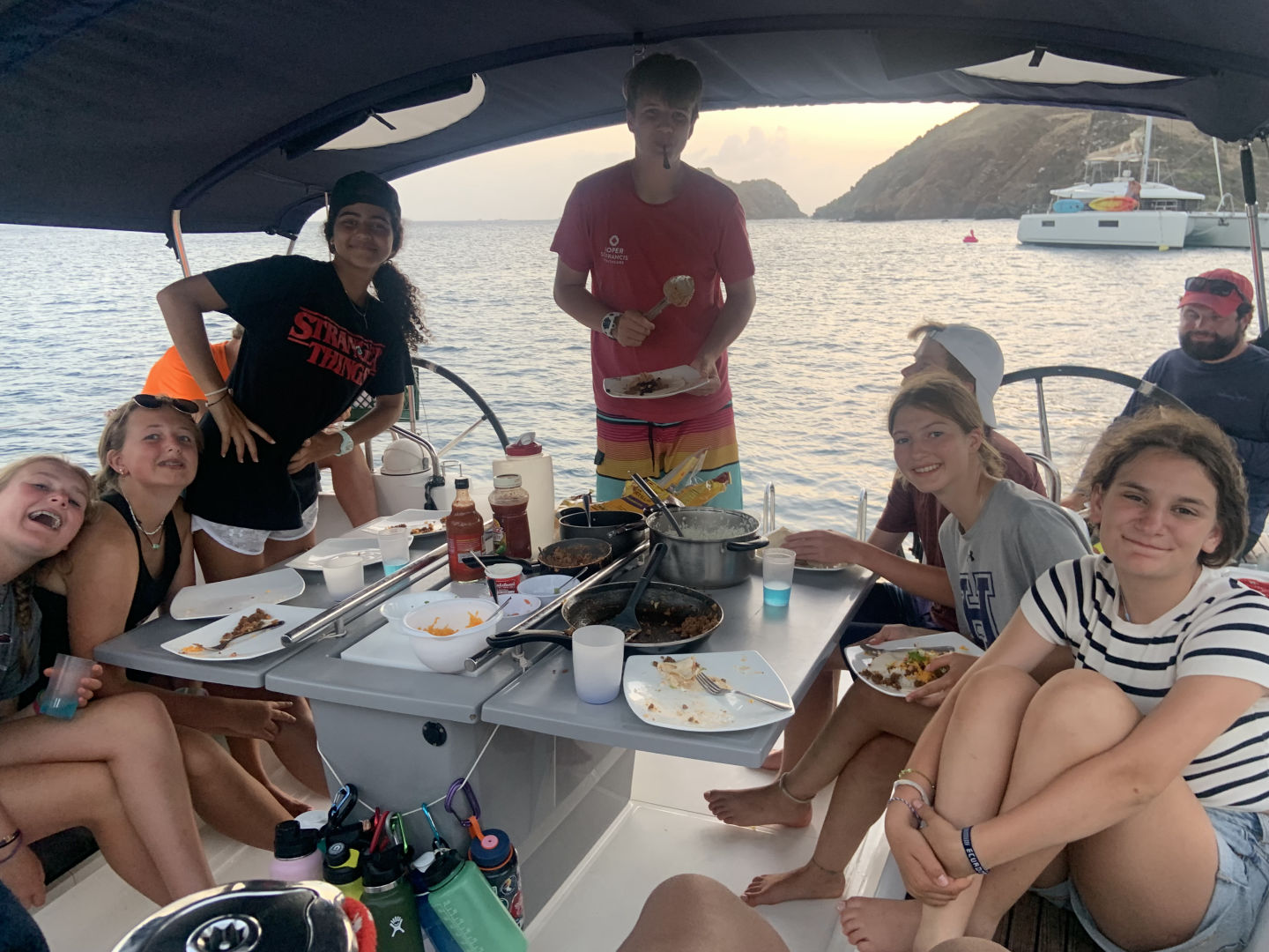Today we woke up in St. Barts and started our day with shore time. I went and got breakfast with Mason and Brenan from our sister ship, Shape Up. After that, we met up with Alex and Johnathan and went to the grocery store. We got back to the boat at 12:30 and relaxed while we waited for Nick to get back from customs. Once he got back, we set sail for an island called Ile Fourchue, which was only supposed to take 45 minutes, but Nick had different plans. Nick told us we were doing sail training, which made our sail around 4 hours. Nick, Benzi, and Missie taught us how to maneuver the boat in different ways and reviewed with us the points of sail. Once we got to our destination, we moored using our dingy, because we “misplaced” our boat hook. After we were all set, Miranda and Violet, our chefs, made food for Mexican night while Johnathan, Audrey, Ana, Sophie, Alex, and I talked on the bow. Mexican night was really good, and we finished our day with a sail chat.