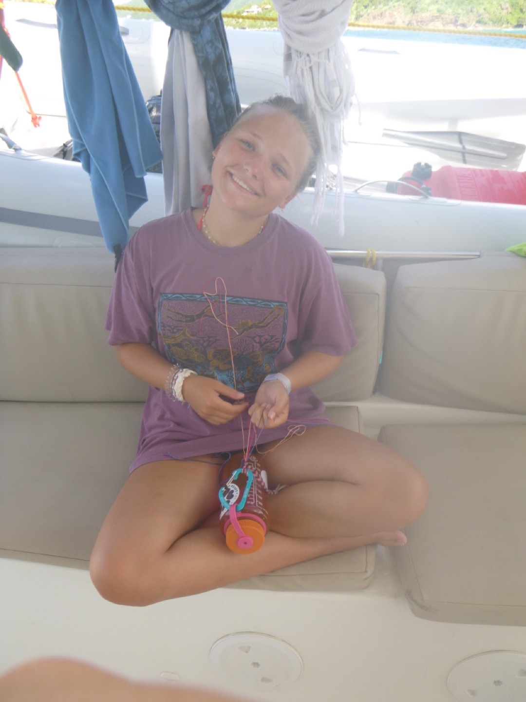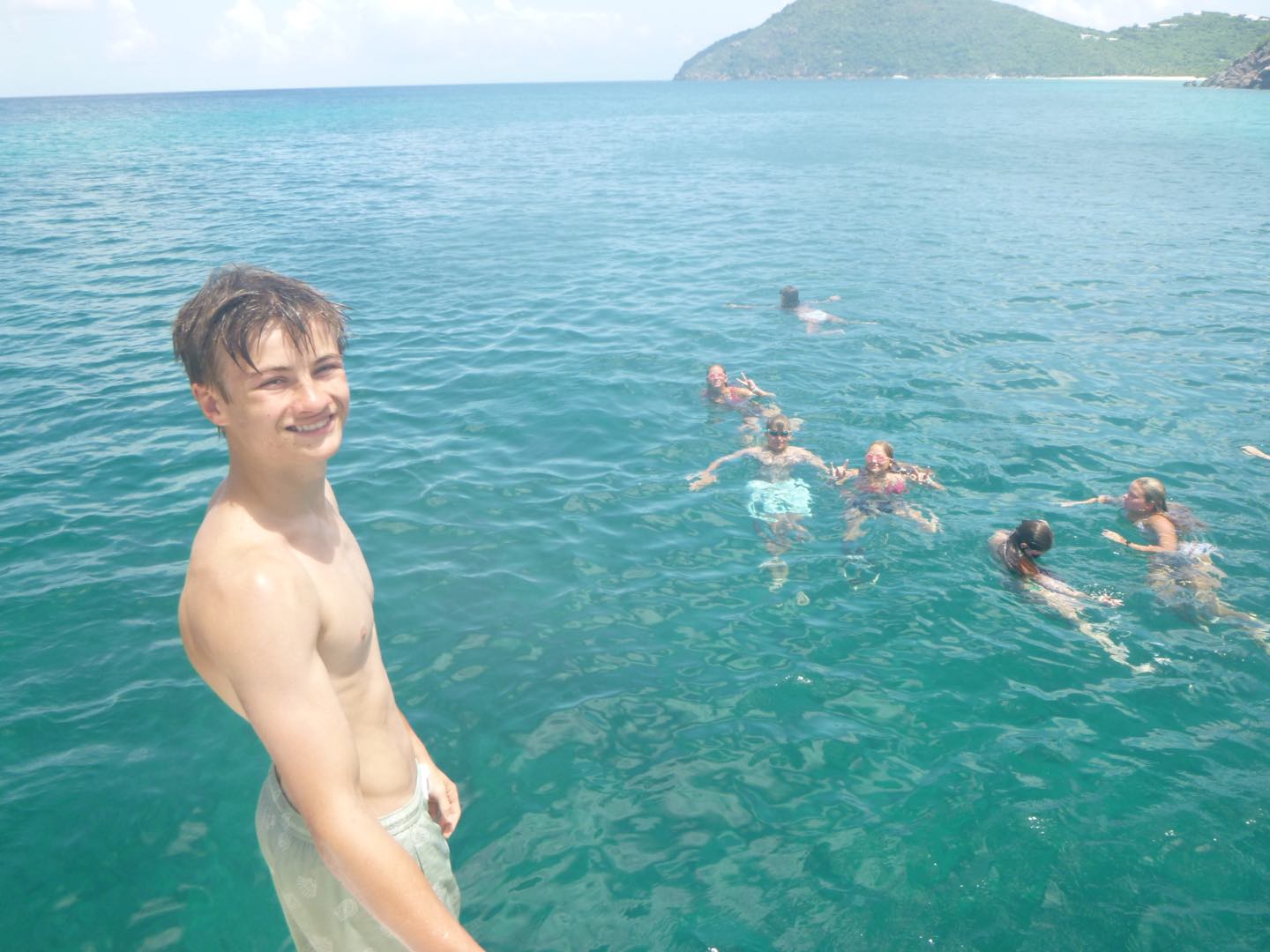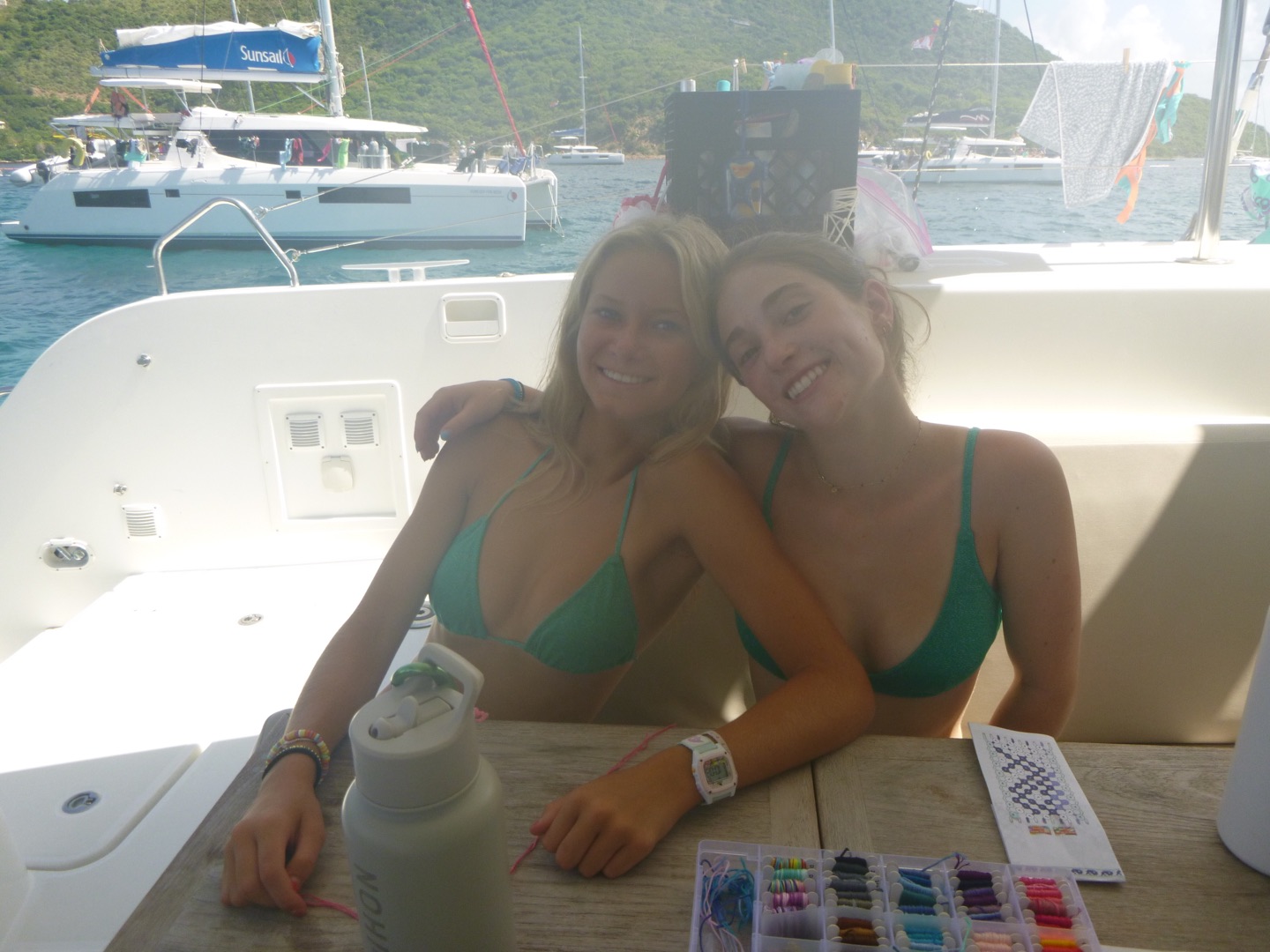 Today, we had an amazing day! We started the day with some cereal, yoga, and workouts on the hard top with neighboring ActionQuest boats. This soon ended up as a dance party across the anchorage. We left for sail training around 10:30, with a surprise swim stop thanks to Arden and Garrett. Throughout our sail training, we split into watch teams, practicing and applying our knowledge on points of sail and line handling. We also practiced tacking and gybing. Tucker, Jordan, Molly helped Arden with the mooring ball, Brig took us from a beam reach to a broad reach. Carson led us through a tack, and Alyssa was on the helm leading through our gybe. Molly helped Alyssa and Tucker in the kitchen all day making us delicious pasta and salad. Freddy was the designated photographer for Cathrine, Claire, and Jordan today during their fun photoshoot before our ocean showers. Greta and Ella worked on their bracelets all day today with super cool designs. Then, Tyler brought Aden from under pressure over for dinner again tonight, which is always so fun. We saw super pretty birds and a couple of amazing sea turtles. We are staying in the prettiest cove with lots of coral reefs and apparently lots of spotted early rays (my favorite animal). So excited for another awesome day tomorrow!