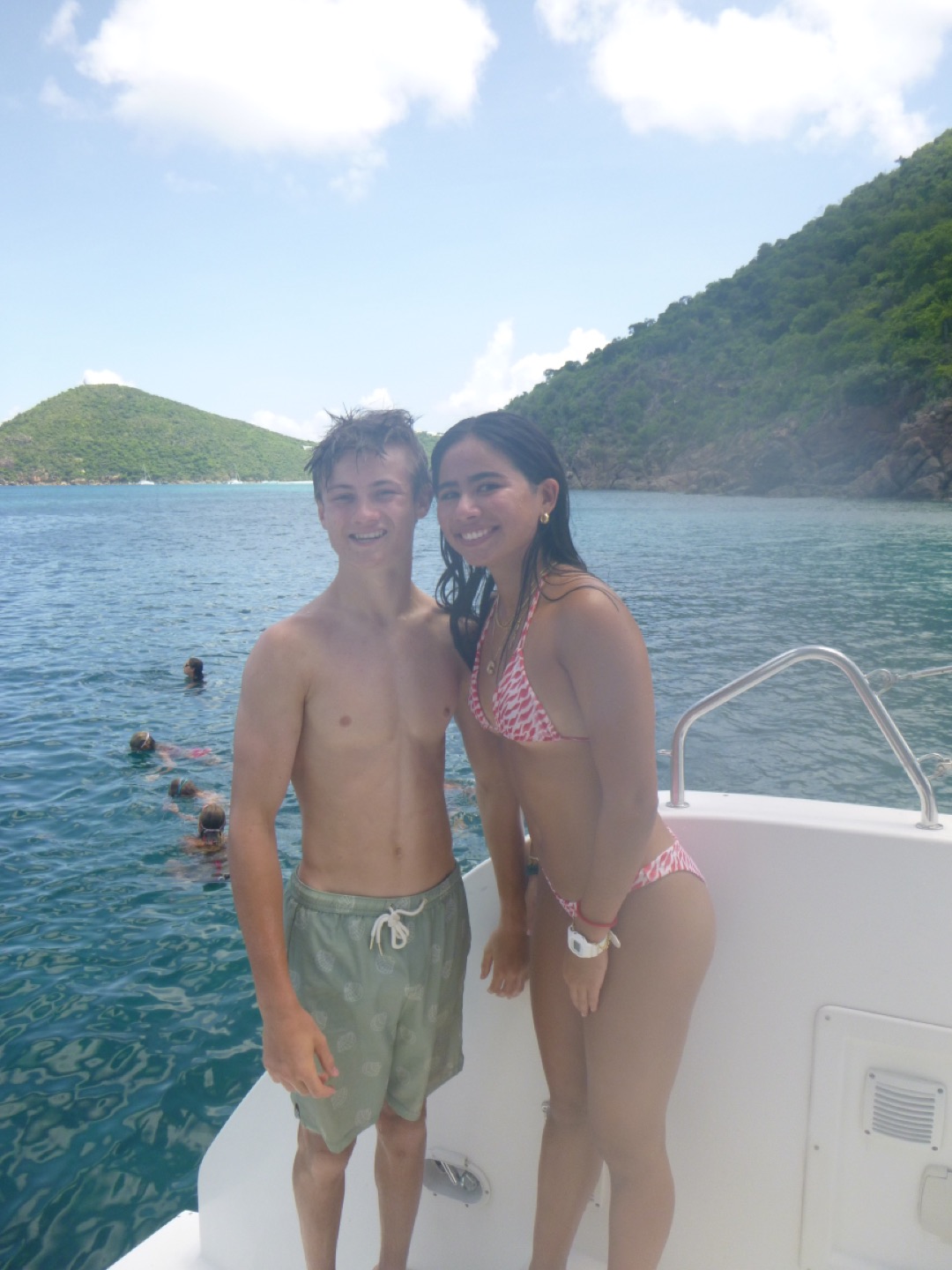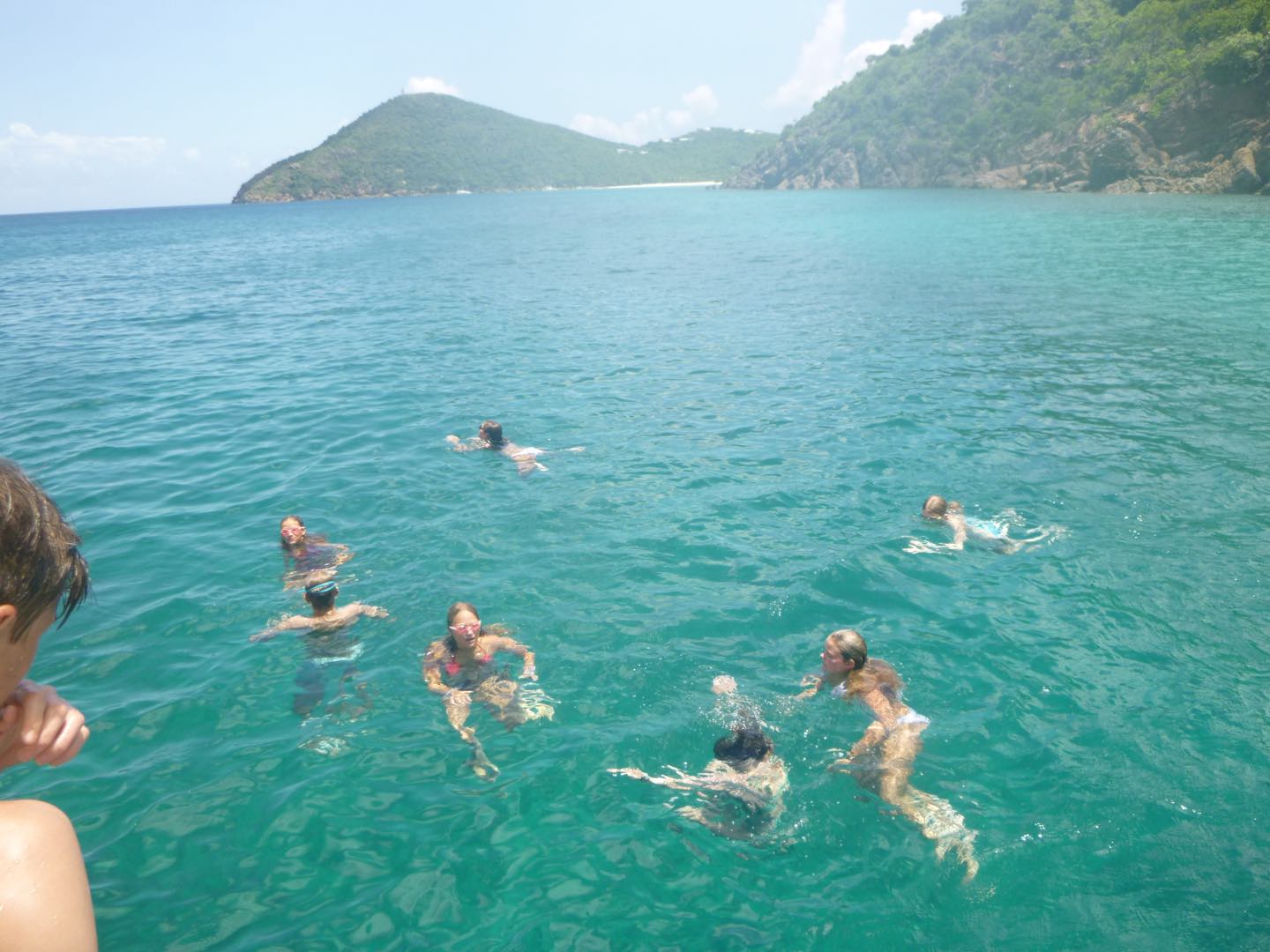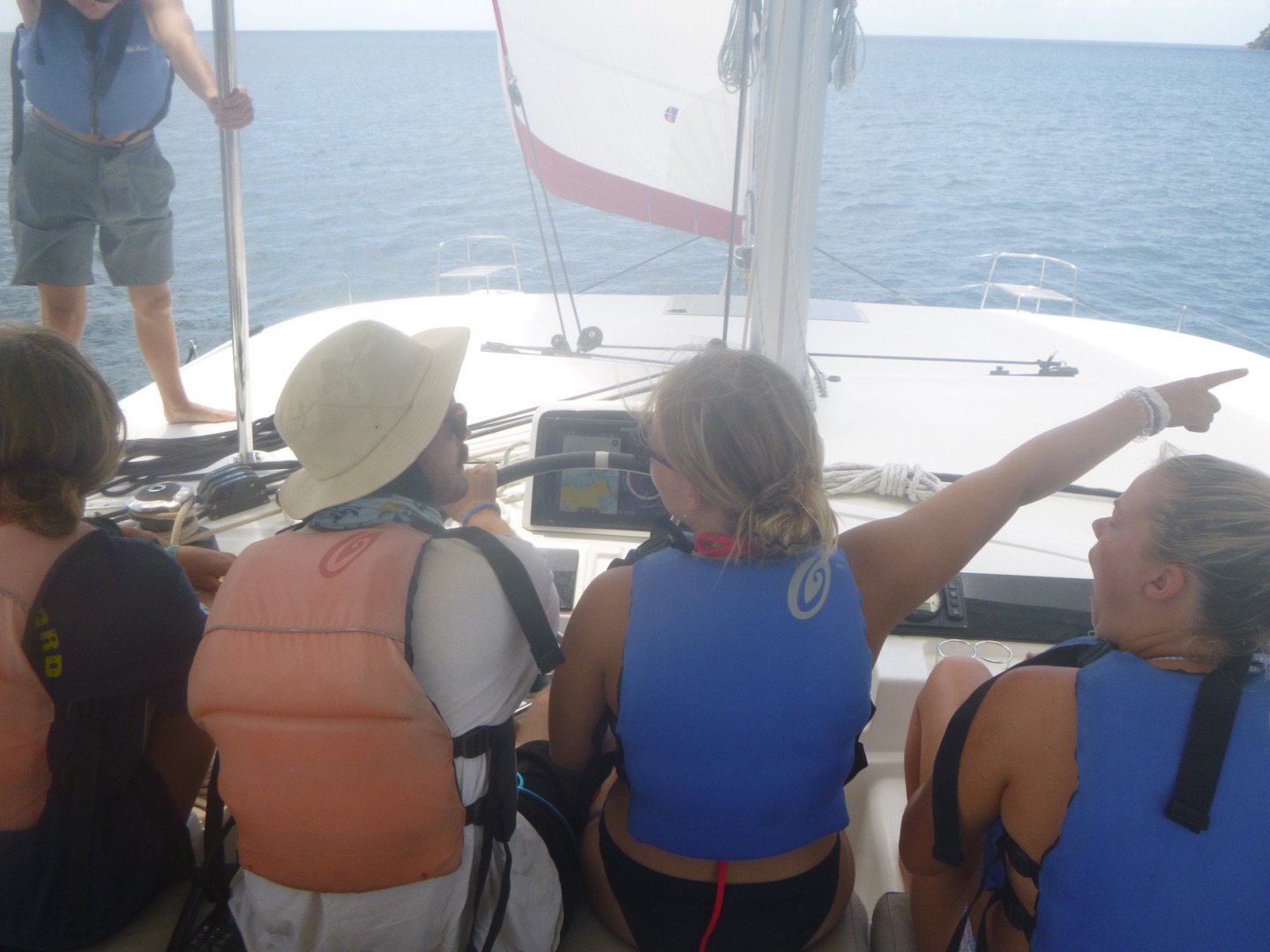 Today, we had an amazing day! We started the day with some cereal, yoga, and workouts on the hard top with neighboring ActionQuest boats. This soon ended up as a dance party across the anchorage. We left for sail training around 10:30, with a surprise swim stop thanks to Arden and Garrett. Throughout our sail training, we split into watch teams, practicing and applying our knowledge on points of sail and line handling. We also practiced tacking and gybing. Tucker, Jordan, Molly helped Arden with the mooring ball, Brig took us from a beam reach to a broad reach. Carson led us through a tack, and Alyssa was on the helm leading through our gybe. Molly helped Alyssa and Tucker in the kitchen all day making us delicious pasta and salad. Freddy was the designated photographer for Cathrine, Claire, and Jordan today during their fun photoshoot before our ocean showers. Greta and Ella worked on their bracelets all day today with super cool designs. Then, Tyler brought Aden from under pressure over for dinner again tonight, which is always so fun. We saw super pretty birds and a couple of amazing sea turtles. We are staying in the prettiest cove with lots of coral reefs and apparently lots of spotted early rays (my favorite animal). So excited for another awesome day tomorrow!
