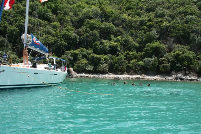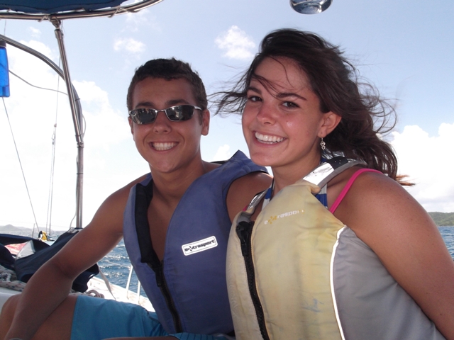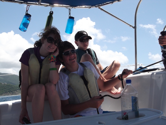 We started the day at 6:30 am at Pond Bay. Everyone woke up and the chefs started cooking/preparing oatmeal for breakfast. After everyone finished eating the rest of the shipmates did their jobs, cleaned dishes and the rest of boat. The navigator found out we were going to Mountain Point first and how we would be getting there. Once it was time to leave Pond Bay the green watch took over first, which was Ian, Lorenzo, Stephanie, and I. We sailed around a reef and then the black watch took over. Later after they sailed the boat for a while the red watch took over and took us to Mountain Point. We all hung out on the ship for a bit and had lunch. Today we made sandwiches again, they were pretty good. After lunch we cleaned the dishes and everything else. Once everyone finished their jobs we did another drill, which was mooring. Earlier in the day the drill we did was tacking. Both drills went well. I think everyone learned a lot today. After we finished the drill we went back to the boat and then everyone got ready to go diving. I got ready to go snorkeling, it was pretty cool! There were a lot of really cool fish and a lot of neat other things. Everyone met up at the boat afterwards and then we started sailing again to Peter Island. The whole we there we sailed with the wind behind us. We ended up having dinner while we were on our way to Peter Island while we were sailing still. Once we got back we changed and headed to a boat for Lifeworks with a couple other boats and we talked about what would make our lives perfect. After we came back to the boat and celebrated Michael’s birthday!