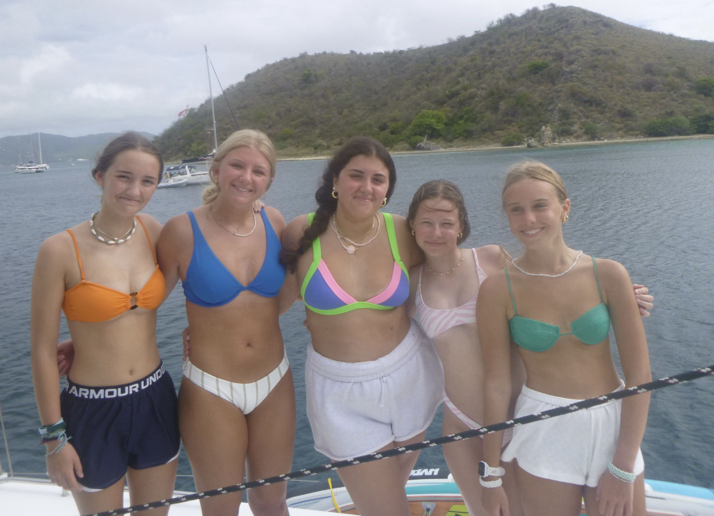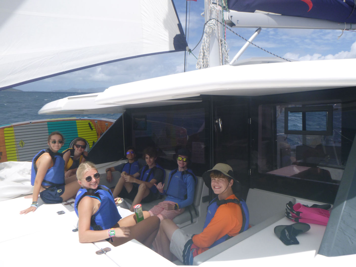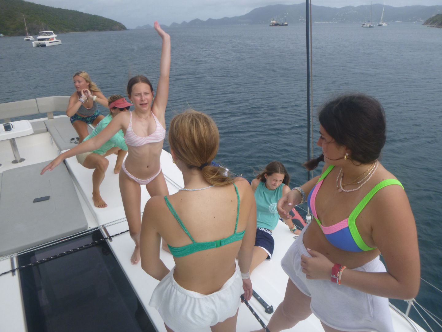 We sailed for about 3 hours again in the afternoon. During this sail, we had a lot of tacking practice, and then we had a sail chat. Afterward, Finn, Teddy, Oskar, Zander, Eres, Bear, and I sat and talked on the bow of the boat and were in a big pile. After the sail, we stopped in Savannah Bay, and everyone got in the water and swam. Finn, Teddy, Zander, and Oskar got to go and knee board or wakeboard. While they were doing that, the girls and Payton and William all swam and did flips off the dinghy. Bear yelled at this other boat to make them do a Dance battle, but they did really badly, so we didn’t dance back. While we were getting back off the boat, Tatum arrived on a dinghy, and we were all super excited and ran up and hugged her. After, Tatum, Payton, Eres, and I all went and wakeboarded and knee boarded. Payton and I wakeboarded and ate it a few times. Tatum did really well on the kneeboard, though. Then we got back to showers and ate dinner.