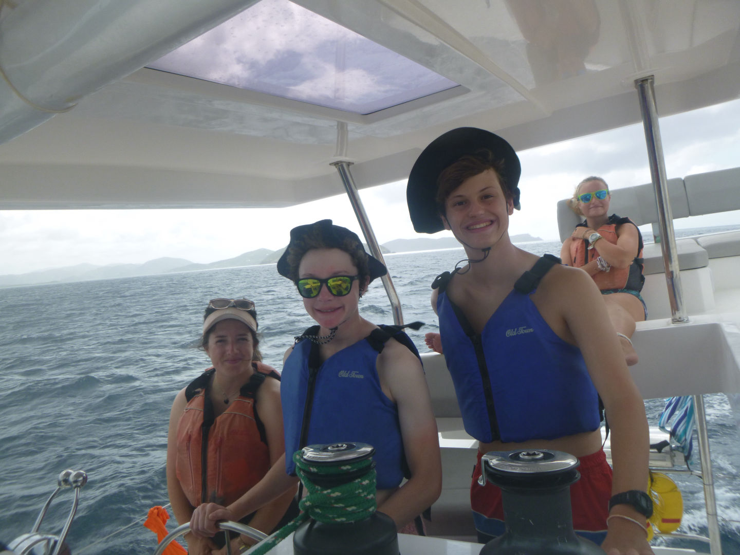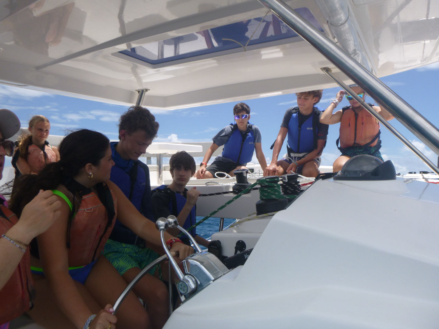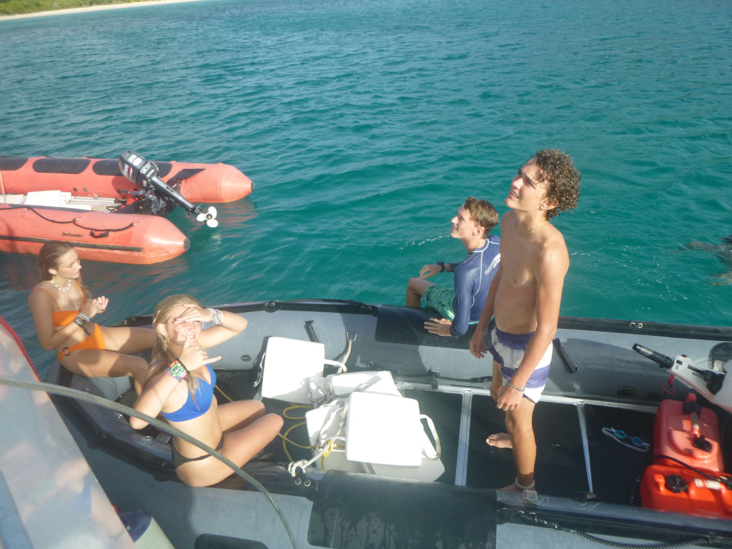 We sailed for about 3 hours again in the afternoon. During this sail, we had a lot of tacking practice, and then we had a sail chat. Afterward, Finn, Teddy, Oskar, Zander, Eres, Bear, and I sat and talked on the bow of the boat and were in a big pile. After the sail, we stopped in Savannah Bay, and everyone got in the water and swam. Finn, Teddy, Zander, and Oskar got to go and knee board or wakeboard. While they were doing that, the girls and Payton and William all swam and did flips off the dinghy. Bear yelled at this other boat to make them do a Dance battle, but they did really badly, so we didn’t dance back. While we were getting back off the boat, Tatum arrived on a dinghy, and we were all super excited and ran up and hugged her. After, Tatum, Payton, Eres, and I all went and wakeboarded and knee boarded. Payton and I wakeboarded and ate it a few times. Tatum did really well on the kneeboard, though. Then we got back to showers and ate dinner.