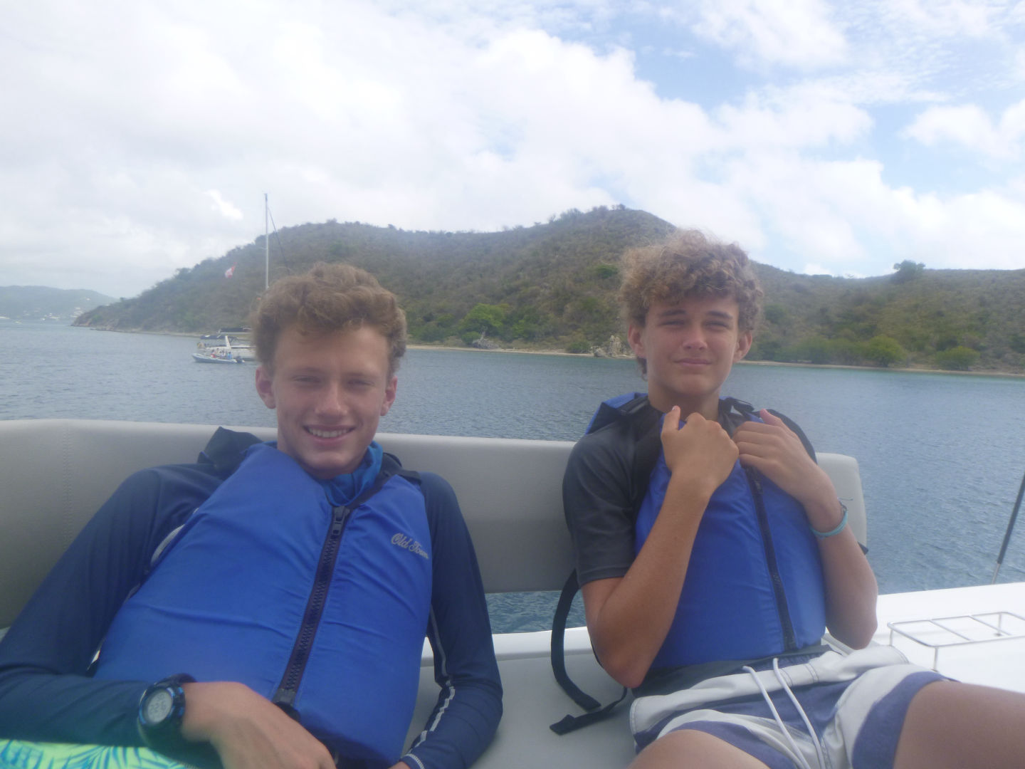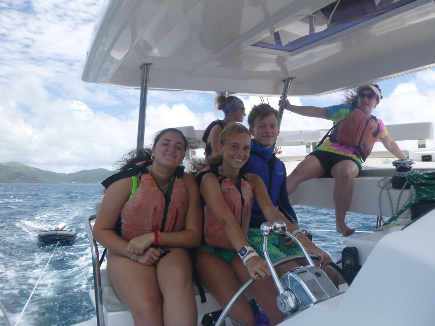 Today, we got up at 7:00 am. We ate eggs and fruit for breakfast first. Then we got ready to start sailing. I was skipper, so I was at the helm to steer the boat. We sailed for about 3 hours in the morning. We then stopped at Cooper Island for lunch, which was PB and J, or you could eat ham/ turkey sandwiches. When we stopped, we also swam, which was very nice after a hot morning. We all got into the dinghy, where we tried to do flips, but it failed. Teddy and Payton were the only two who did backflips. Finn was going to do a backflip, but he got psyched out and just jumped in backward. While on the dinghy, Zander kept trying to push Ellery, Eres, William, Lulu, and Bear off the dinghy, but Eres pushed him in instead. Then we had to get off the dinghy to get ready to go sailing again.
