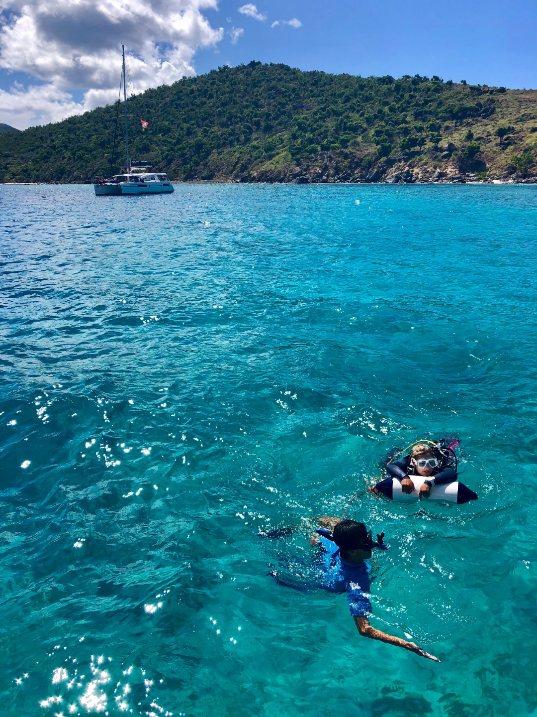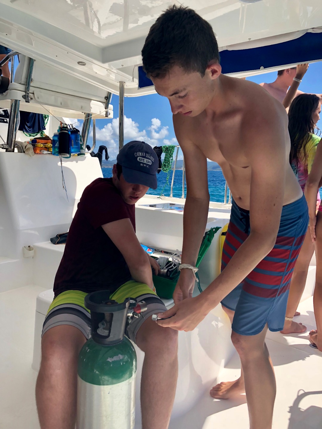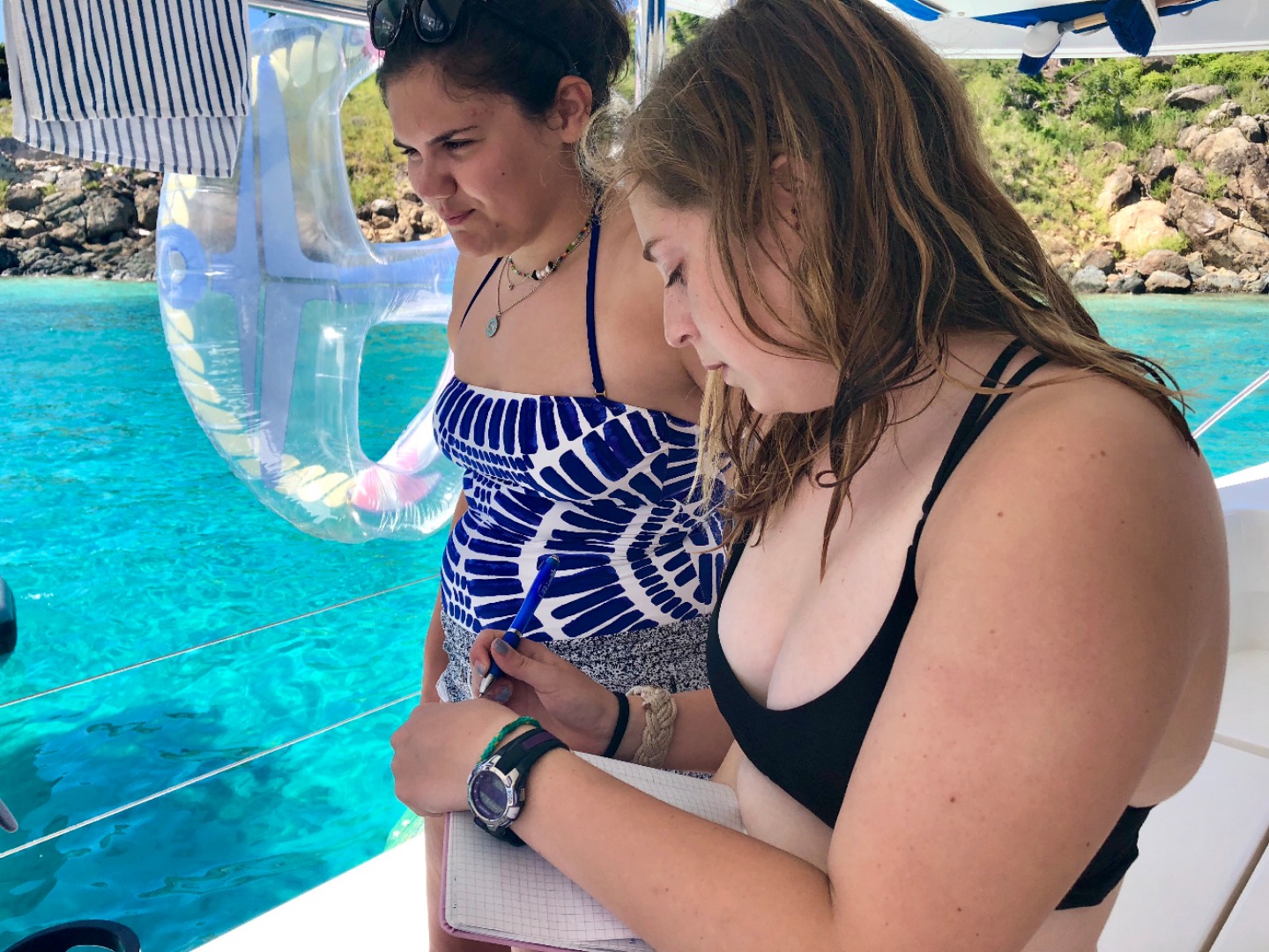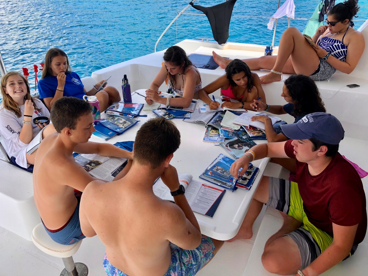Early this morning, we dove near Sandy Spit in order to earn our Search and Recovery certification. Our objective was to recover a kettlebell using a search pattern of choice and raising the object with a life bag. Following our dive, we began studying for our EFR and rescue exam. Afterward, the tanks were pumped and we split into two groups and departed in our dingy to travel around the bend and dive “The Playgrounds”. My group was fortunate enough to encounter a squad of squid and a large reef shark. An honorable mention to the unbelievable reef structures. After finding our way back to the boat, our instructors surprised us during “study time” with our first emergency scenario. In my opinion and the (very qualified) opinion of my boat – we aced it! Dan rated us 8.5 out of 10! Tonight, we are leaving for the island, Sandy Spit, to join sail-side and Go Beyond in an all-camp BBQ on the beach.