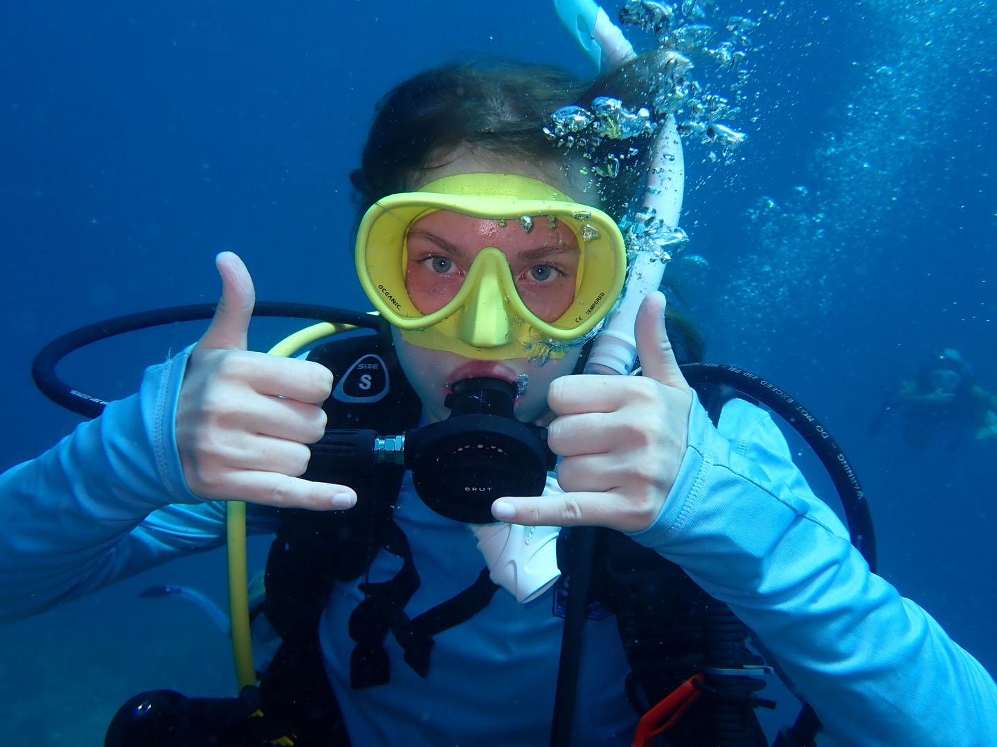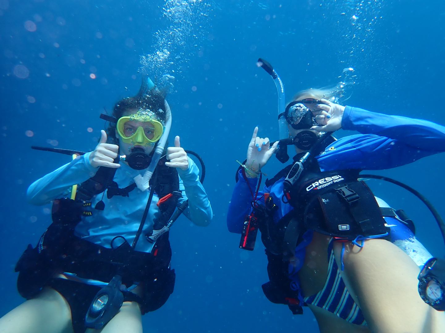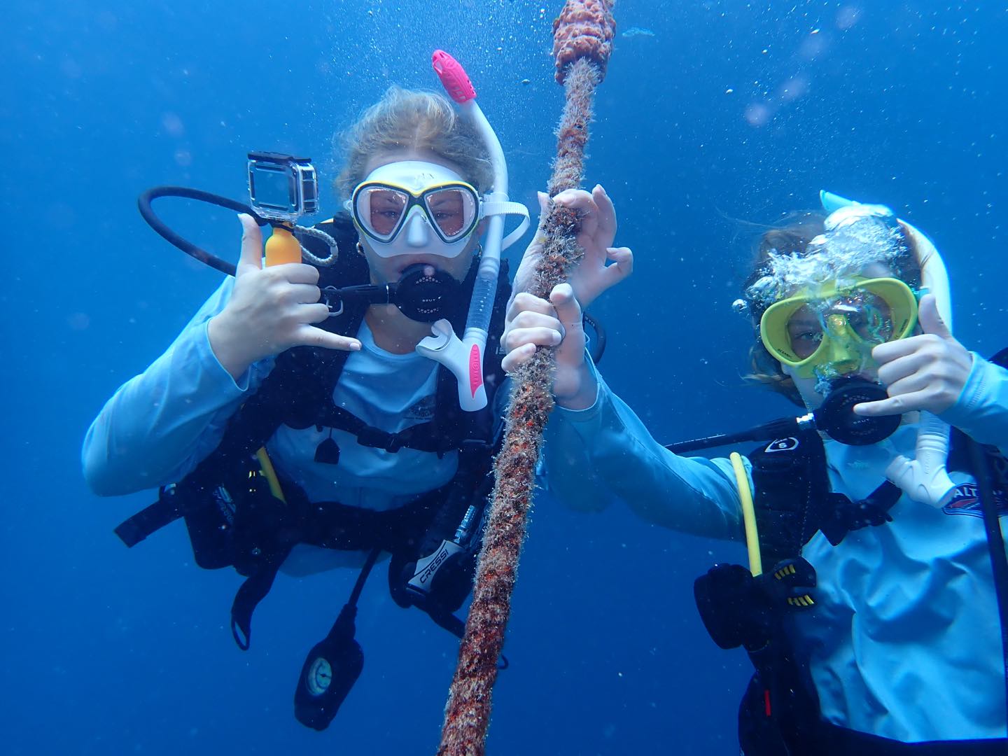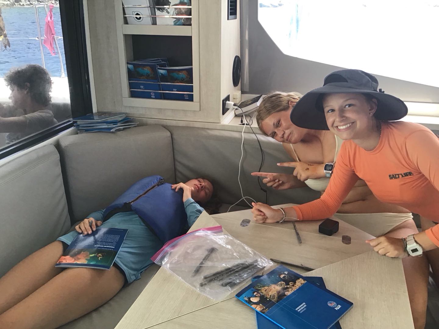 Today, we started off the day with a short sail to the dogs, where we did two dives. The first dive was really cool and we went through a tunnel of coral. Next, we saw airplanes that were shaped like sharks, and we could swim through them. The planes had lots of fish in them, and the dive was extra cool because Evan and I went by ourselves, and it was very successful. Then we sailed back to Mountain Point, where we were mooring for the night. Hays, Jackson, Reese, Megan, Kate, and Scottie all went wakeboarding and skiing. Evan and Sienna took early showers, and I swam with another boat. The water was pretty. Then, the rest of us took showers when they all got back, and we ate dinner. Then, everyone hung out and went to bed. We are super excited for Tomorrow morning where we have the barbecue and phone day!