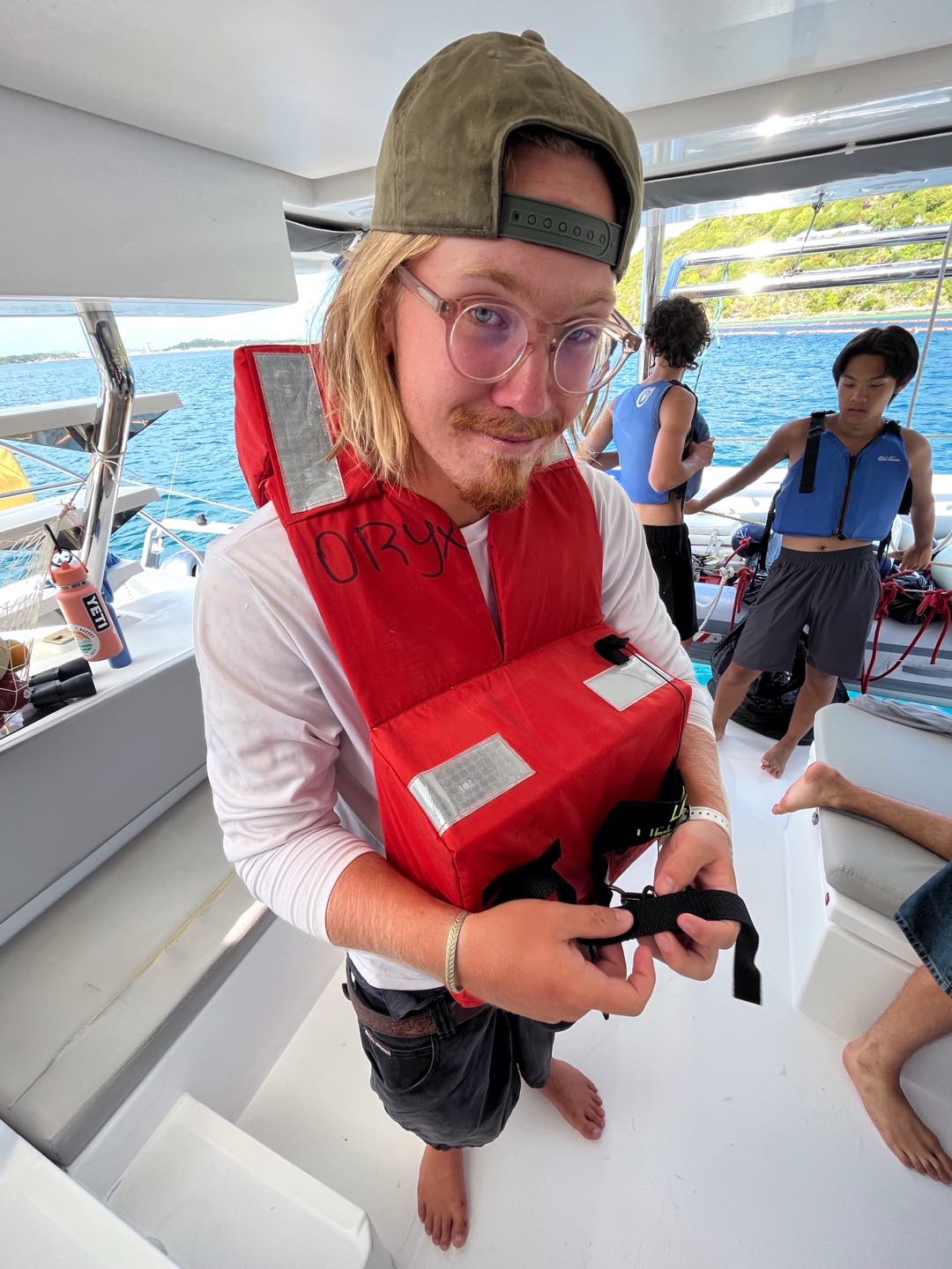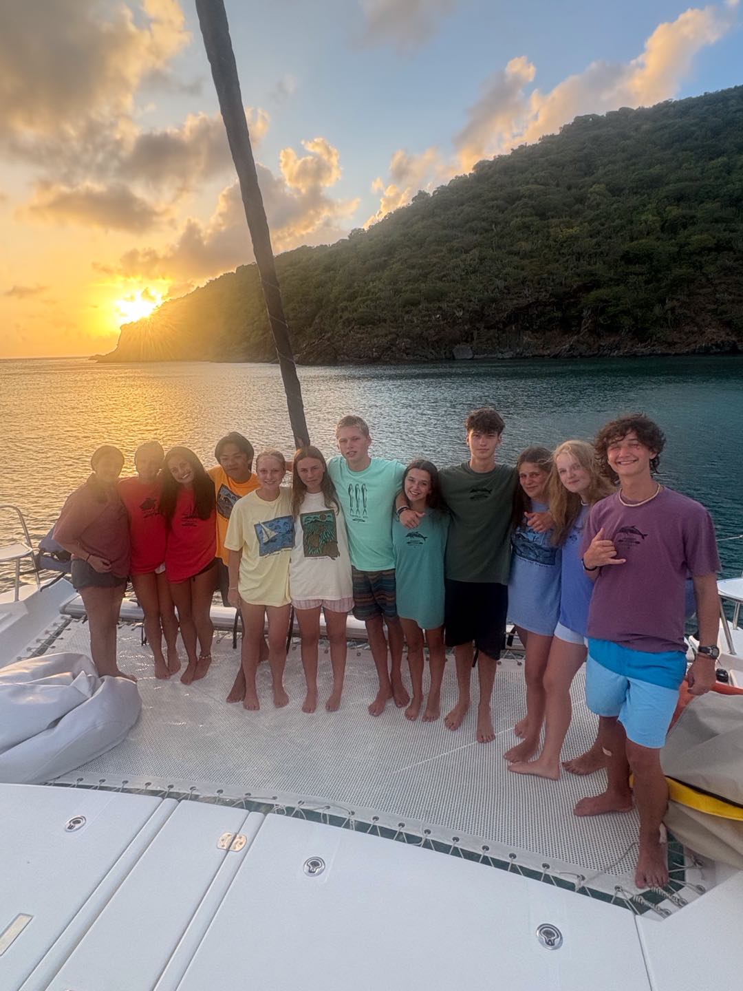 As soon as we showed off our new shirts to everyone, we changed into our swimsuits, and everyone went on a little swim while Eva, Lexi, Emma, Zoe, and I went up and tanned for a bit. After a bit of chill time, I cut up the pineapple we have been eyeing for the past couple of days, and it was so so yummy (We are obsessed with our fruit). Then we set sail to the prettiest place we have been to yet. We had a peaceful sail to this spot thanks to August. We took our ocean showers quickly while Clemmie and Thom prepared our dinner. Tonight we had a guest over for dinner, and he brought over the spiciest hot sauce ever. Of course, we all had to try it, and of course, Jerry had no reaction to it at all. We played a game of hide and seek after cleaning up dinner, and now we are getting ready for bed. That completes one of my favorite days on Oryx yet.