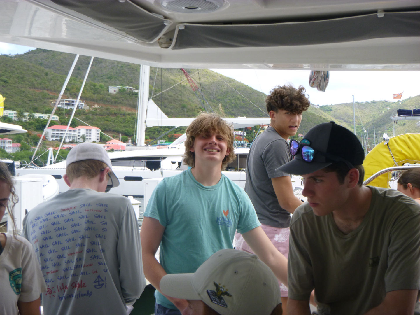 Today we woke up later than normal to bagpipes blaring very loud through the boat speakers. We decided not to dive today (something very rare) and instead had a day full of sailing. We had a cereal breakfast and then started a three-hour sail to Road Town. Lucas and I taught Andrew, Mireille, Rooks, and Alicia how to play Canasta (a card game), and the team of Lucas and Rooks got absolutely skunked by Alicia and Andrew. During our voyage, Scott took a massive nap right in the middle of the port side walkway. When we arrived at Road Town, we were told by Matt to stay within the base of the mooring. We all went to the grocery store and bought communal boat snacks because we had somehow run out only a week into the trip (probably because of Scott’s excessive snacking). Then Scott and I went to the coffee shop and got Chai Lattes.