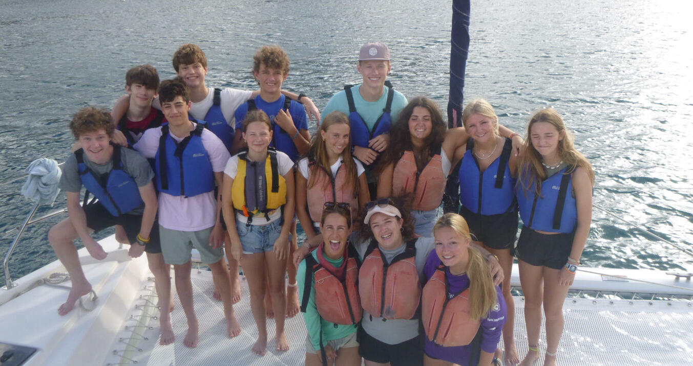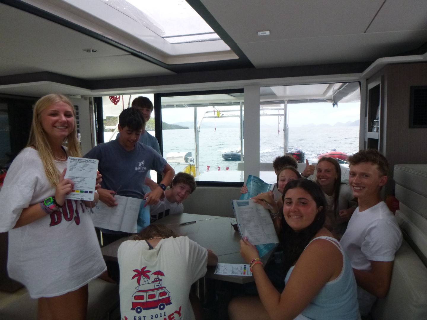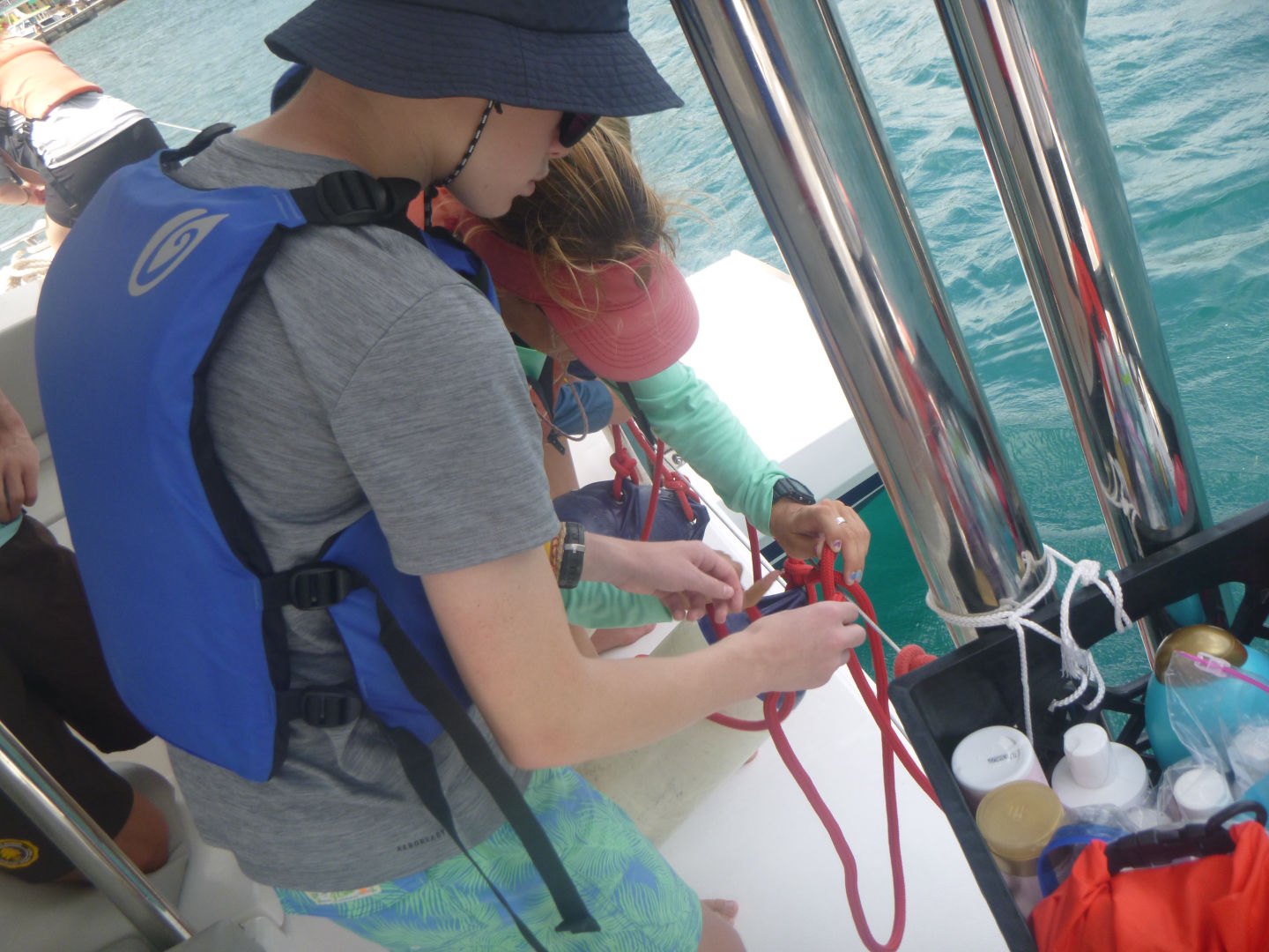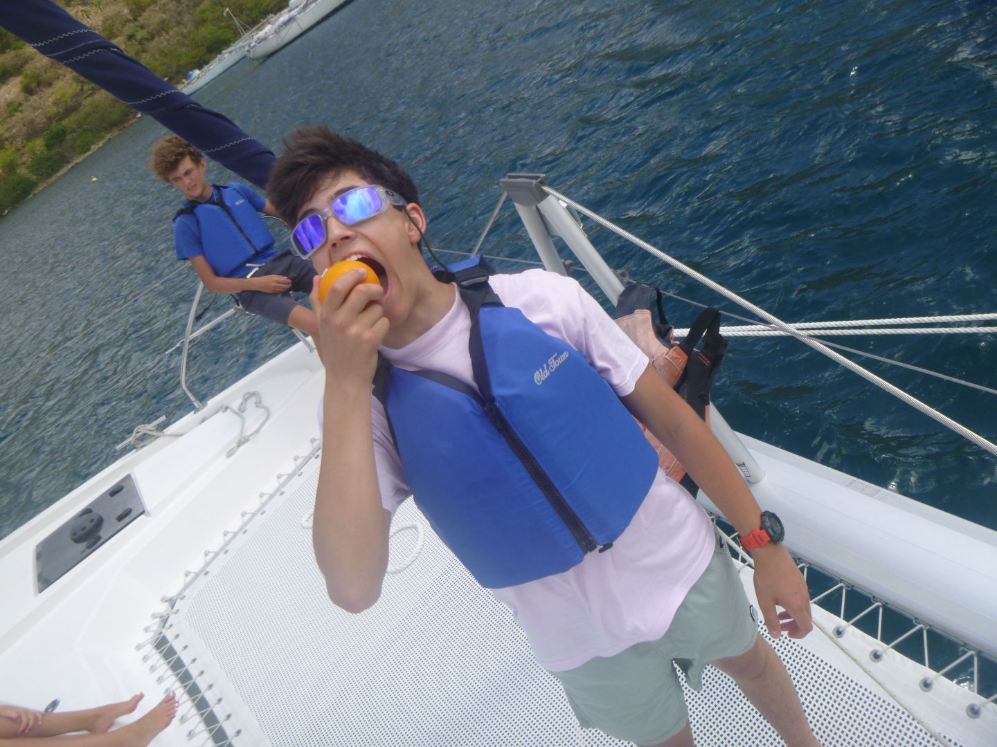 Today we started off by sailing away from the dock to go snorkeling! While we were sailing, most of us were sitting on the trampoline – William and Lulu got soaked from the waves, splashing them through the tramp. Because I was skipper today, I (Teddy) was able to steer the boat. After a hardy lunch, we began our swim test. After William lapped everybody, we started our treading water/float test. Finn surpassed expectations by swimming with his hands in the air for the entirety of the ten-minute period. Oskar and Zander were on the opposite side of the spectrum, sneakingly hiding air pockets in their shorts and shirts for optimal buoyancy efficiency.