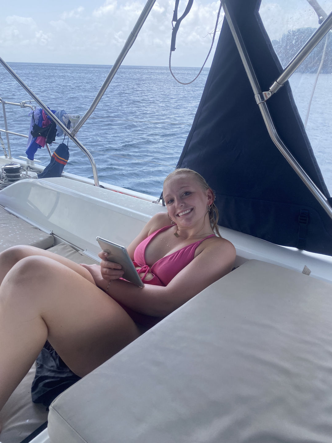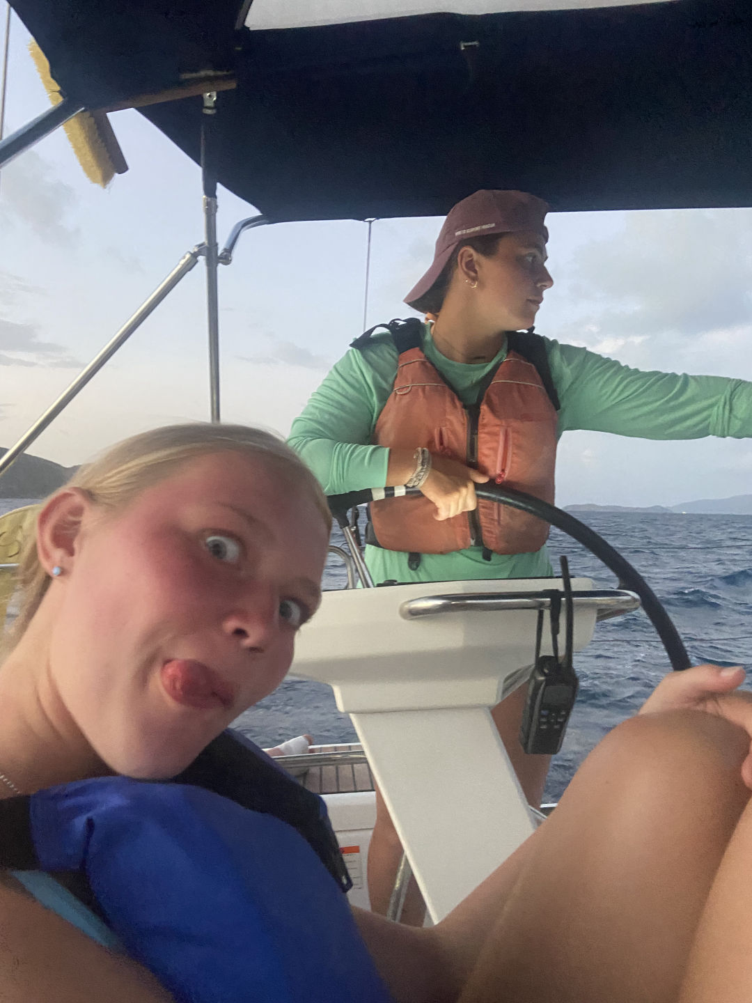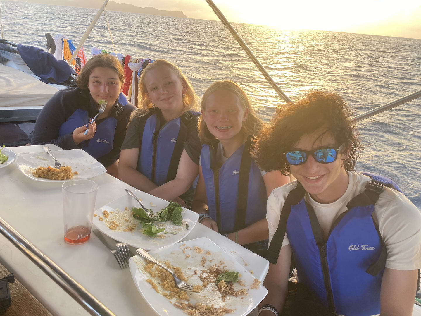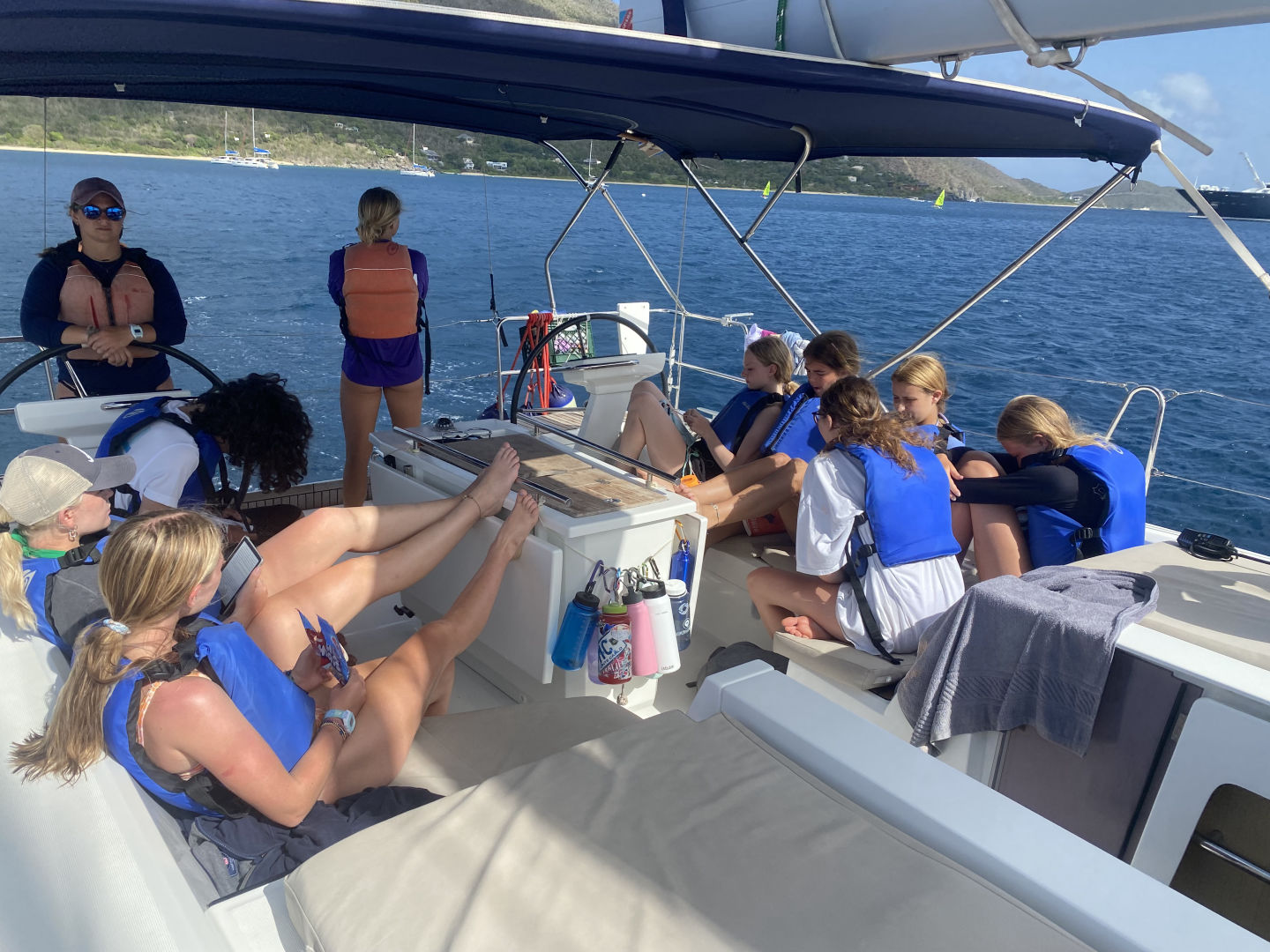 Today had a relaxing start for most of us because we had to wait for Sariah to get stitches in her toe. Sariah had to be shuttled to Spanish Town, and it took some time, but the rest of us made some fun of the time we got. We jumped off the side of the boat to swim, nap, read, and snack a little. After Sariah returned all better from the clinic, we were able to set sail to the Dog Islands to snorkel. Leo, Will, and Zaver found many fish and rocks, while Peyton, Thea, and Chloe saw coral that was super colorful. While Lina and Sariah were hanging out on the dink above where we snorkeled, they could see a sting ray hovering at the bottom. Not only did we see fish and coral, but we saw flounder, squid, and a conch shell with a huge hermit crab living inside of it. Once we returned to the monohull and dinner was finished, we were able to set sail and eat underway. The sunset behind us, as we sailed, was beautiful. We are now on a mooring ball where we will spend the rest of the night. Lily and Kiera are currently tossing around a towel and making jokes with the rest of the girls on the couch below deck, and we are about to squeeze and go to bed. Almost halfway done :(.