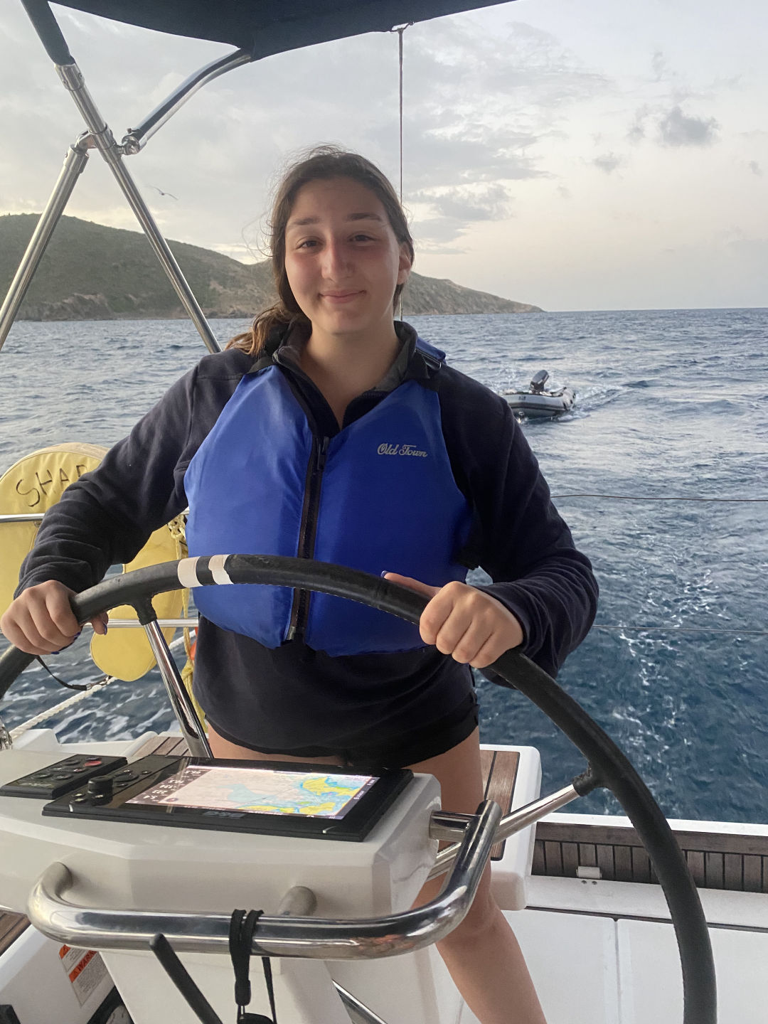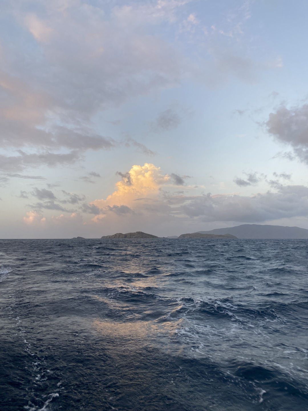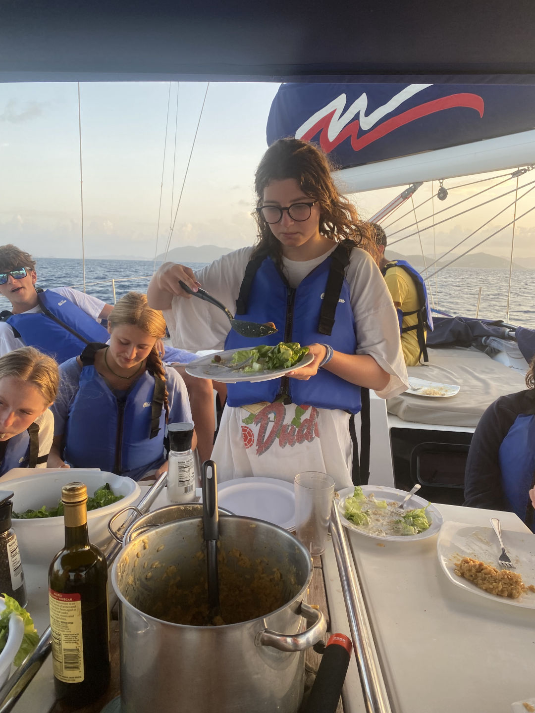 Today had a relaxing start for most of us because we had to wait for Sariah to get stitches in her toe. Sariah had to be shuttled to Spanish Town, and it took some time, but the rest of us made some fun of the time we got. We jumped off the side of the boat to swim, nap, read, and snack a little. After Sariah returned all better from the clinic, we were able to set sail to the Dog Islands to snorkel. Leo, Will, and Zaver found many fish and rocks, while Peyton, Thea, and Chloe saw coral that was super colorful. While Lina and Sariah were hanging out on the dink above where we snorkeled, they could see a sting ray hovering at the bottom. Not only did we see fish and coral, but we saw flounder, squid, and a conch shell with a huge hermit crab living inside of it. Once we returned to the monohull and dinner was finished, we were able to set sail and eat underway. The sunset behind us, as we sailed, was beautiful. We are now on a mooring ball where we will spend the rest of the night. Lily and Kiera are currently tossing around a towel and making jokes with the rest of the girls on the couch below deck, and we are about to squeeze and go to bed. Almost halfway done :(.