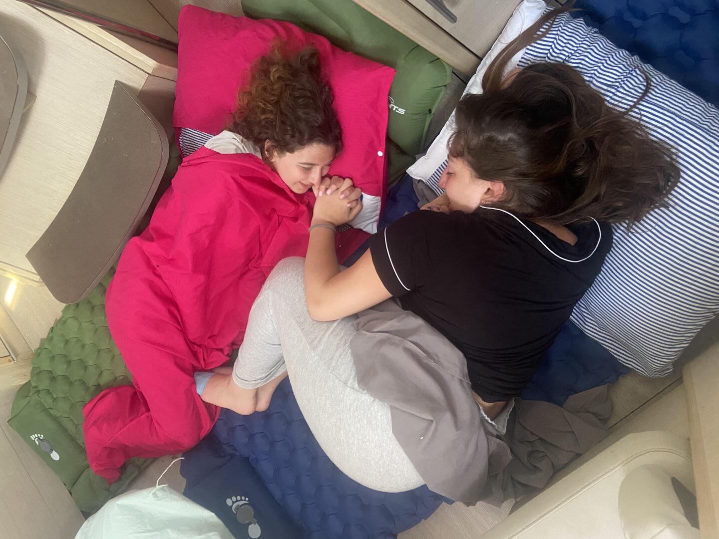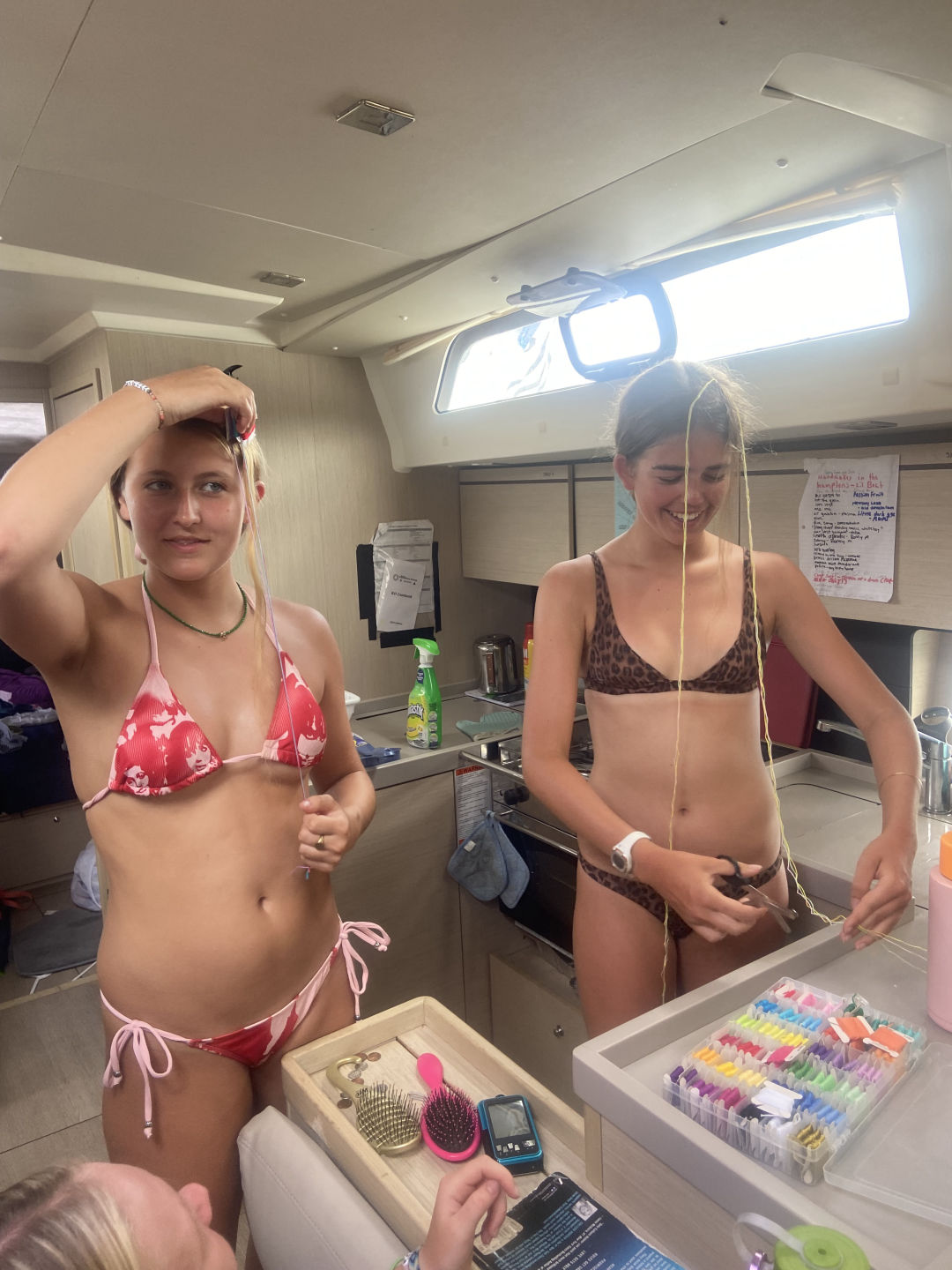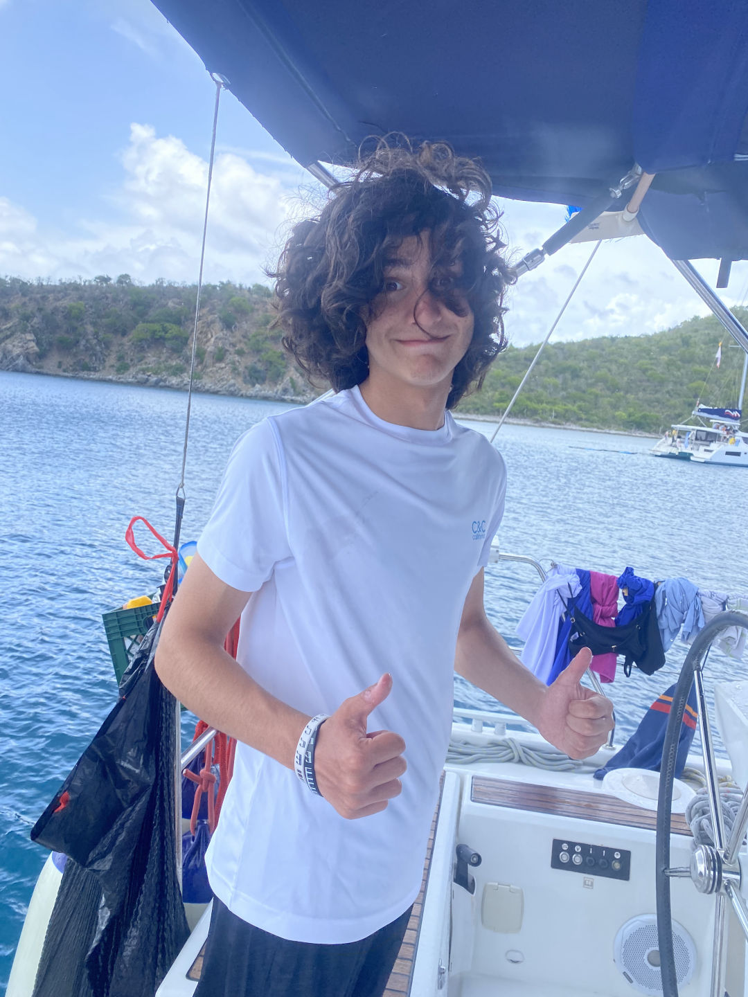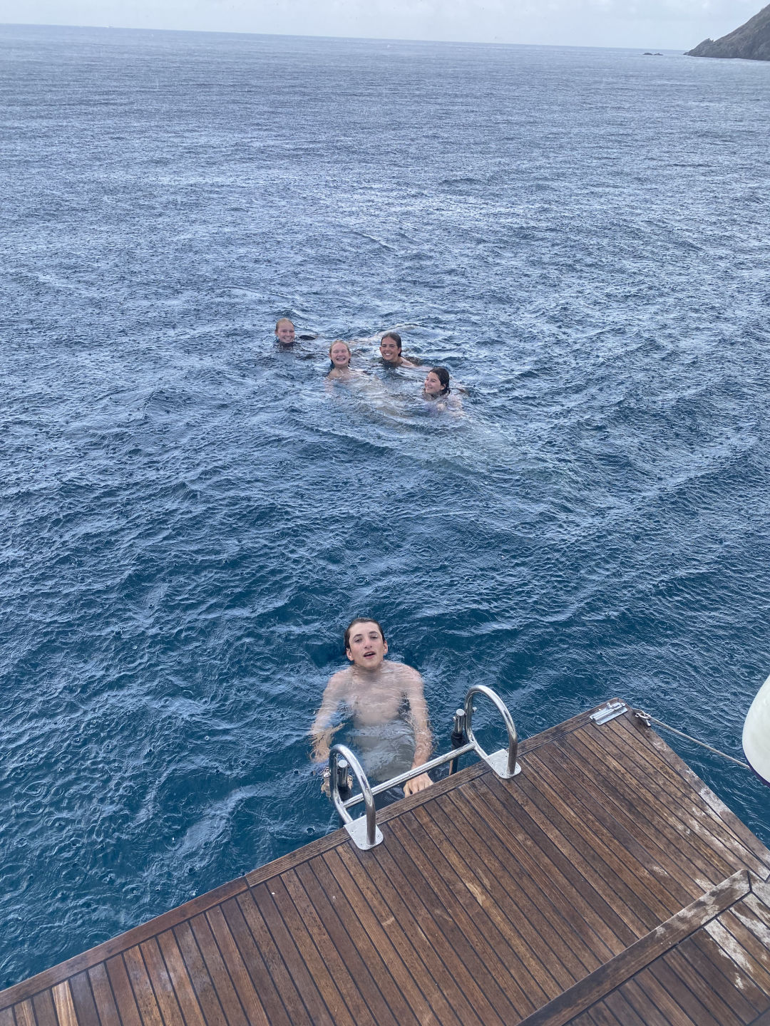 Today had a relaxing start for most of us because we had to wait for Sariah to get stitches in her toe. Sariah had to be shuttled to Spanish Town, and it took some time, but the rest of us made some fun of the time we got. We jumped off the side of the boat to swim, nap, read, and snack a little. After Sariah returned all better from the clinic, we were able to set sail to the Dog Islands to snorkel. Leo, Will, and Zaver found many fish and rocks, while Peyton, Thea, and Chloe saw coral that was super colorful. While Lina and Sariah were hanging out on the dink above where we snorkeled, they could see a sting ray hovering at the bottom. Not only did we see fish and coral, but we saw flounder, squid, and a conch shell with a huge hermit crab living inside of it. Once we returned to the monohull and dinner was finished, we were able to set sail and eat underway. The sunset behind us, as we sailed, was beautiful. We are now on a mooring ball where we will spend the rest of the night. Lily and Kiera are currently tossing around a towel and making jokes with the rest of the girls on the couch below deck, and we are about to squeeze and go to bed. Almost halfway done :(.