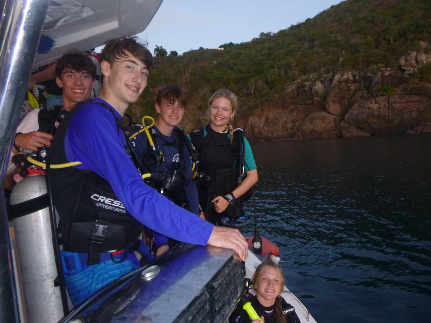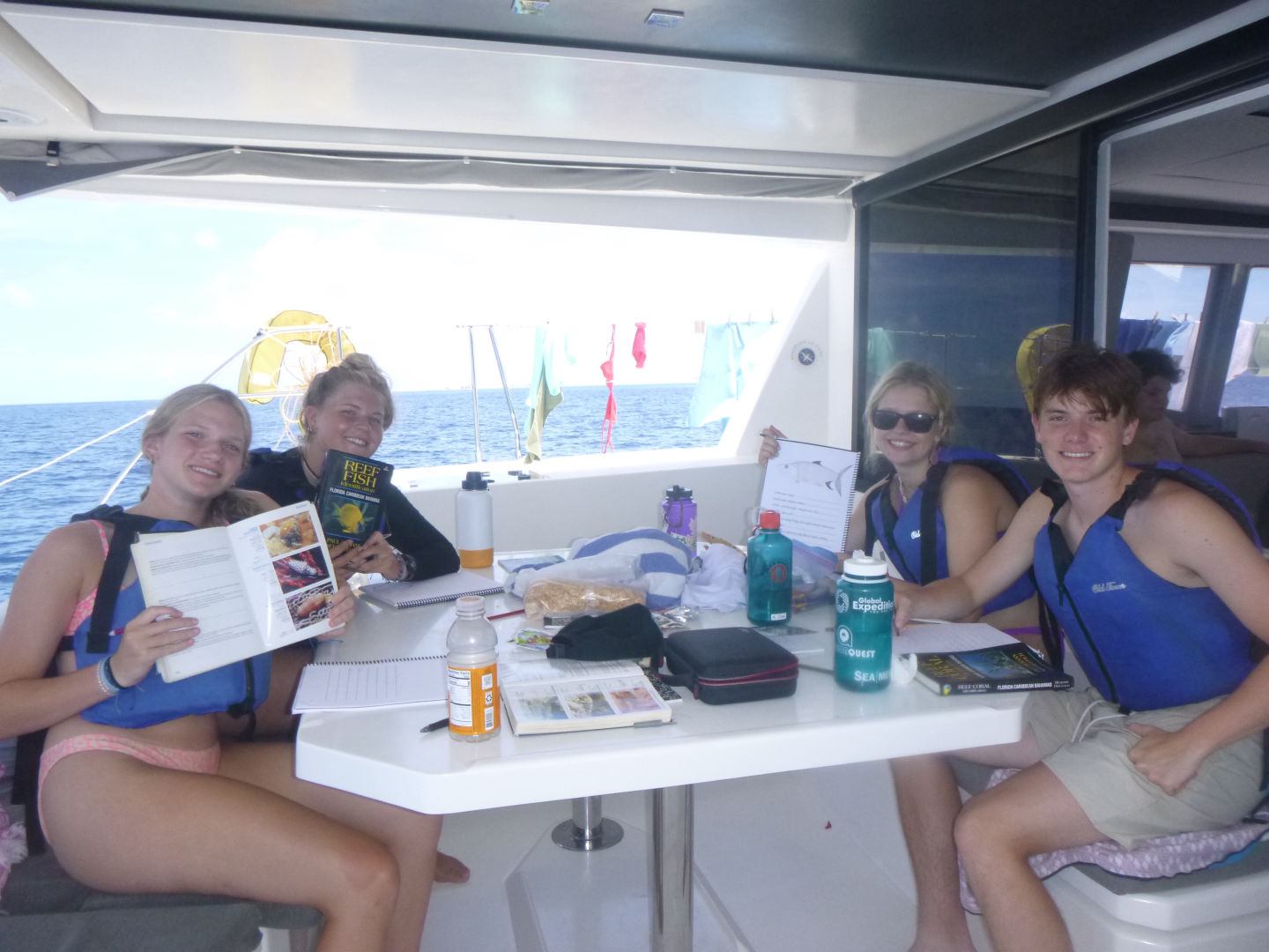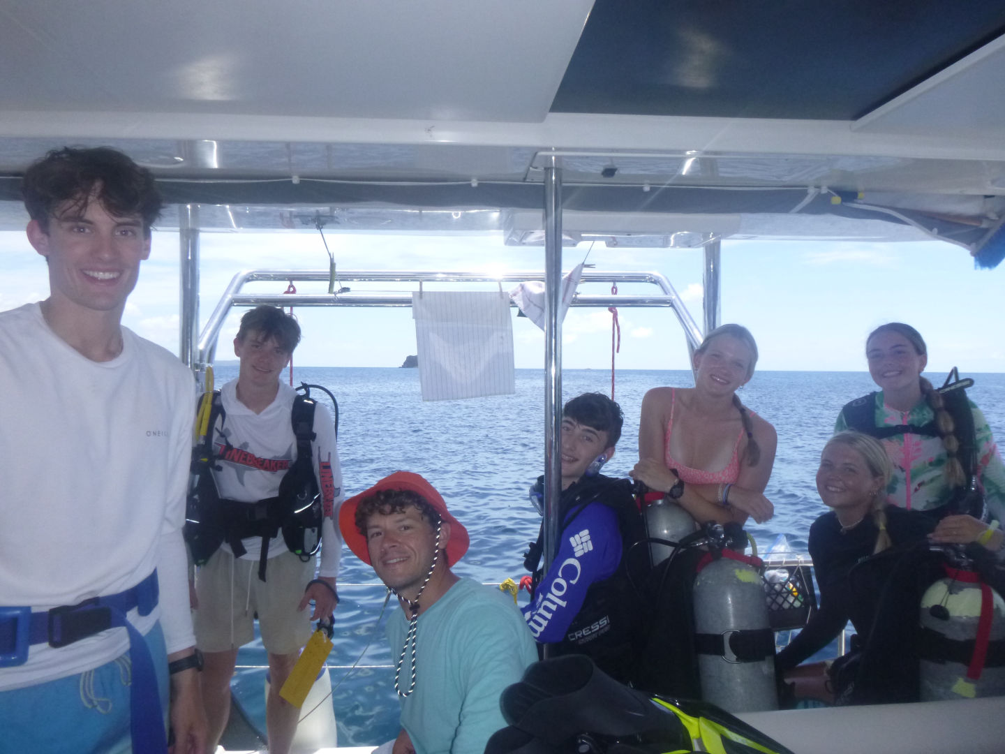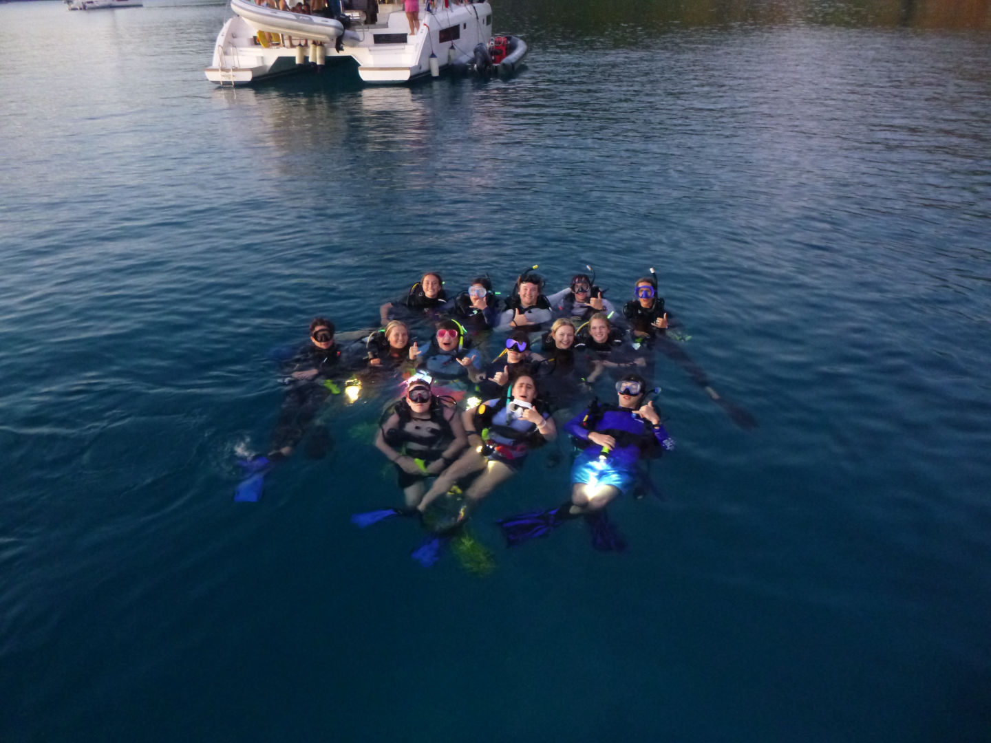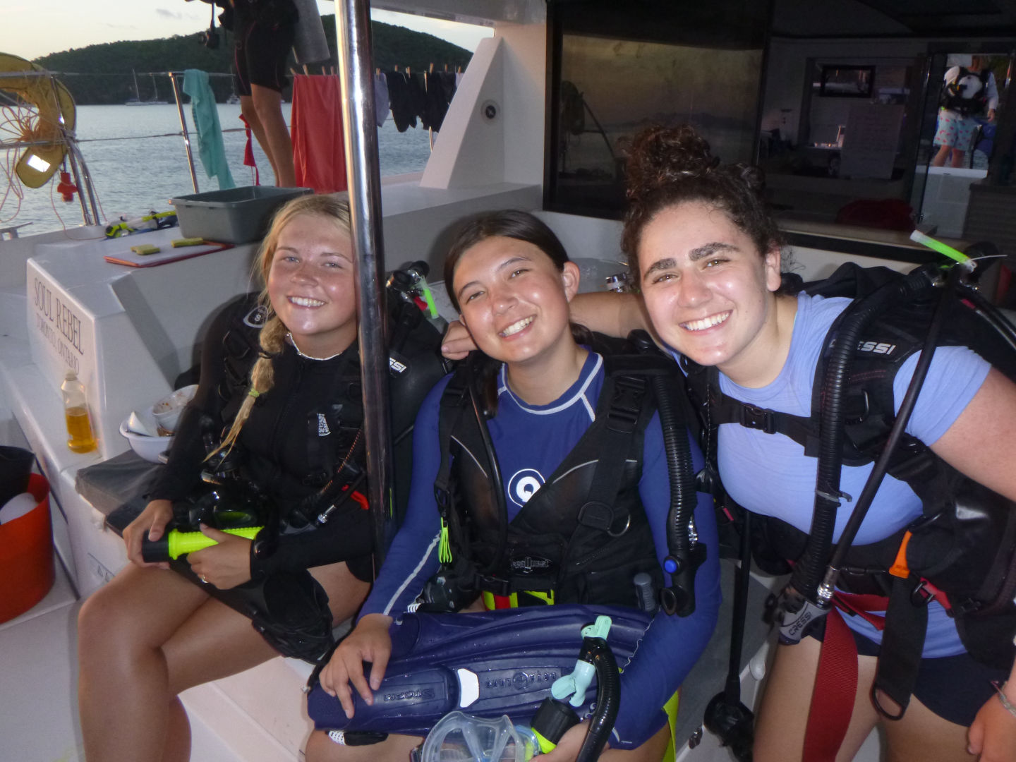 Today was the 12th day of our boat adventure, and it started with the usual early morning wake-up, an enthusiastic, smiley “good morning” from Alli, and a sleepy groan from Dylan, Caleb, and Jack. With the morning sun shining bright, stomachs full of cereal, and PFDs on, we left Marina Cay and headed for Mountain Point for lunchtime. Kyler, Jack, Moorea, Alexis, Tyler M, and I sat around the table and discussed our exciting upcoming Dolphin projects that we will be collecting data for in the next coming days. After, Dylan, Brian, and Caleb were boated off to a neighboring boat to complete their second wreck dive while the dolphins went down for yet another seamless underwater naturalist dive, where we took down slates to record any human impacts we saw on the reefs and the relationships between sea life for later discussion. We sat down for a big bowl of noodles cooked by our chefs of the day: Dylan and Alli. A big group nap in the sun was in order while our trusty skipper Joe took the sails out for a peaceful sail. We arrived in Muskmelon, where Tyler H and I hooked a secure mooring line, and I finally feel like all of our knot-tying abilities are finally starting to solidify. As a group, we took our fins and snorkels out to have a look at our night dive sight. We got the boat shipshape for a special guest visitor Mike Meighan, the head of Action Quest, better known as the ‘Supreme leader’. We had yet another delicious boat-cooked meal of chili, and I am proud to say that we are almost out of our Franks Red Hot Hot sauce. With lots of the usual uncontrollable laughter caused by jokes cracked by Zack, Caleb, and Tyler H, I started to realize that we were more than halfway done with our boat adventure and how happy I was to be living with these awesome people. Zack, Jack, Tyler H. Alexis, and Brain sat down to wash our grubby dishes, looking out at yet another stunning BVI pink sunset. We set up our dive kits and hopped in the water for our 3rd-night dive, where we saw a unicorn filefish, bridled burrfish, quite a few moray eels, and an octopus. Of course, we had to have a shower dance party with our boat playlist, and Anna cooked us a tray of fresh yummy brownies. Alli, Tyler H., and Zack are now testing the oxygen-dissolving levels of seaweed with Joe with the onboard lab kit for their research project, and we all will soon be setting up for bed, excited for day 13.