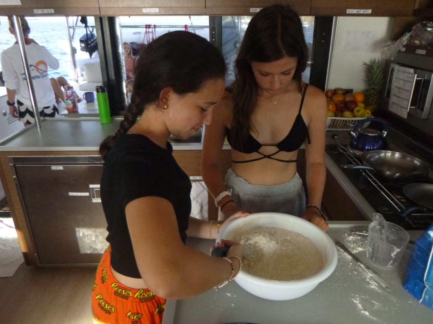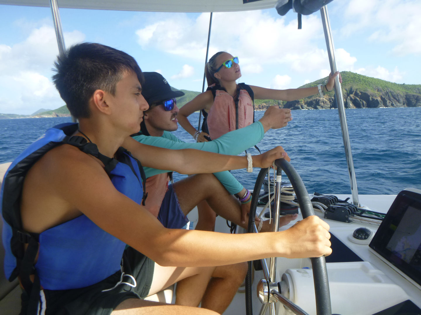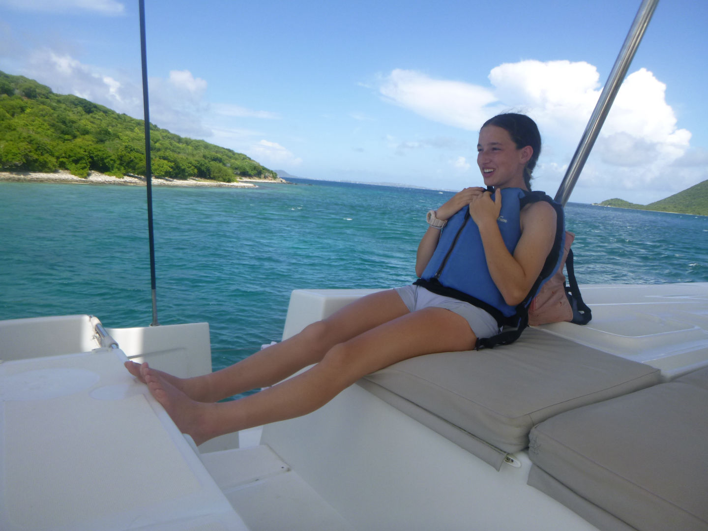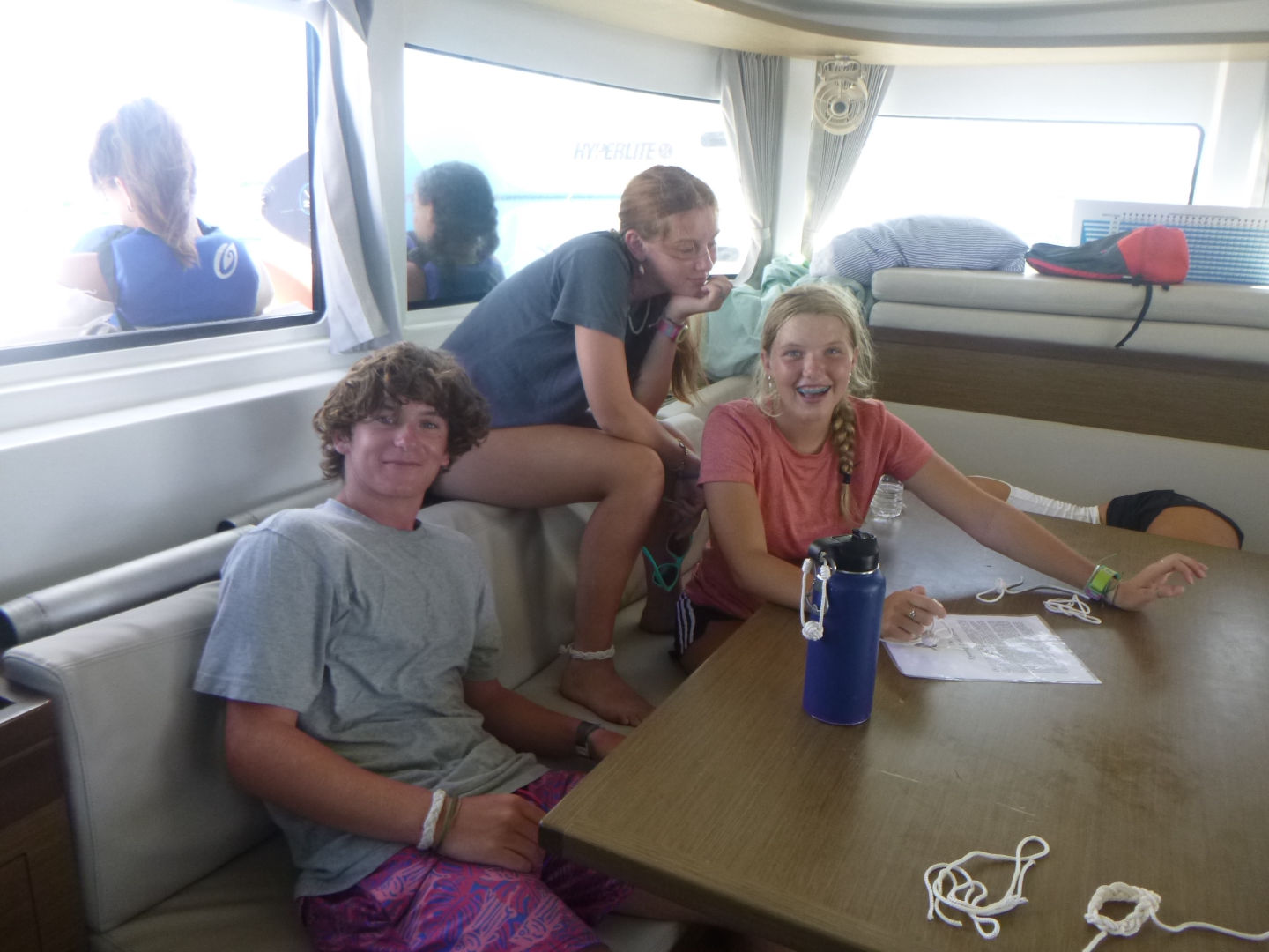 This morning the counselors had a staff meeting at 8 am, so the kids were left on the boat to make pancakes. Maddy and Caroline crushed the pancakes. After breakfast, we got nailed with an egg by Good Times(Another boat in the fleet). We drove to the water dock to replace the water that we finished overnight. After that, we went to Trellis Bay. We were dinghied to the shore. While walking on the beach, Ariana, Macie, Erica, and I found a trampoline on the beach. After multiple amazing tricks and flips, we went to a local art shop. There we bought matching pottery snails. They were named Rhonda(Macie’s), Betty(Ariana), Barbara(Caroline), and Sean(mine). While we were still on the island Maddy(the Driver), Caroline and Bridget(The Hiders), and Anya(The Supervisor, hid five different boat utensils. Before we left the island, Will, Niko, Alex, and Casey waited 2 hours for food at the Loose Mongoose. After that, we all got dinghied back to the boat, where we sailed to Musk Mellon. A ton of jellyfish was in the water during shower time. Hopefully, that will cause an increase in turtles during tomorrow’s dive. After dinner, people discovered their missing utensils and went onto the VHF, hoping to solve the mystery. Beso(Another boat in the fleet that we egged earlier in the day) came onto the VHF and told everyone that they thought it was us, which was basically a declaration of war between us and five other boats. Hopefully, we don’t wake up to a complete mess!