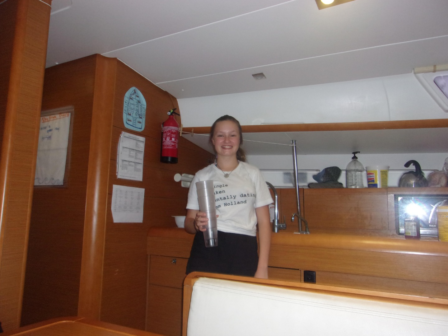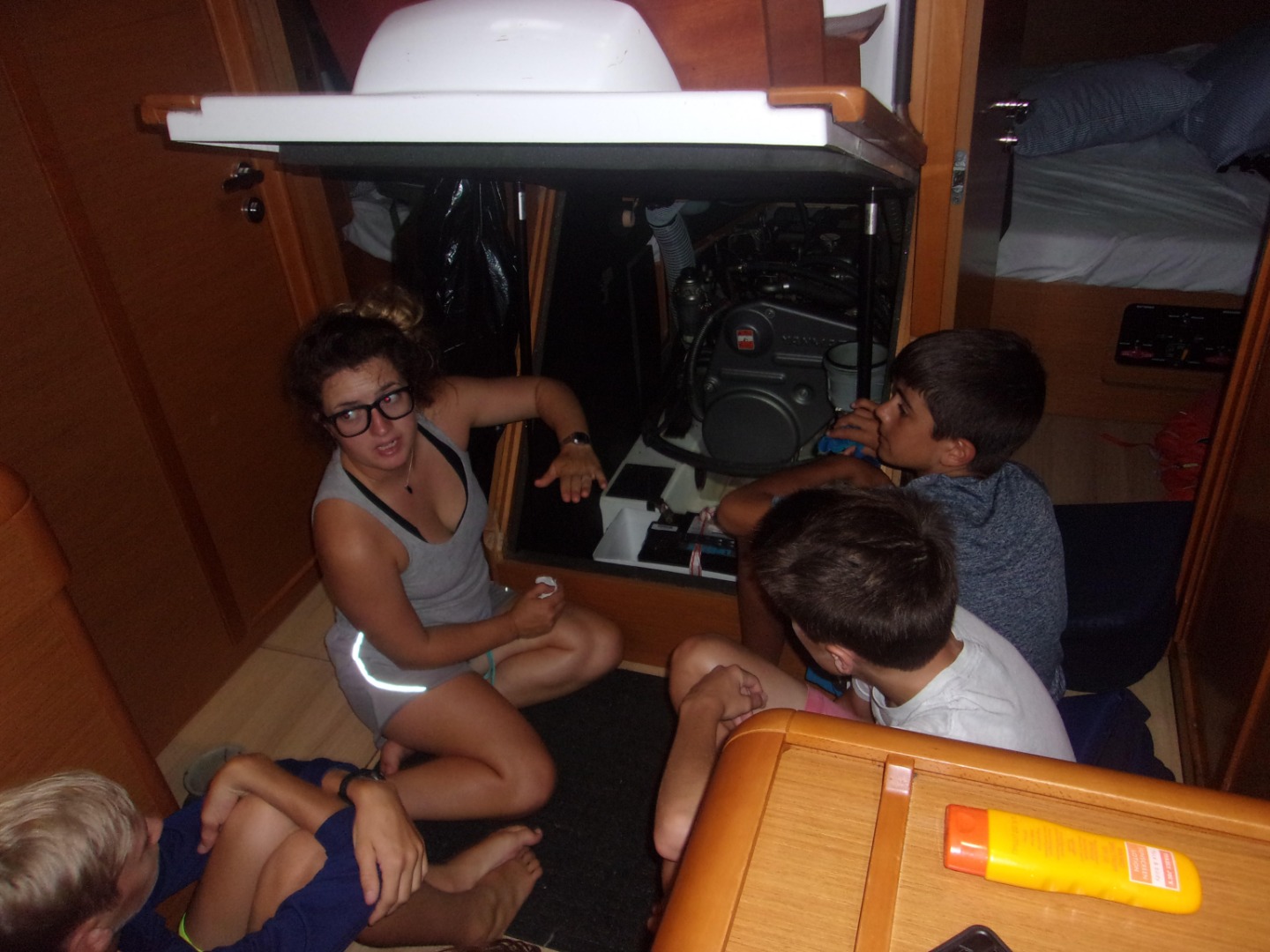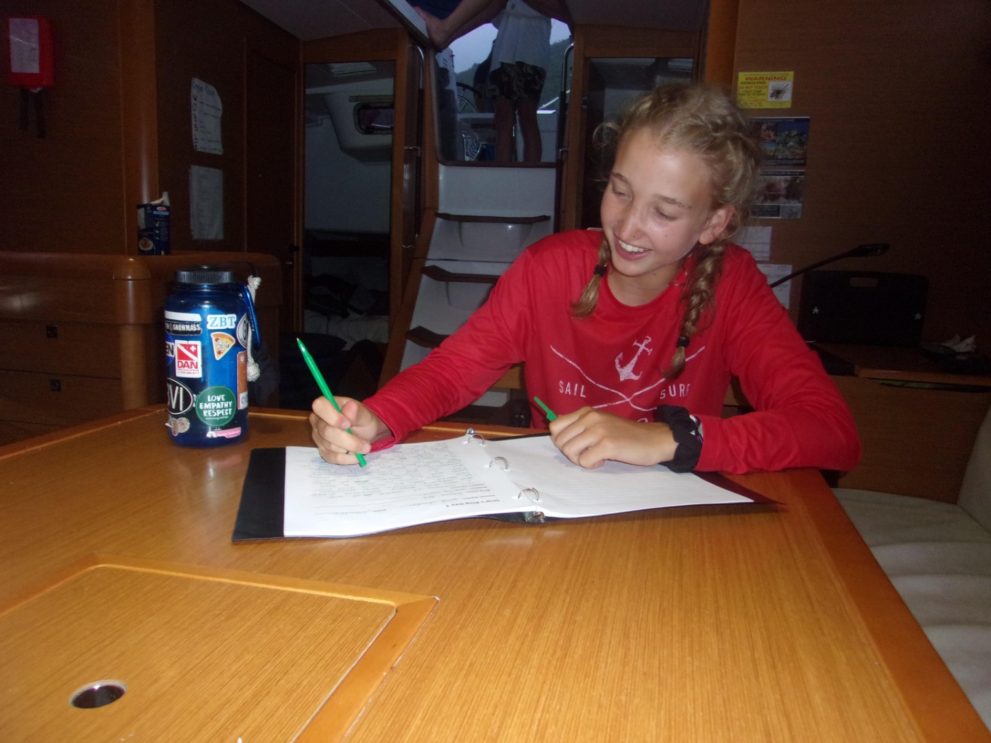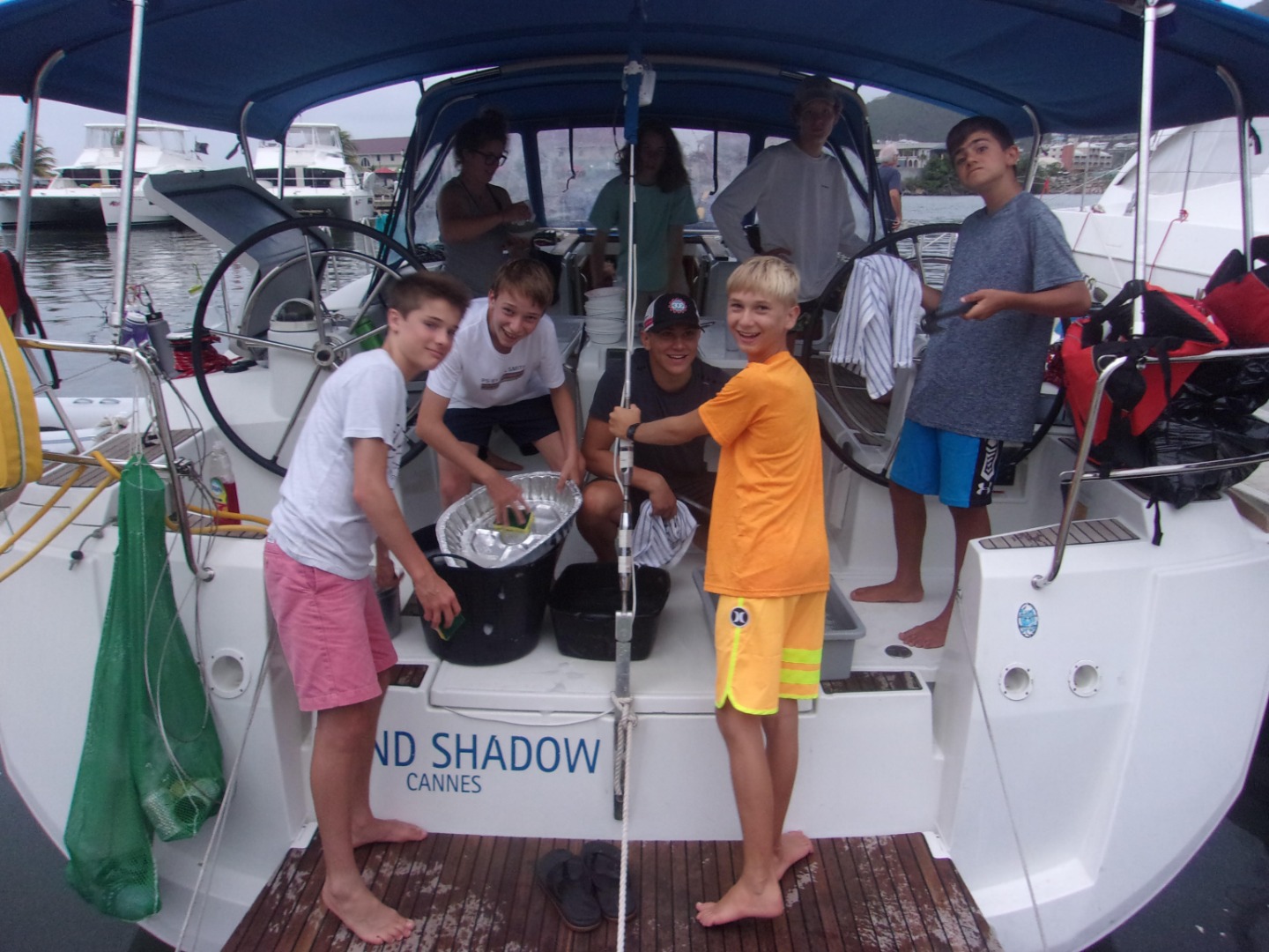 This morning we started with a warm and yummy breakfast of eggs and blueberry muffins. After breakfast, we learned about the engine and then had some time on shore to have lunch and buy snacks. We then had a Minerva sail chat about our passage and how to use charts. Afterward, the crew of Wind Shadow played some team building games like Human Knot and Vortex. It began to rain, so we ran to the cover of the boat to pay Mafia. After some rounds, it was time for dinner, which was pasta & alfredo sauce. For the night, we stayed at the Moorings dock in order to finish up some final preparations before we leave for the Leeward Islands. Also at night, we have a sail chat. Tomorrow we are planning for an early departure to Savanna Bay. Today was perfect for relaxing before we head off on our own big adventure! : )