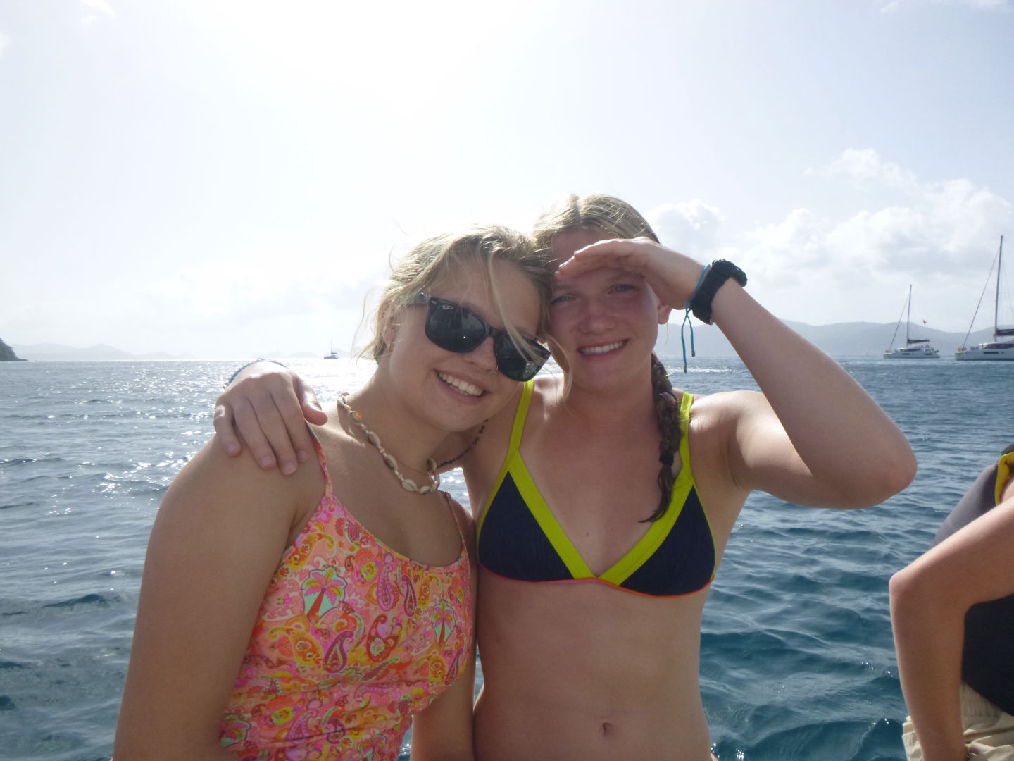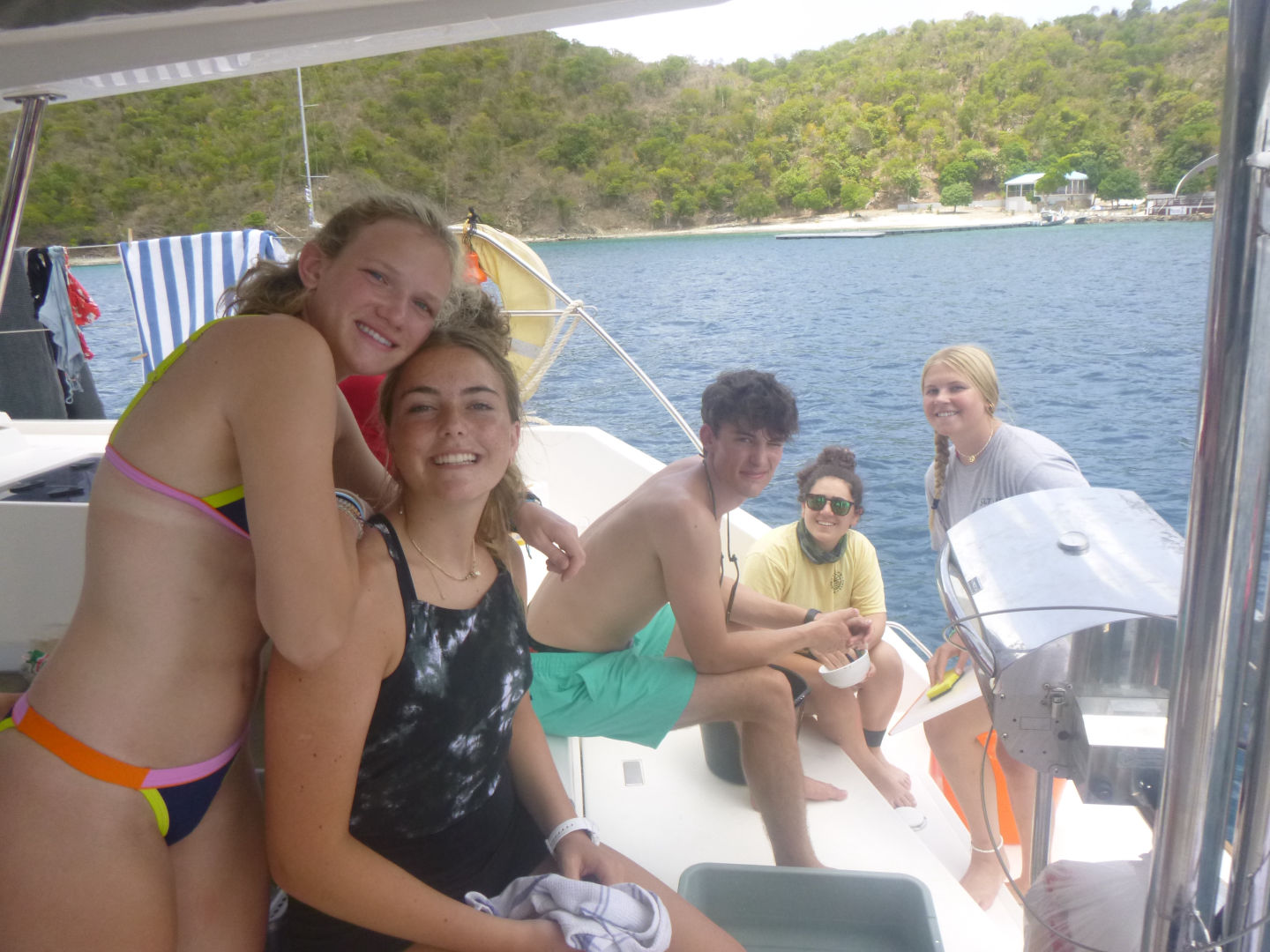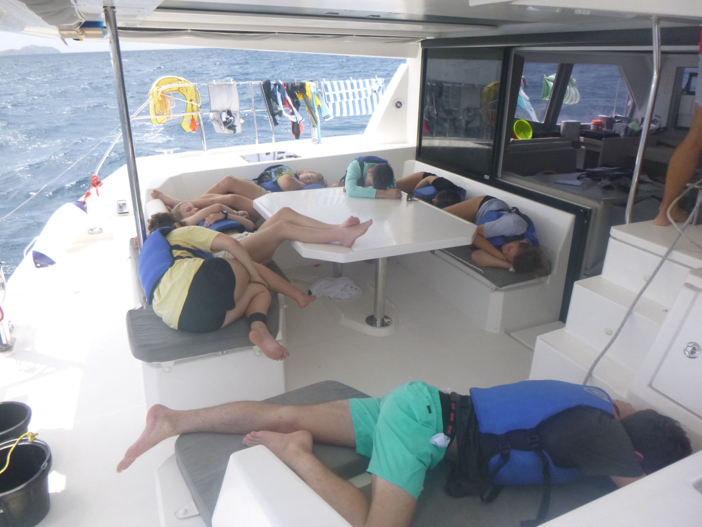 Hello! Today when we woke up in Leverick Bay, everyone was GASSED. Luckily, we had a 3.5-hour long sail to Great Harbor Bay, and Caleb, Kyler, Scarlett, Dylan, Tyler (Aussie), Tyler (Florida), Brian, Alli, Alexis, and Zach all took a SUPA NAP (see flick below). Everyone was just piled on top of each other, but somehow Dylan got a whole bench to himself. When we woke up, the Neptunes did their deep water dive and went almost 90 feet down. They saw an arrow crab, thought it was a spider, freaked out, then realized it was an arrow crab, then calmed down. The Dolphins did their first underwater photography dive and used AQ’s really awesome camera equipment. They got really amazing pictures of coral, fish, and each other. When everyone got back, we went knee boarding (wakeboarding on your knees)!! Both Tylers and Jack had SUPA WIPEOUTS, but Moorea, Caleb, and Zack SUPA SLAYED. After the knee boarding, we had a Mexican night with super yummy tacos/burritos. Then we listened to music and had lots of fun during dishy time, then we all hung out and went to bed.